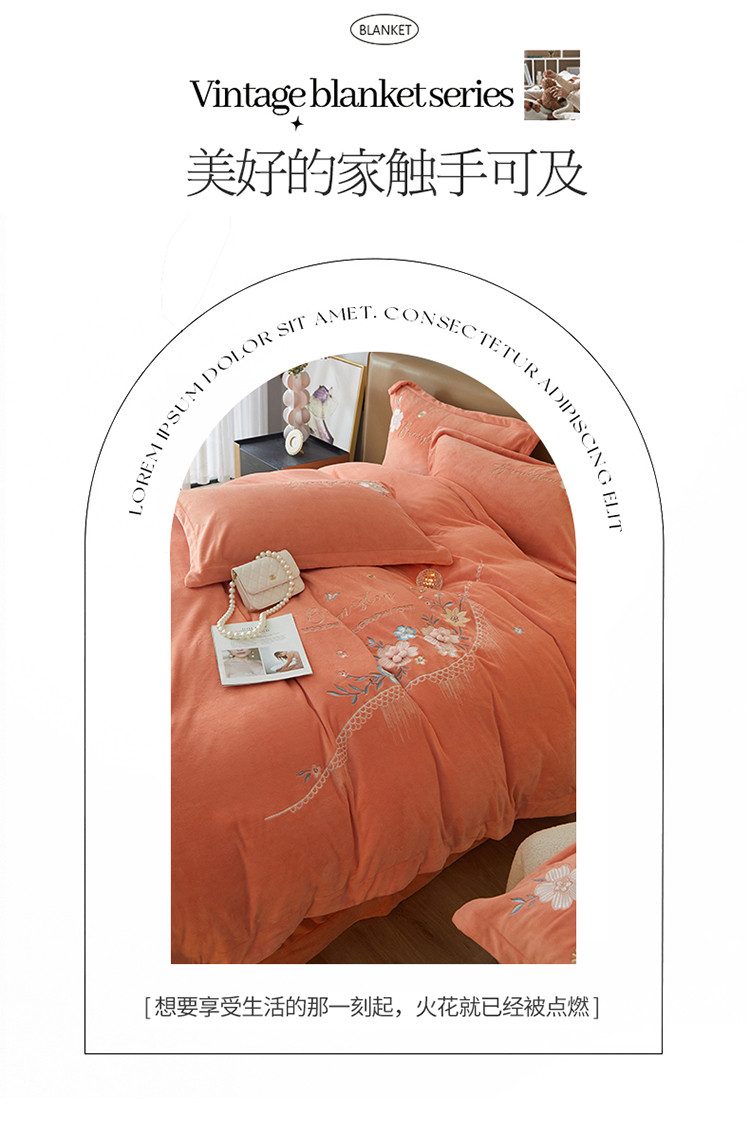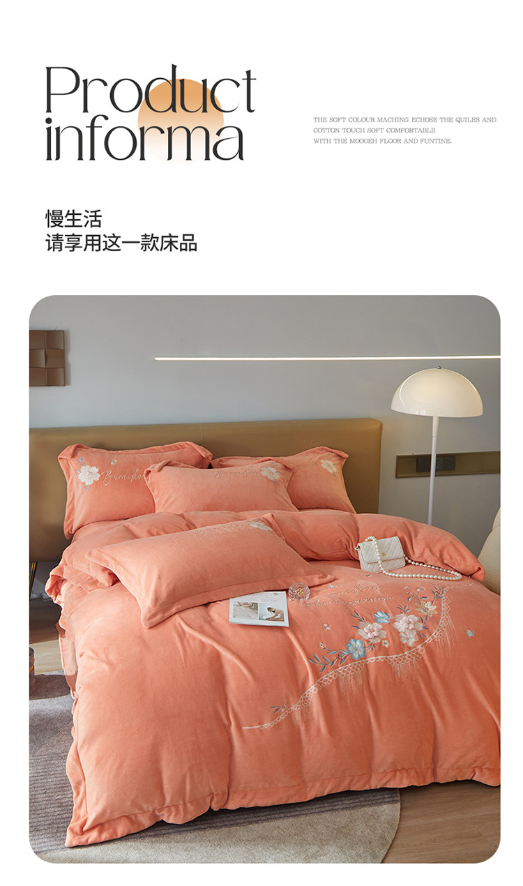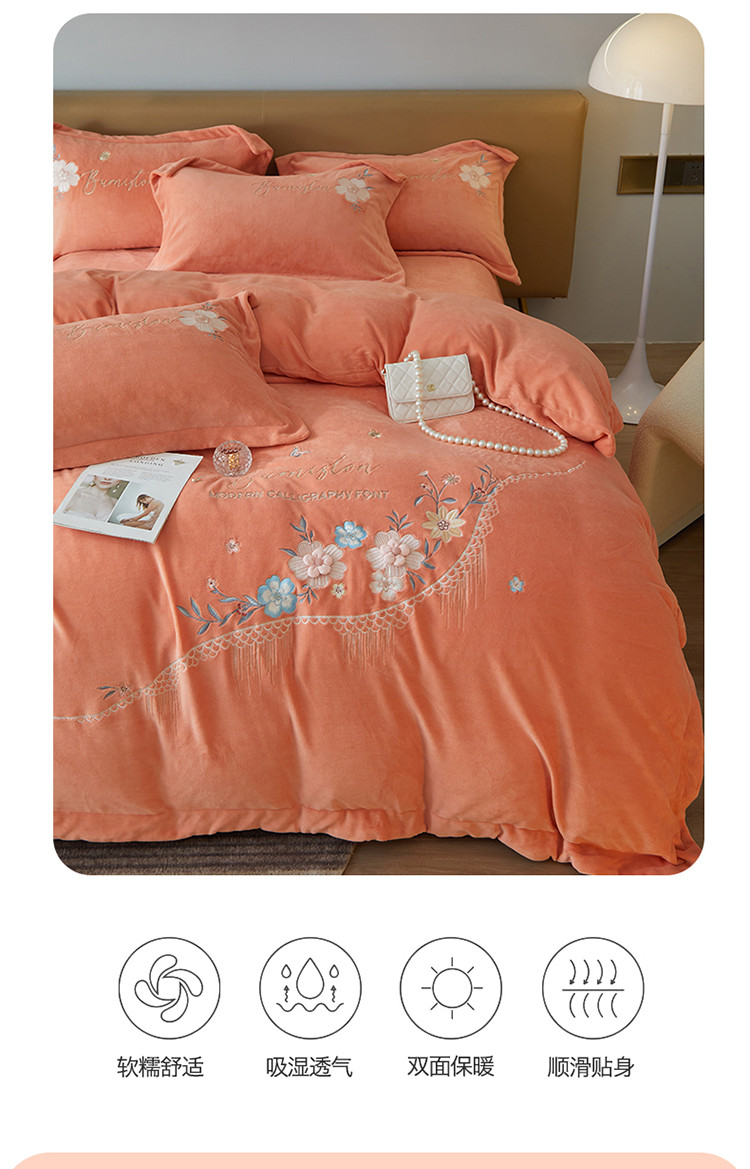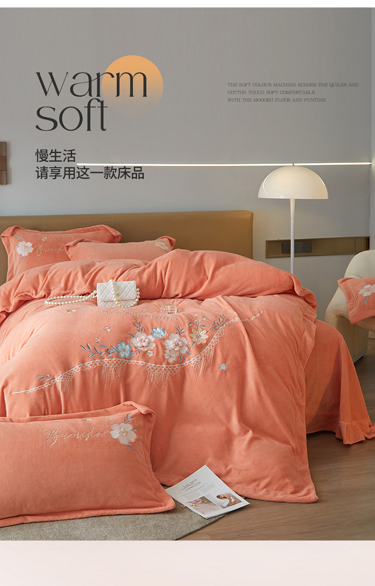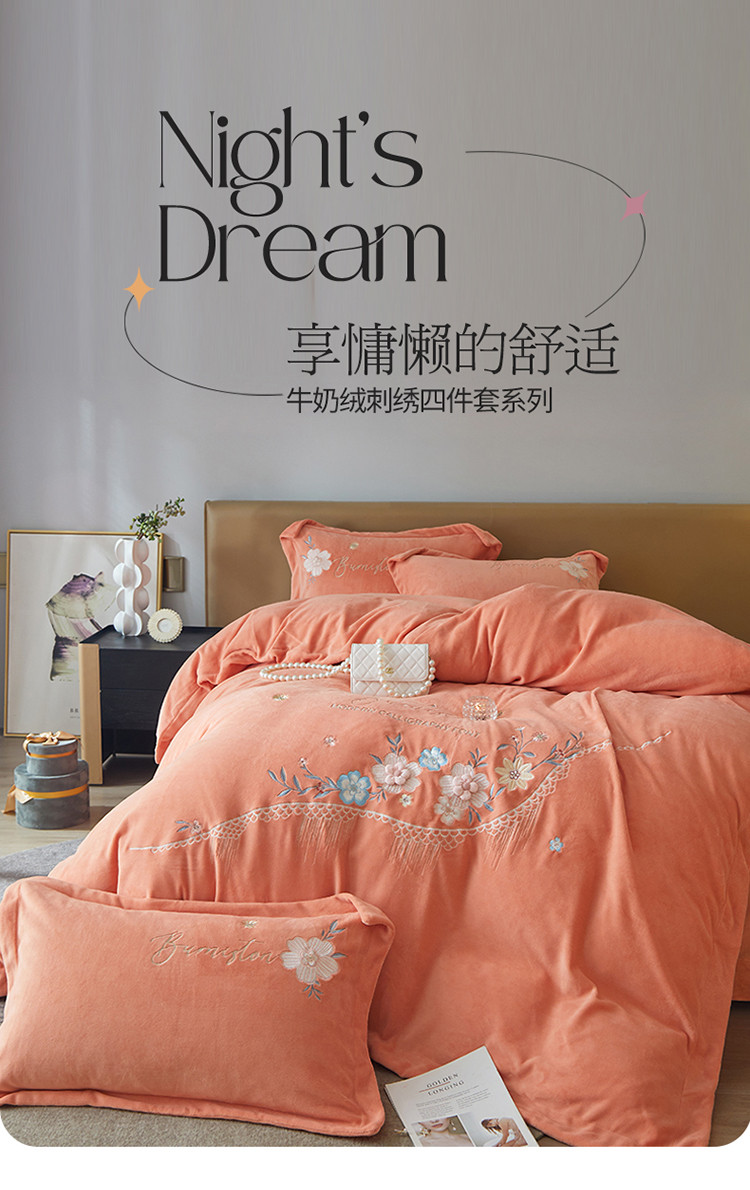商品名称:名品优仓 新款230g牛奶绒刺绣四件套-贝拉花园 橘色
