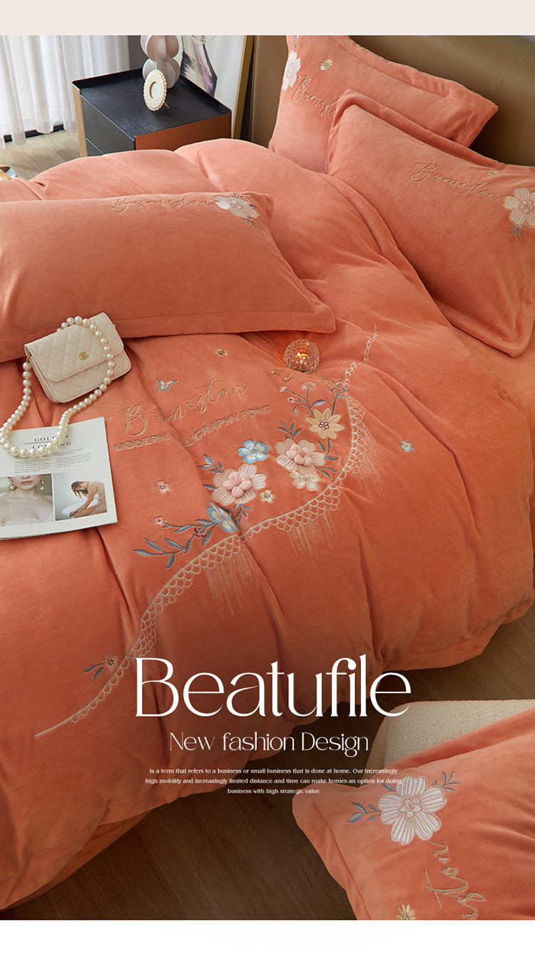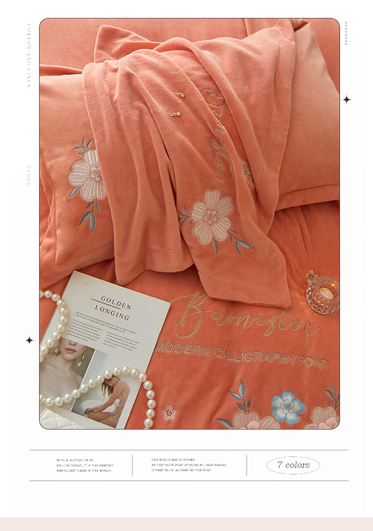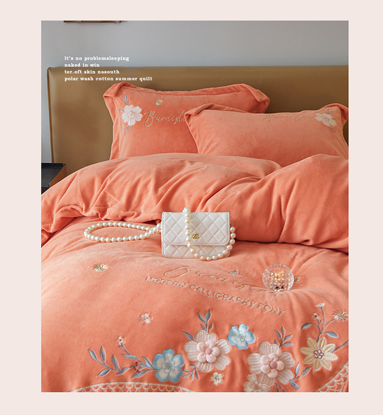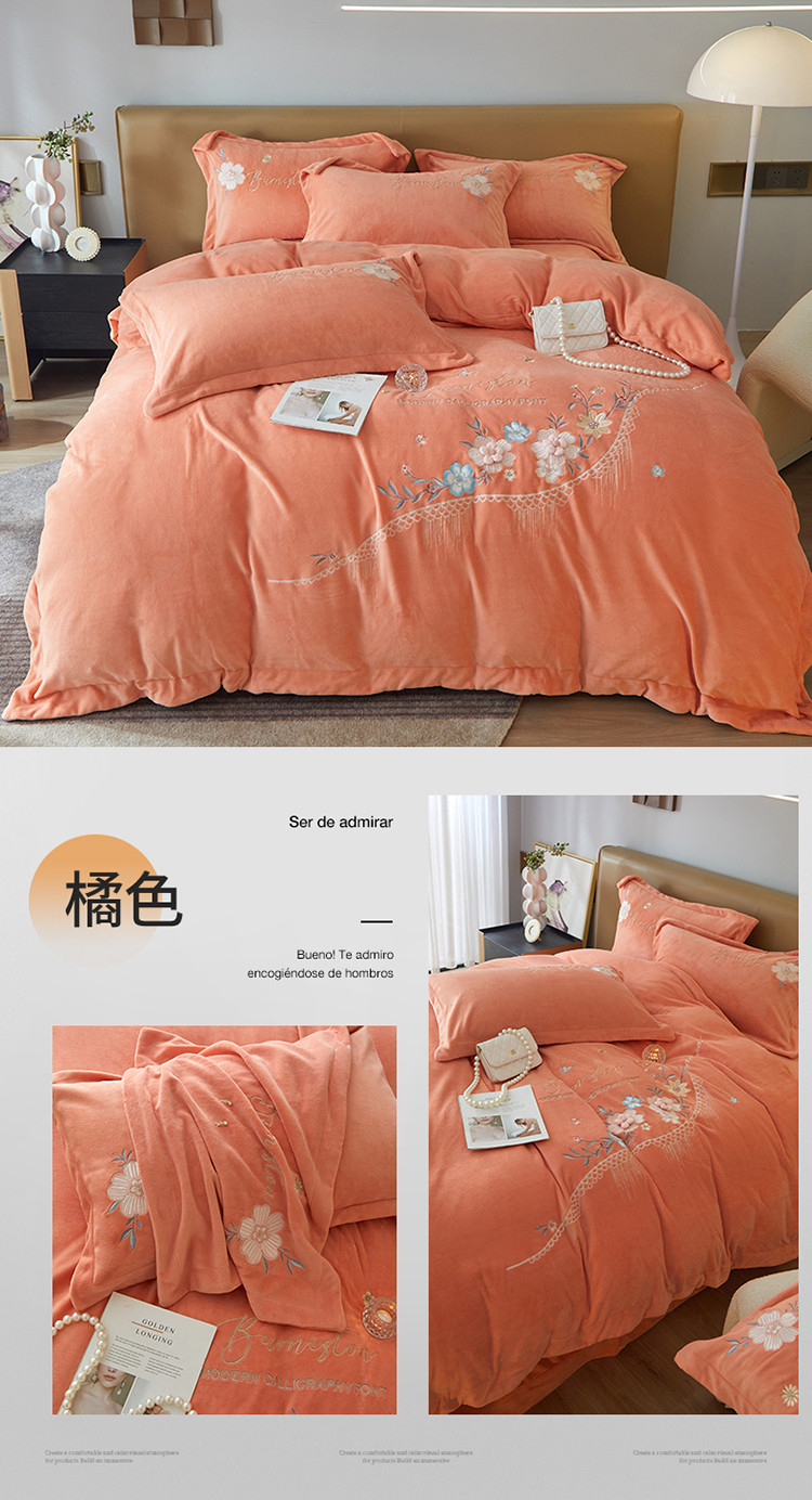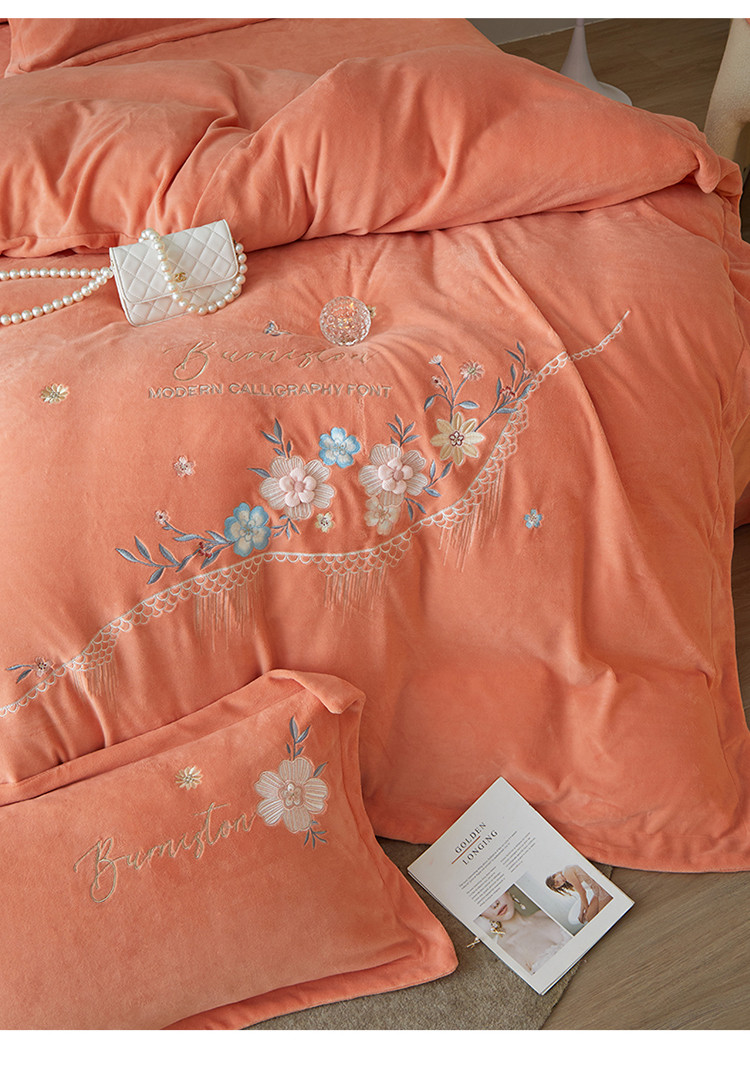 名品优仓 新款230g牛奶绒刺绣四件套-贝拉花园 橘色
