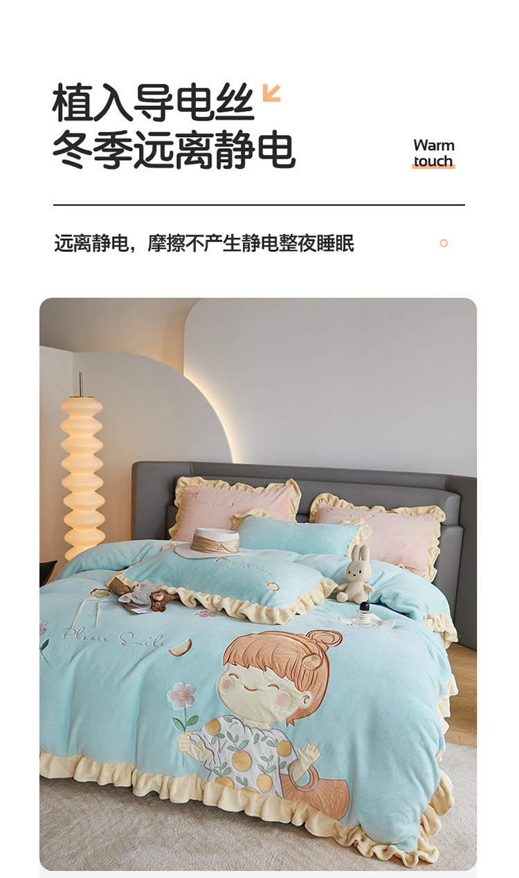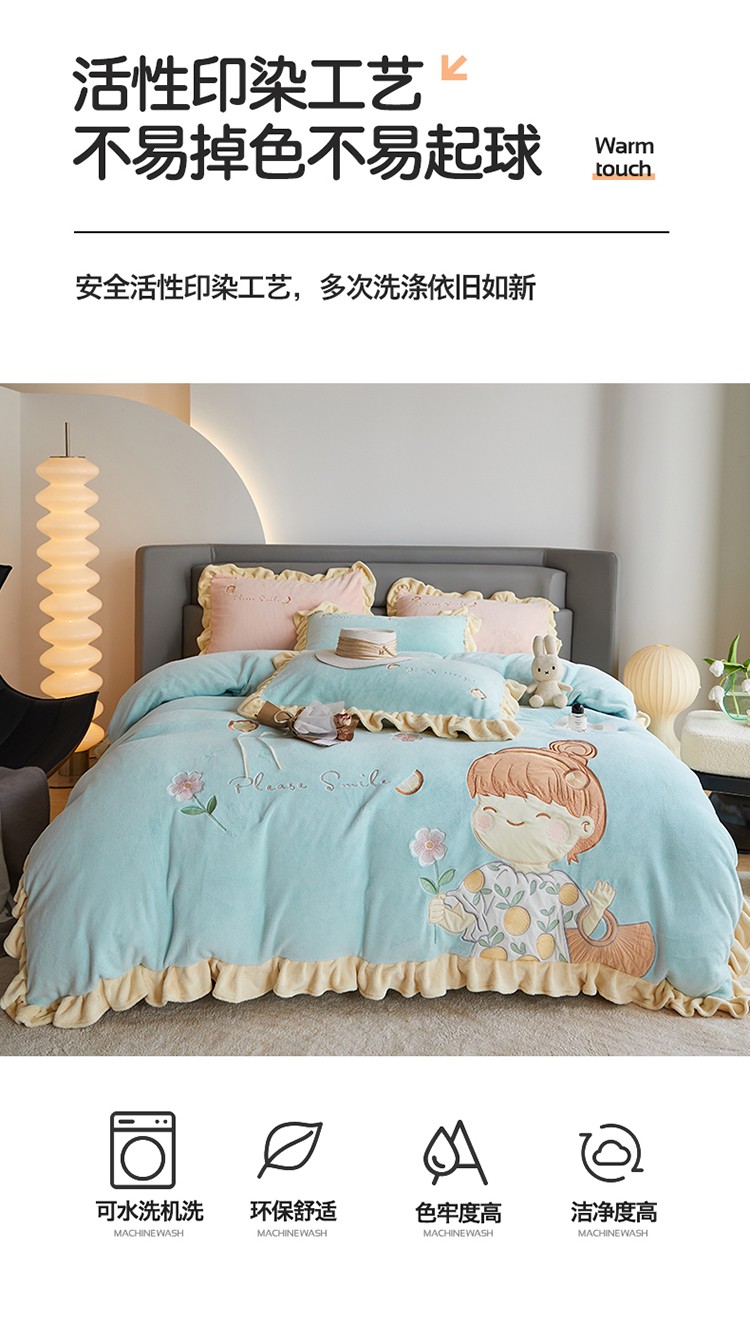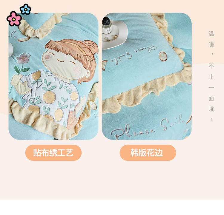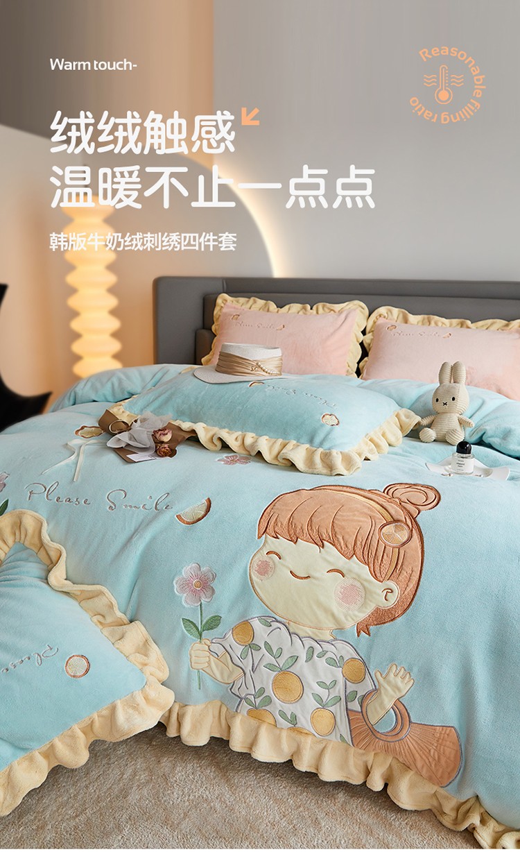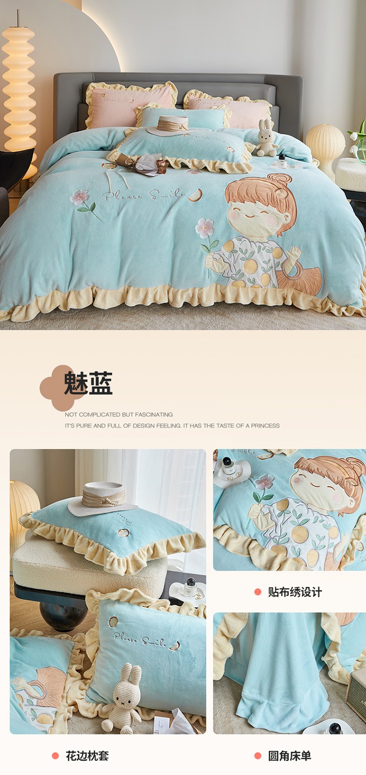 商品名称:名品优仓2022新款230g牛奶绒刺绣贴布绣四件套-可爱的你 魅蓝