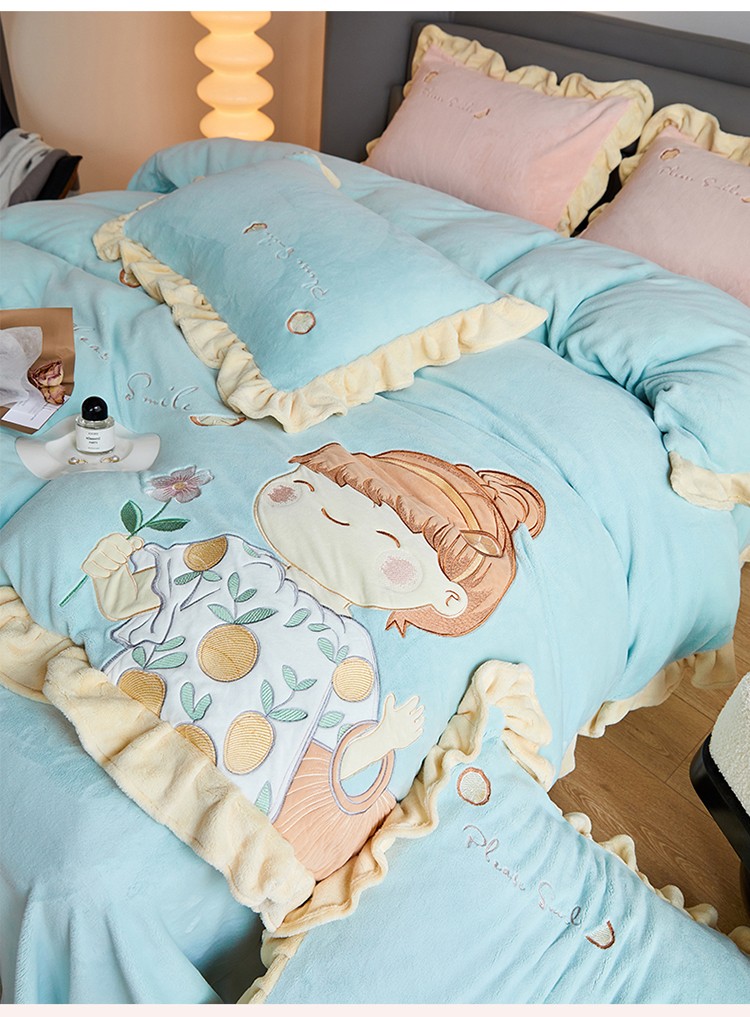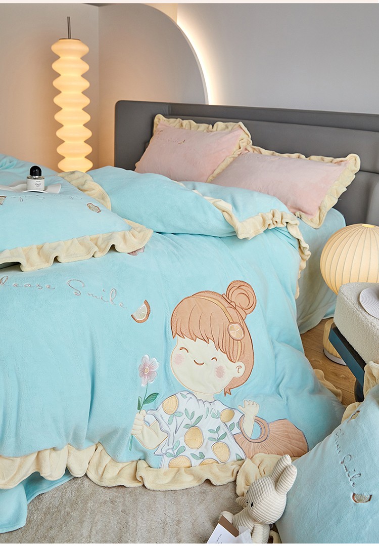 名品优仓2022新款230g牛奶绒刺绣贴布绣四件套-可爱的你 魅蓝