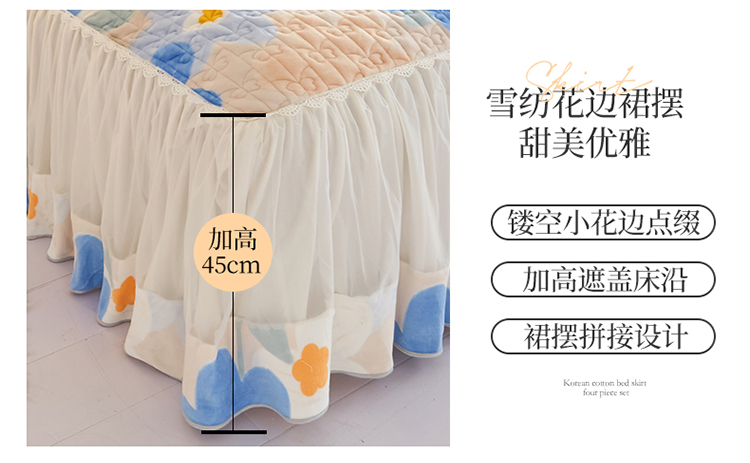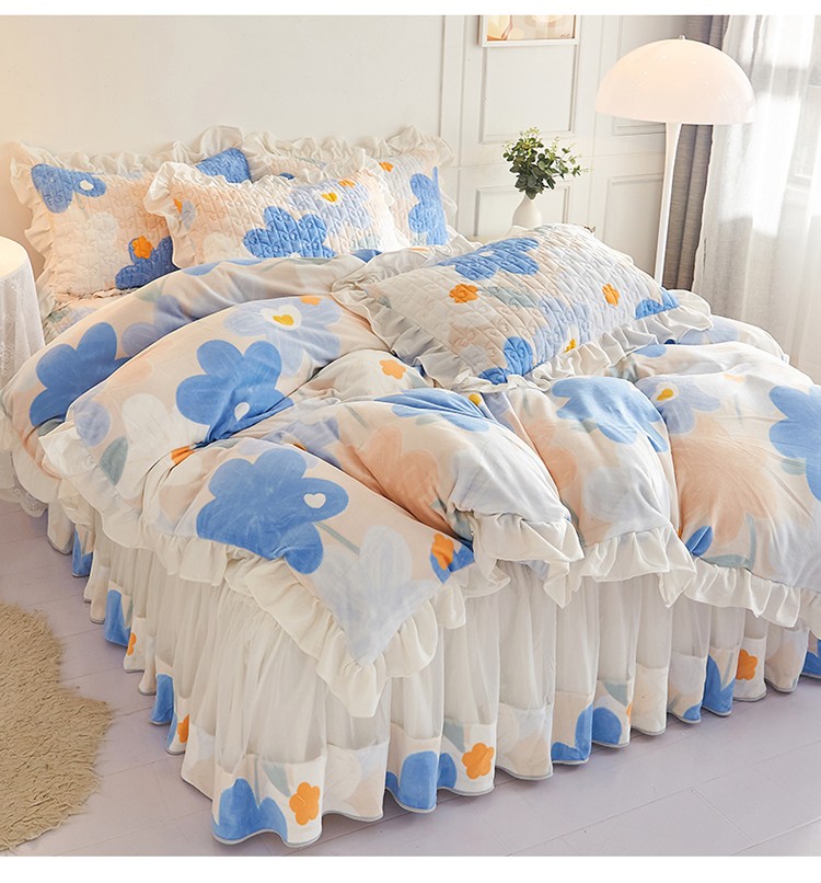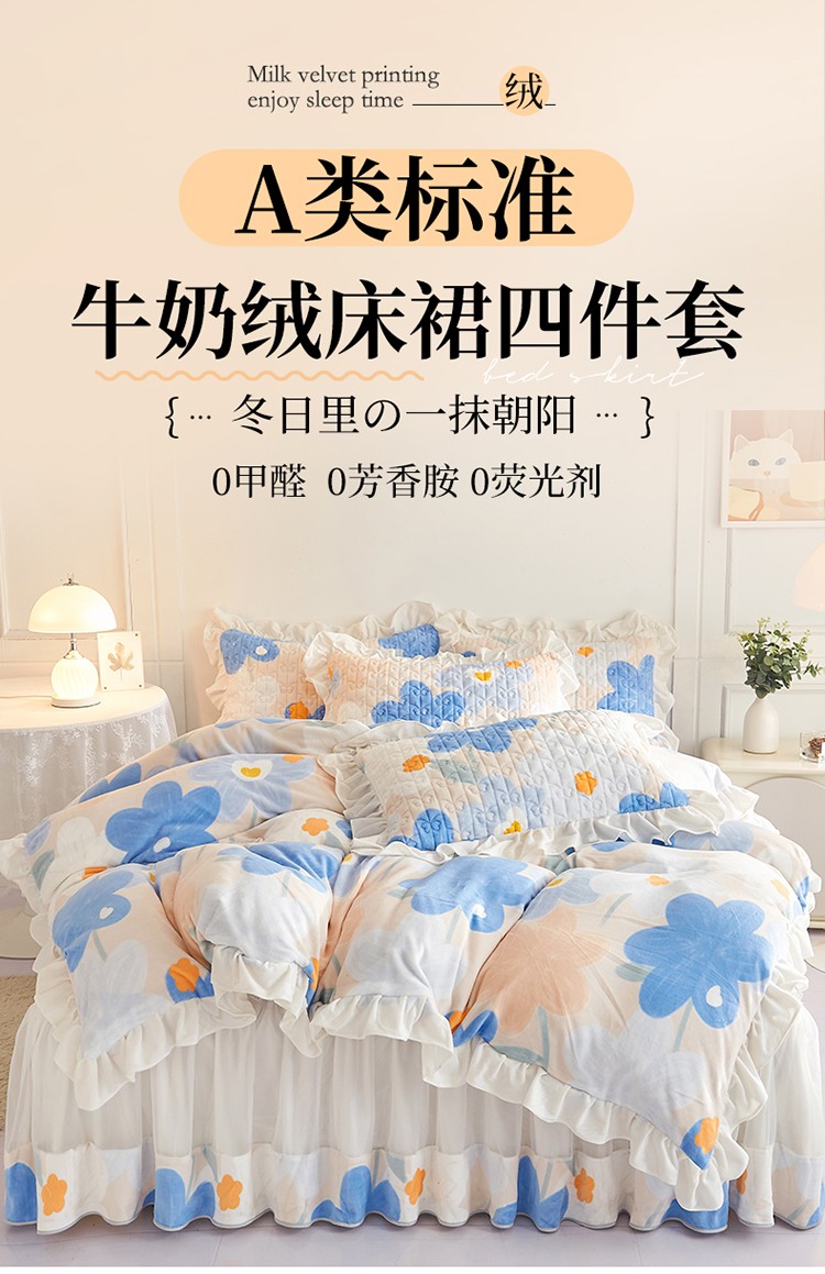 宜凡2022新款A类牛奶绒印花床裙四件套 蓝花情调