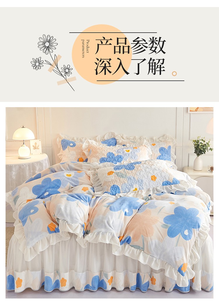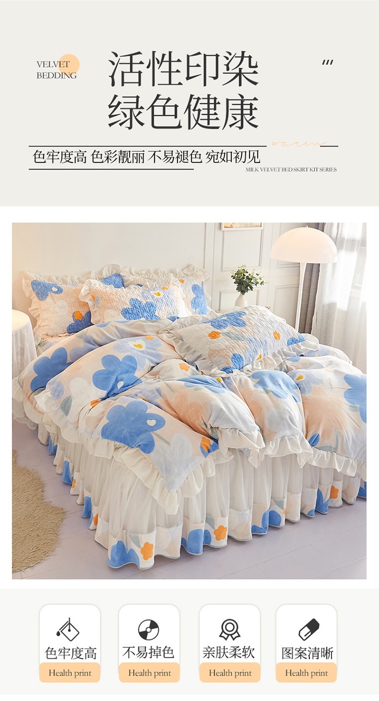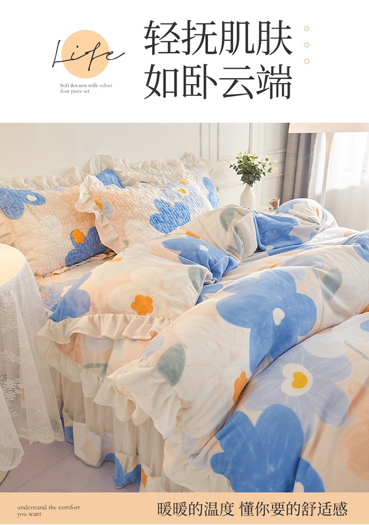 • 91家纺网 家纺一手货源 找家纺 宜凡2022新款A类牛奶绒印花床裙四件套 蓝花情调