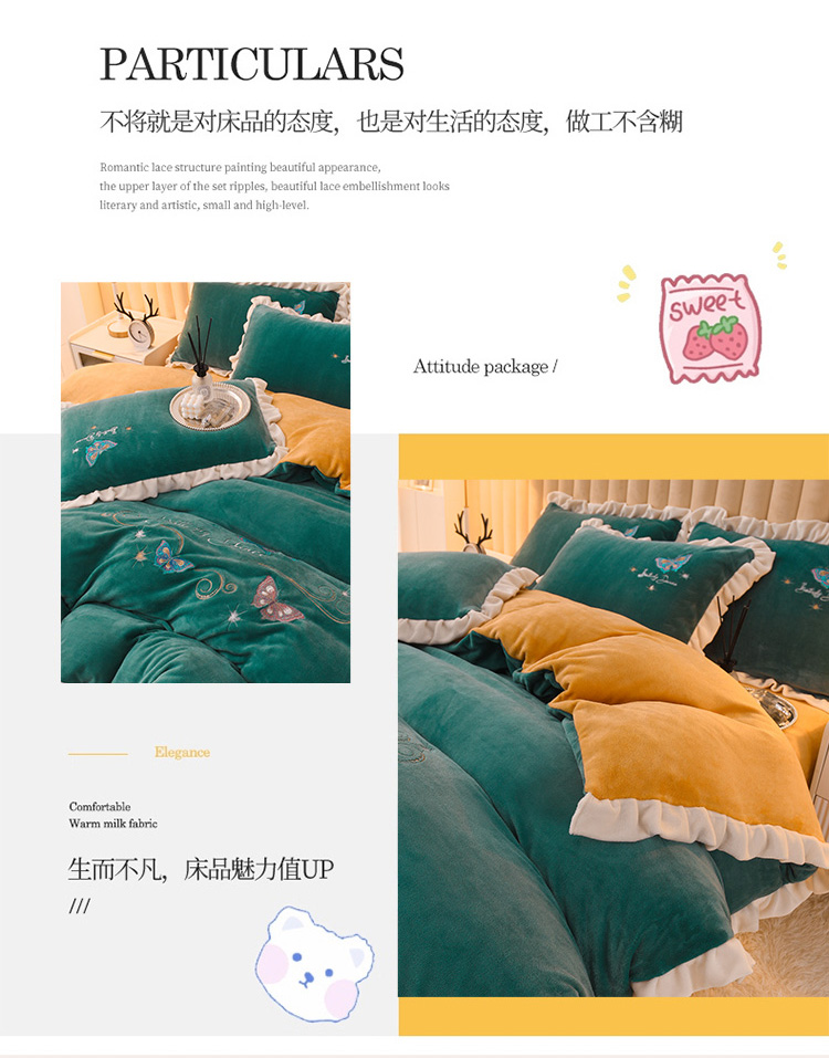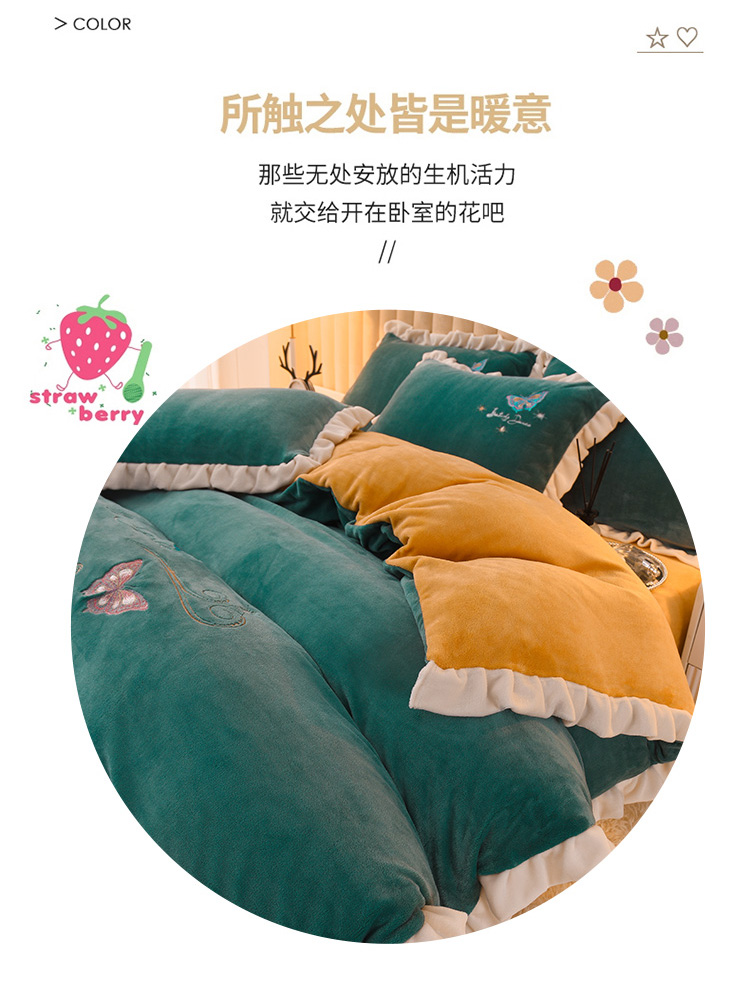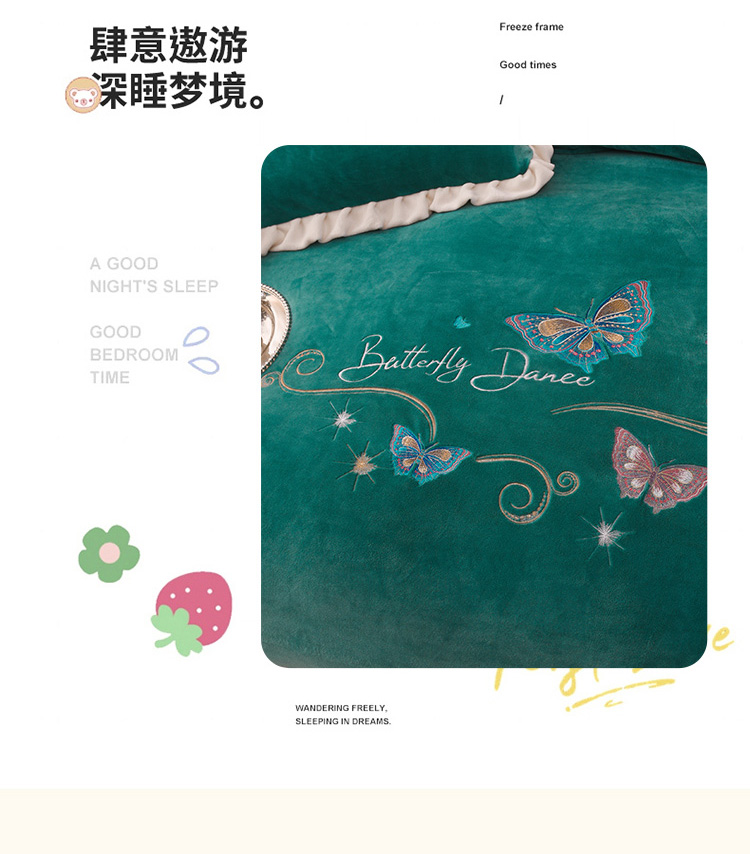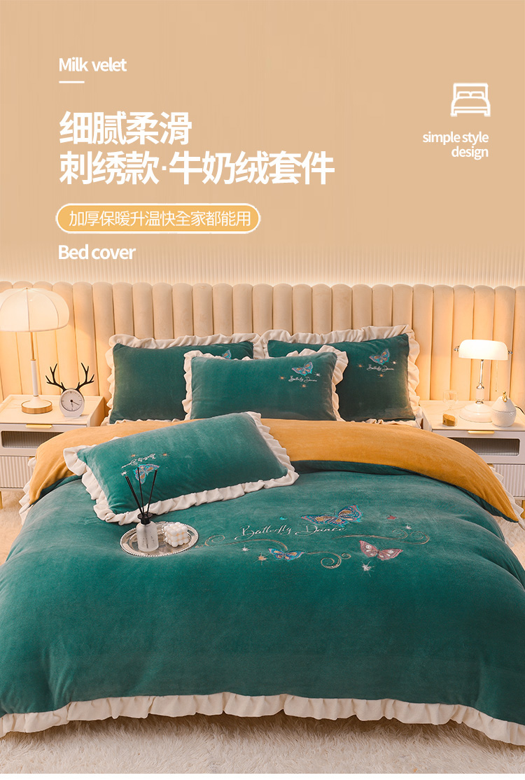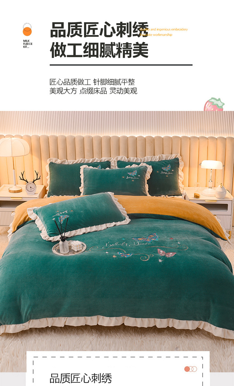 商品名称:芃成 2022新款加厚保暖牛奶绒绣花四件套 蝶舞 玛瑙绿