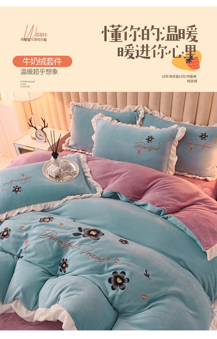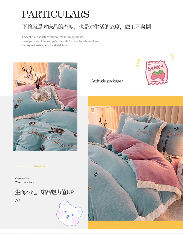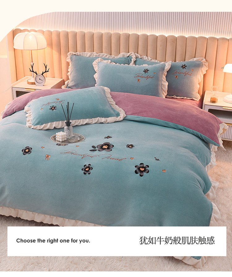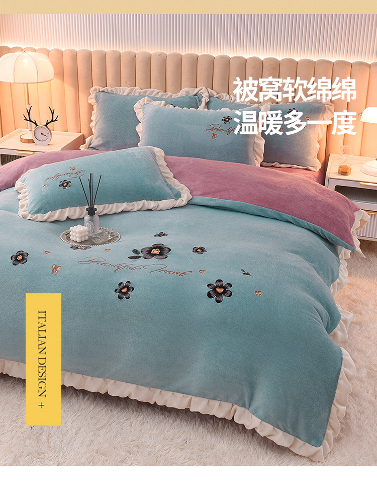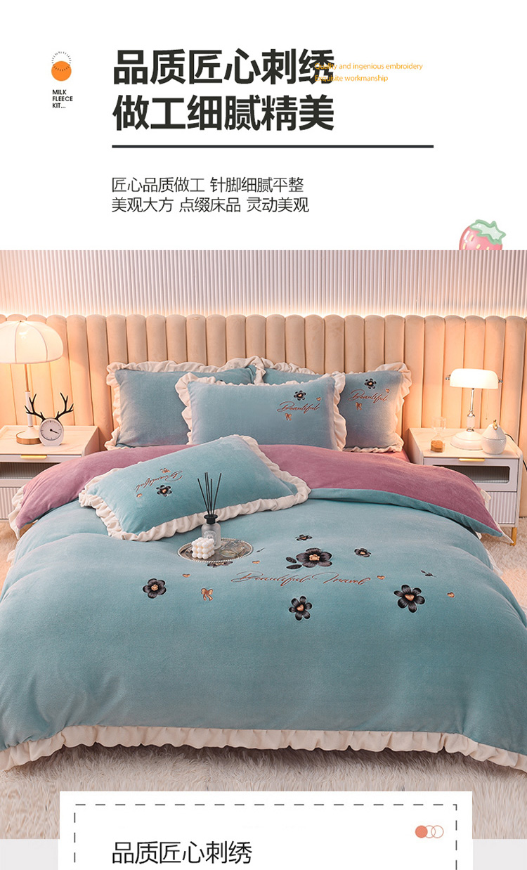 芃成 2022新款加厚保暖牛奶绒绣花四件套 花漾 湖兰