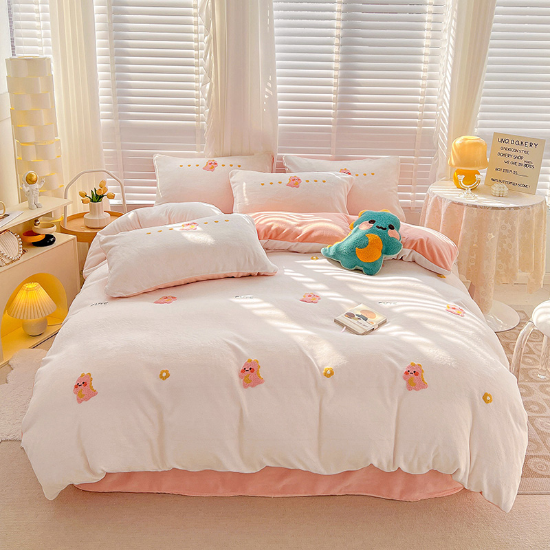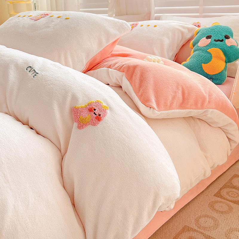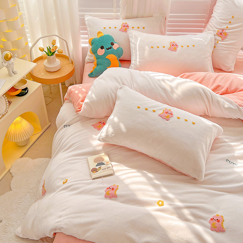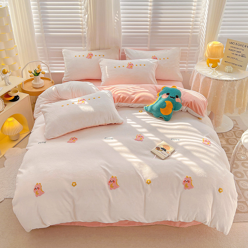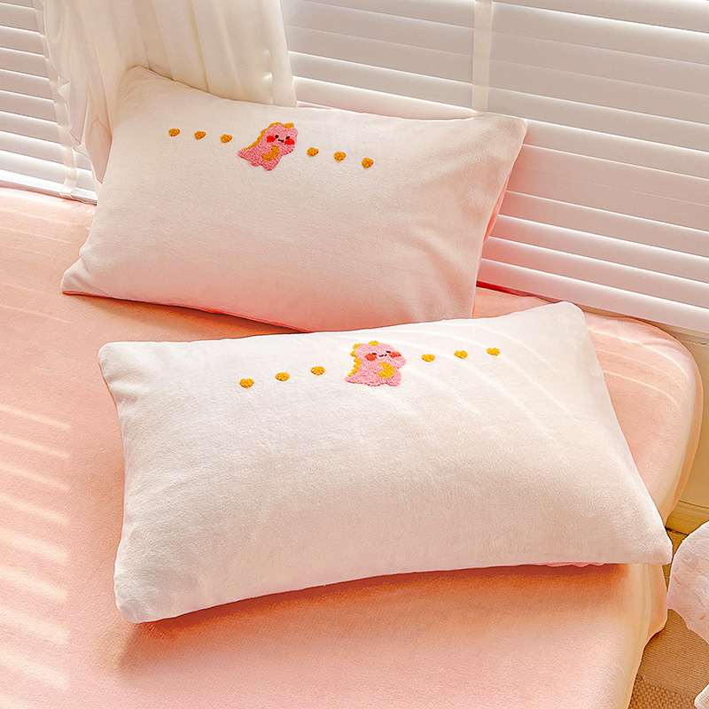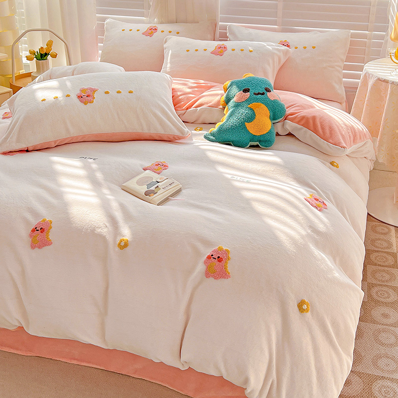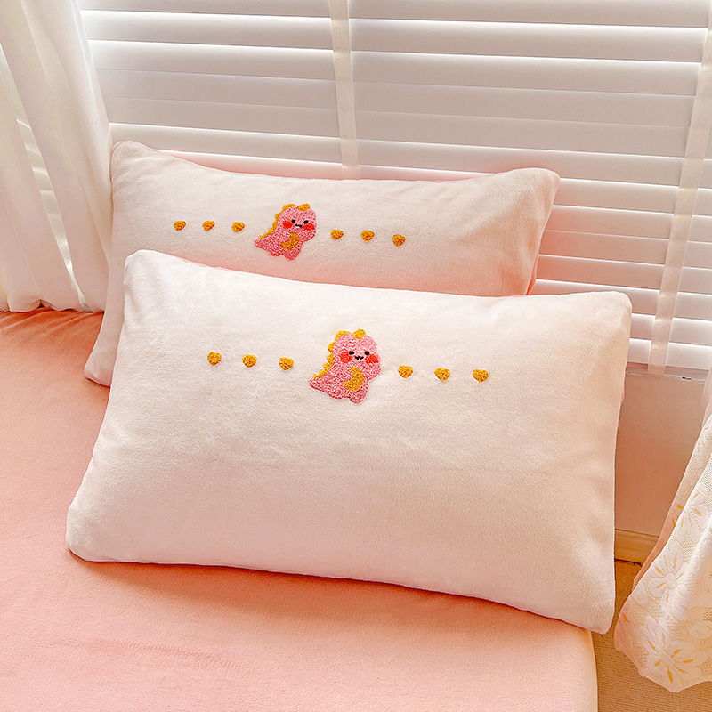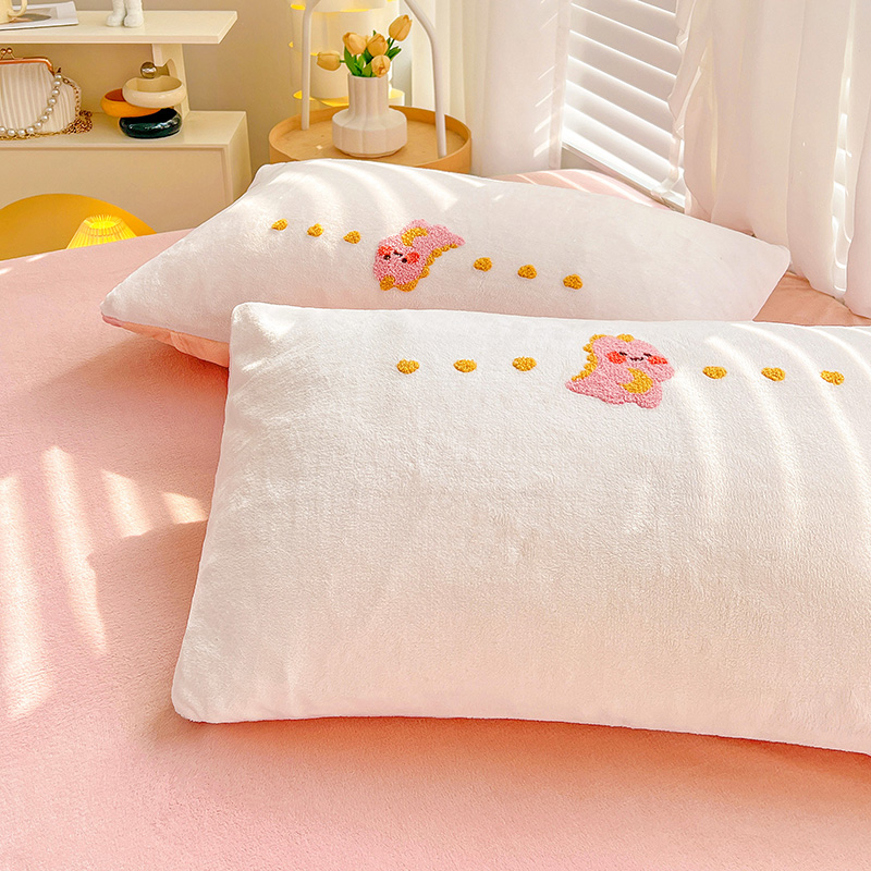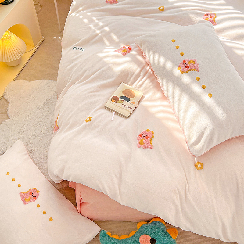 商品名称:寐居2022新款毛巾绣牛奶绒单被套 萌宠恐龙-粉白