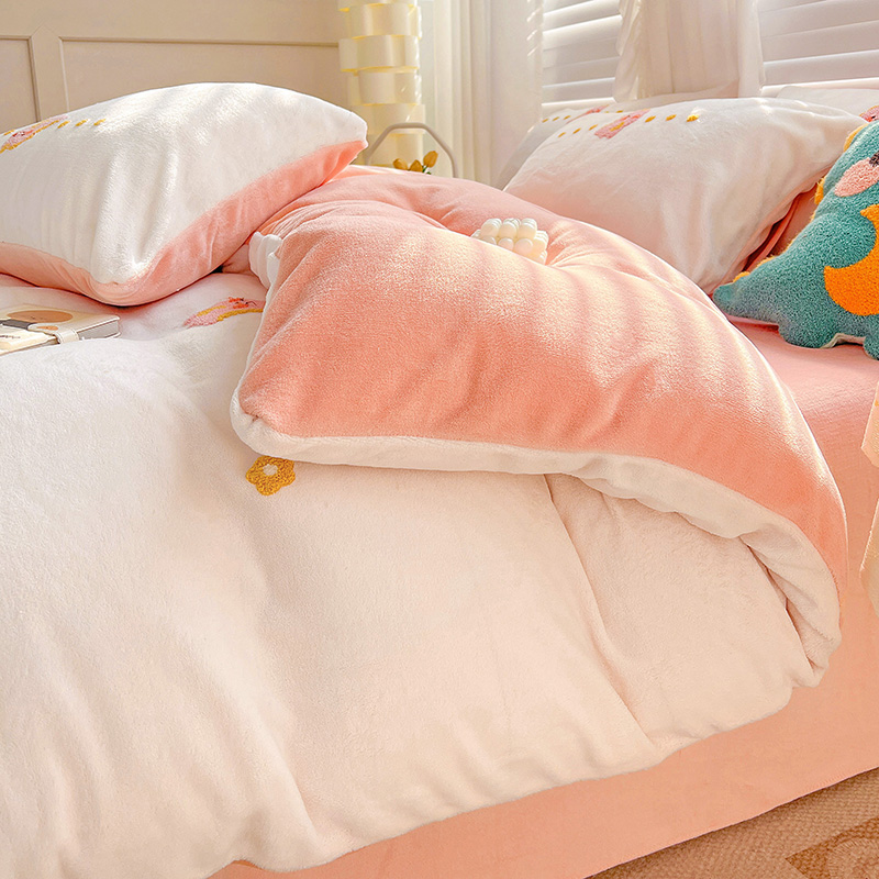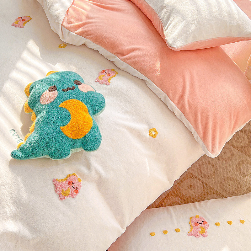 寐居2022新款毛巾绣牛奶绒单被套 萌宠恐龙-粉白