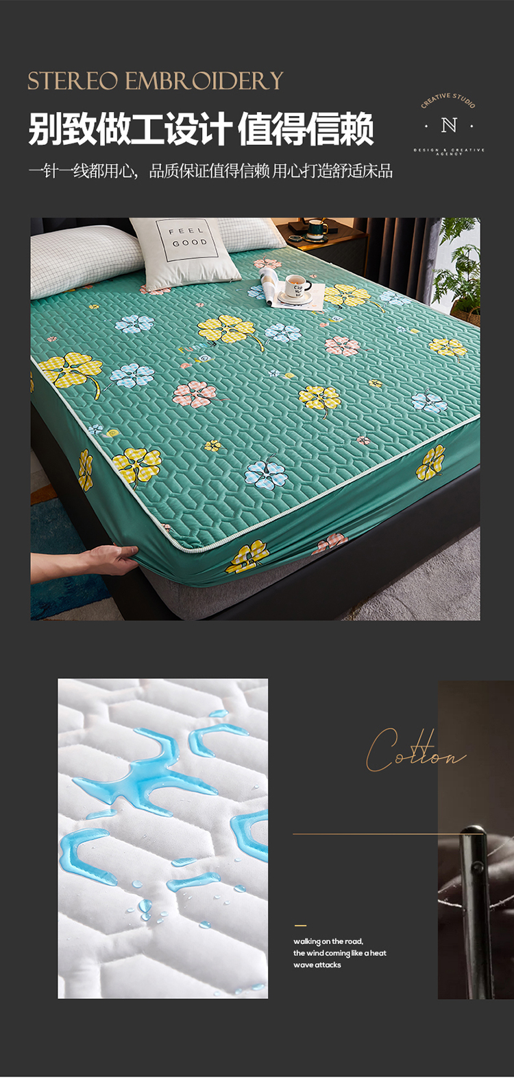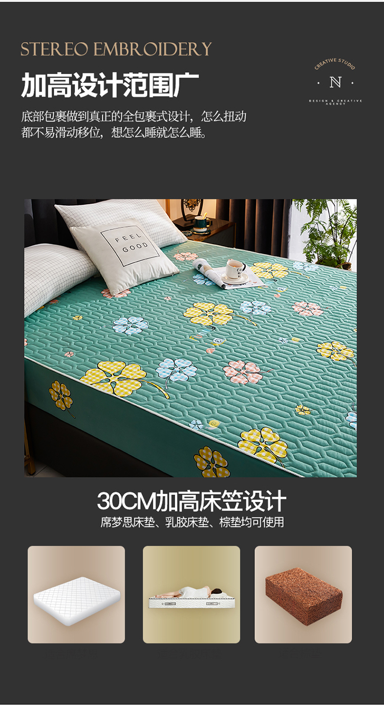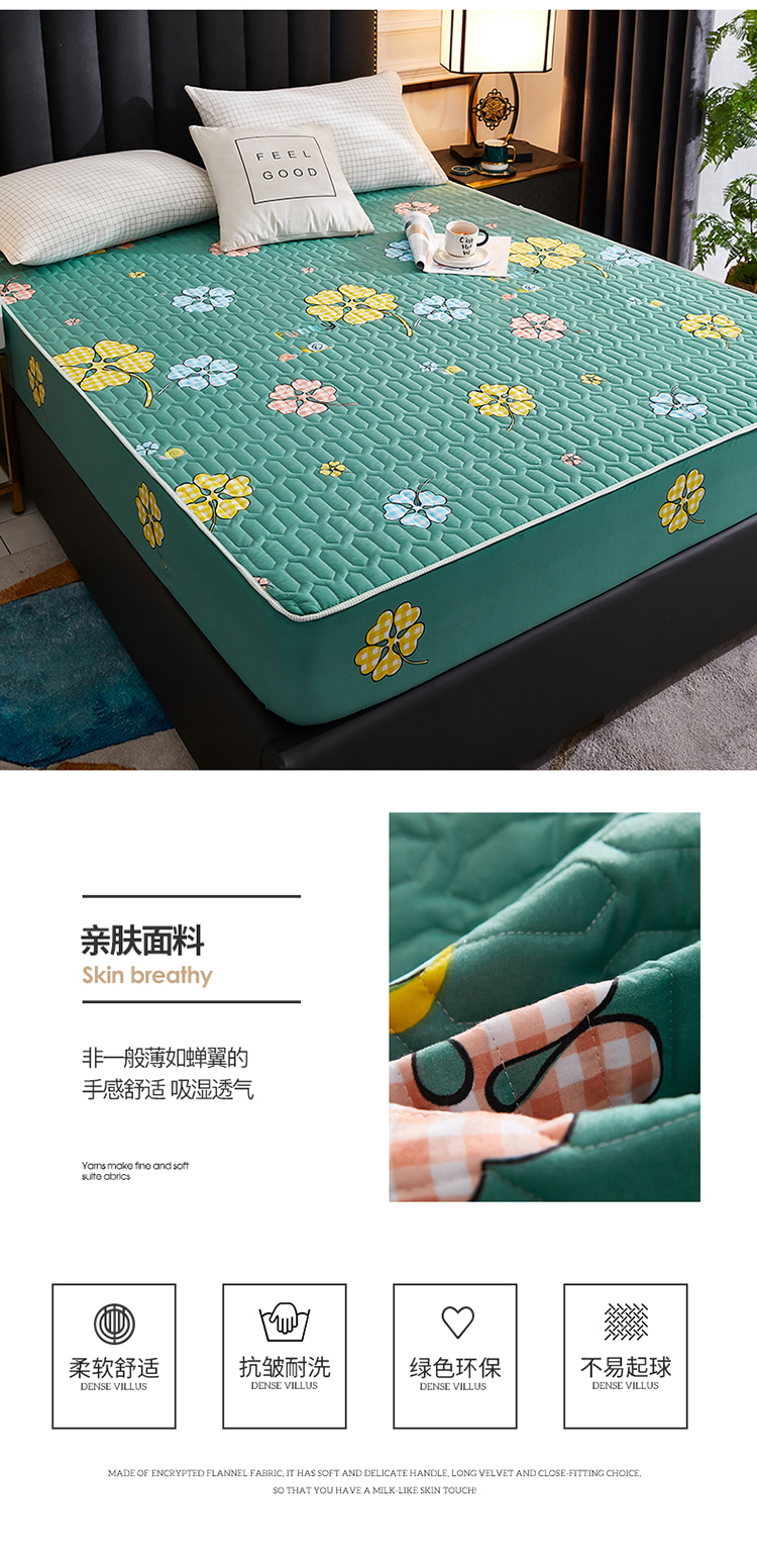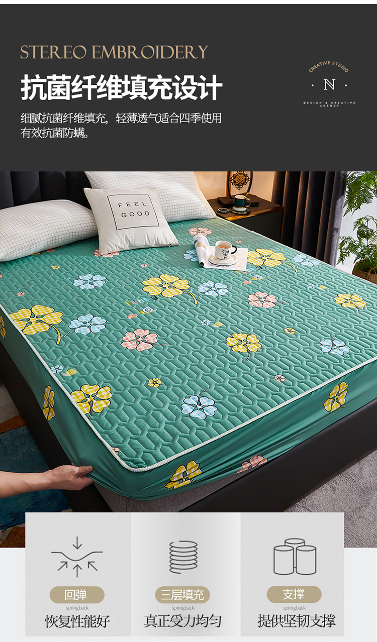 • 91家纺网 家纺一手货源 找家纺 苏木年华2023新款抗菌加厚防水隔尿夹棉床笠 绿色小花