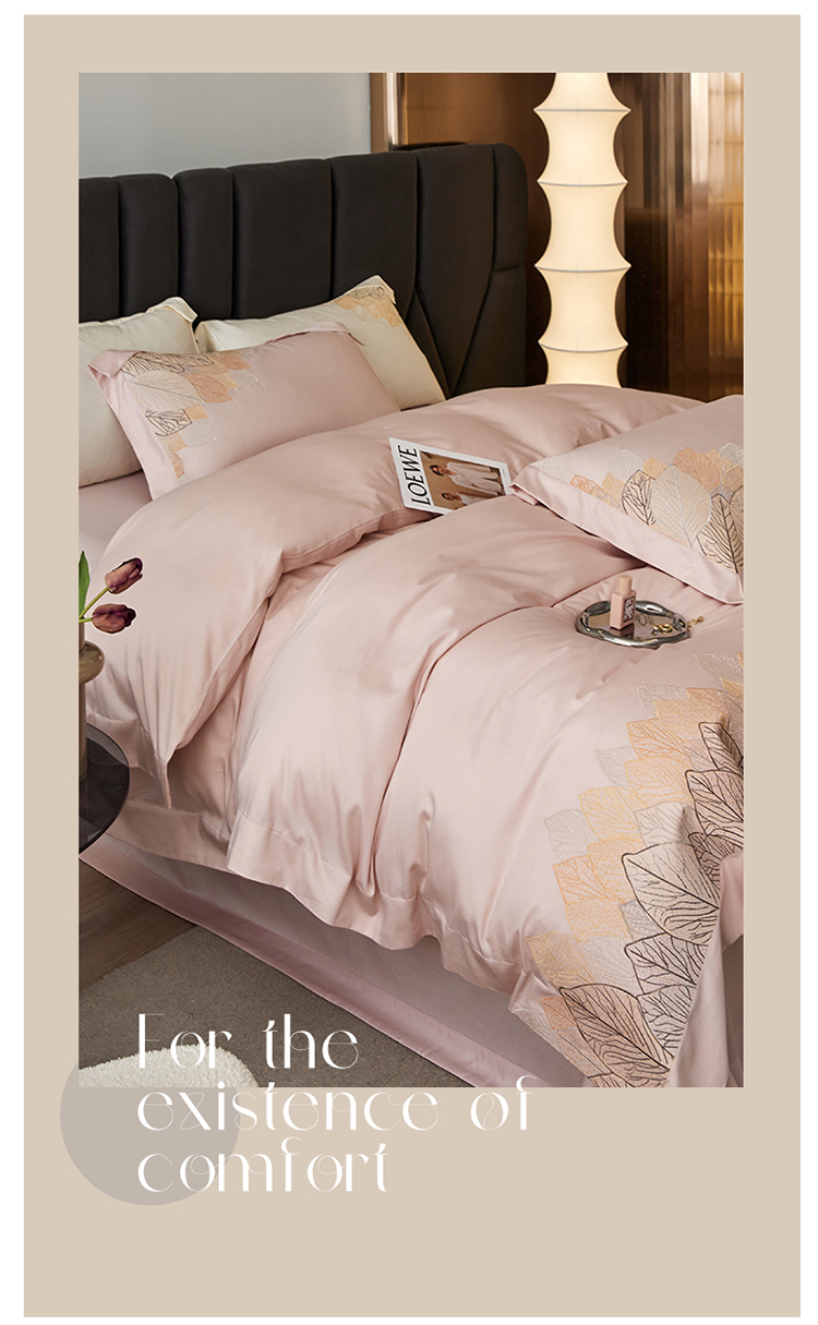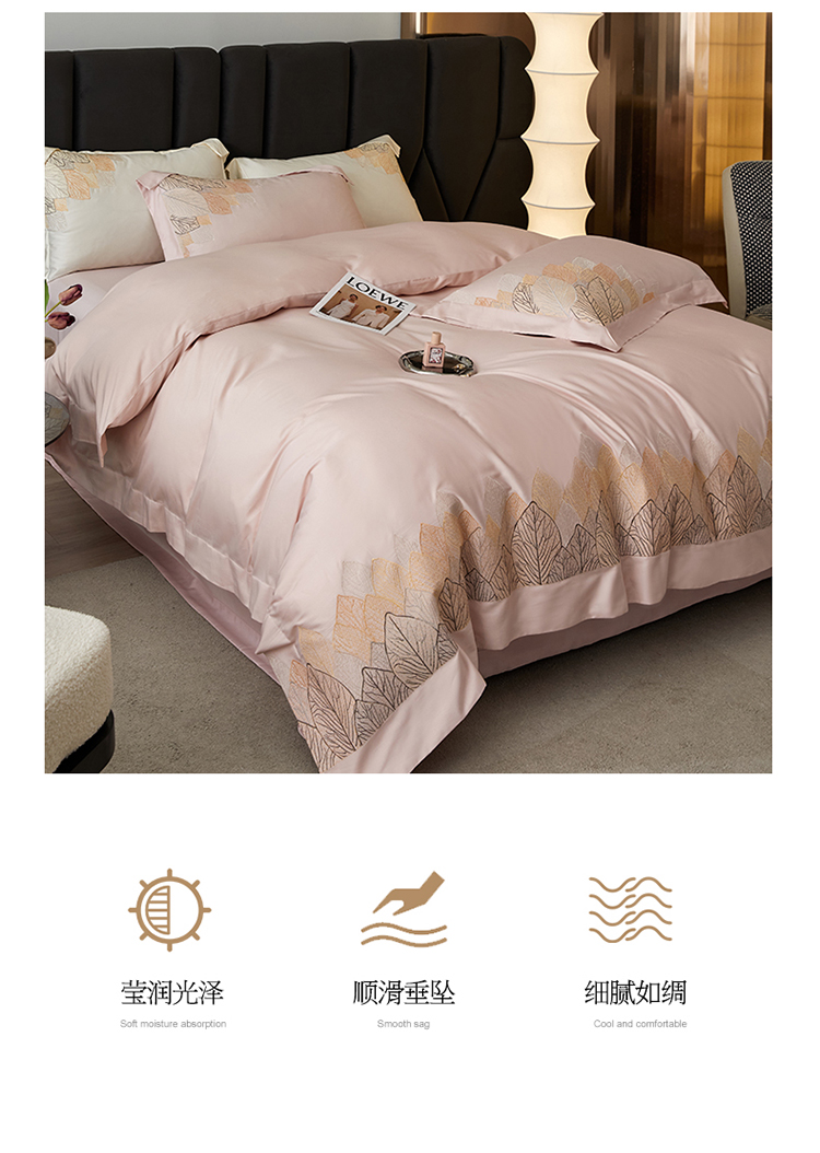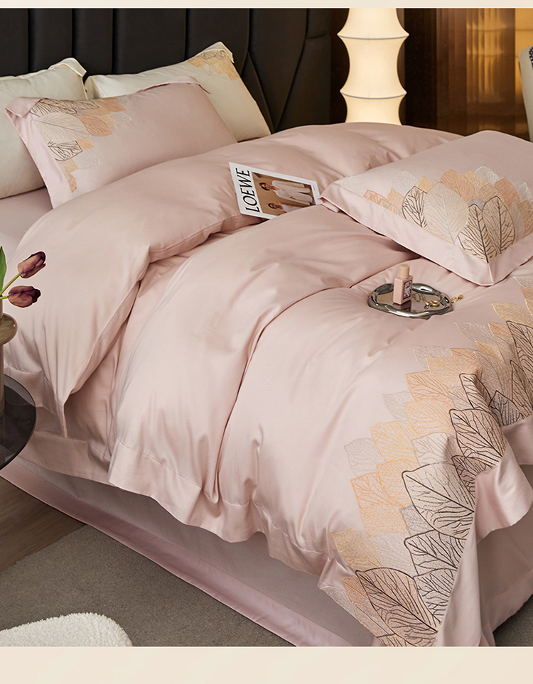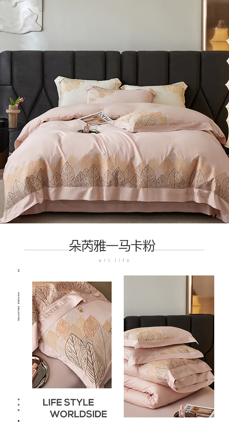商品名称:名品优仓 高支高密长绒棉刺绣款四季可用四件套朵芮雅系列 朵芮雅一马卡粉