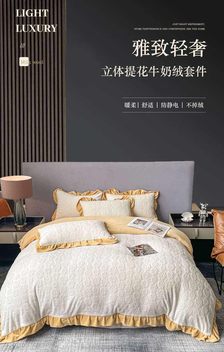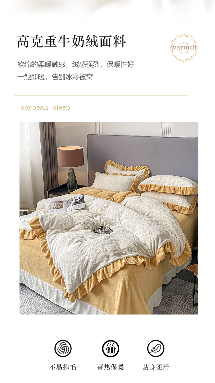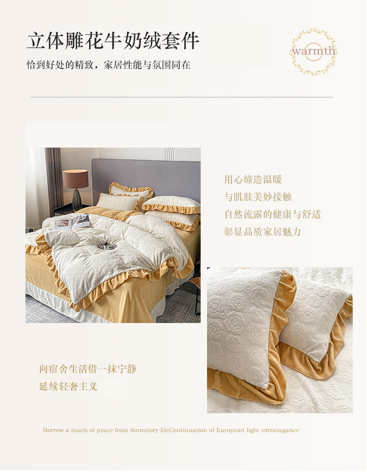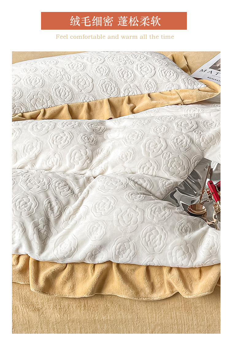 商品名称:野合家纺 2024新款牛奶绒雕花绒四件套韩版花边绒套件 香茶花-杏仁粉