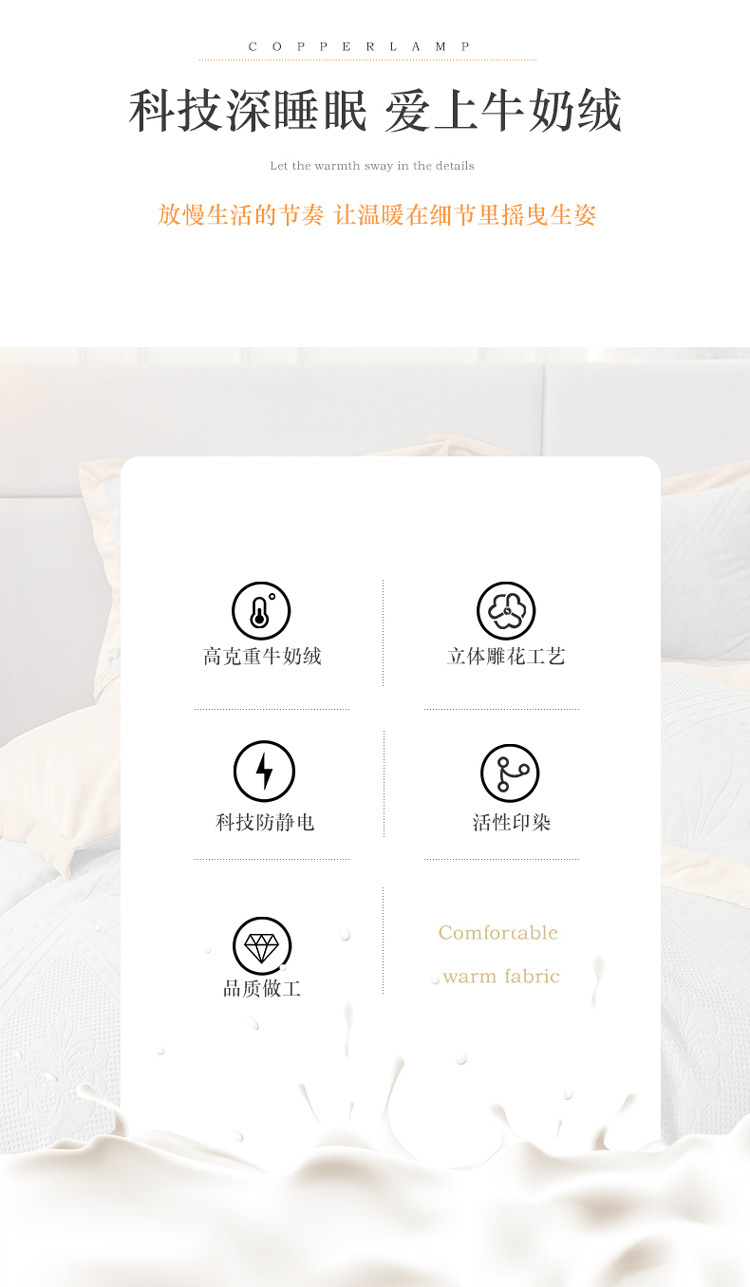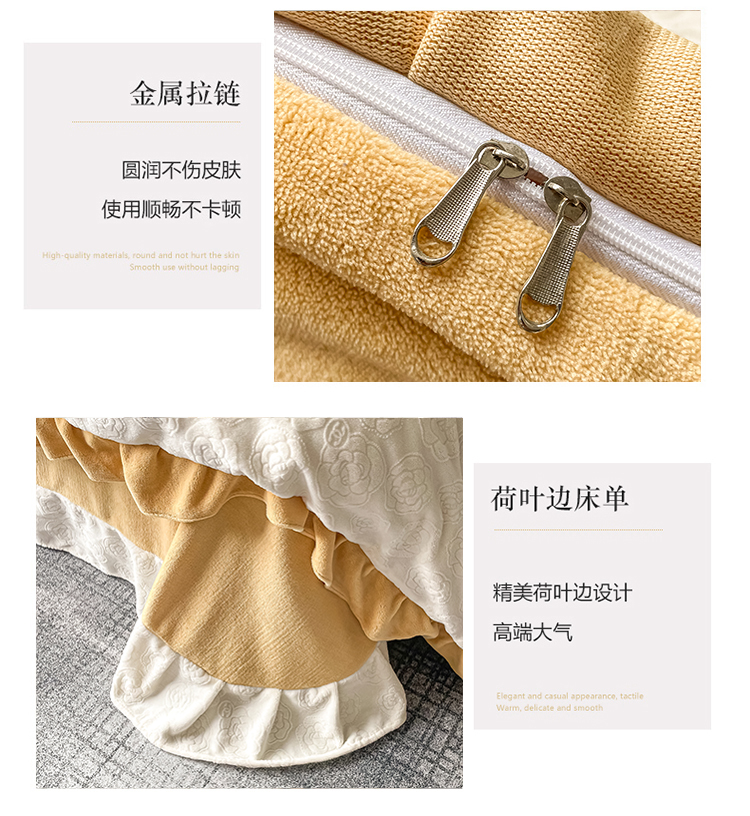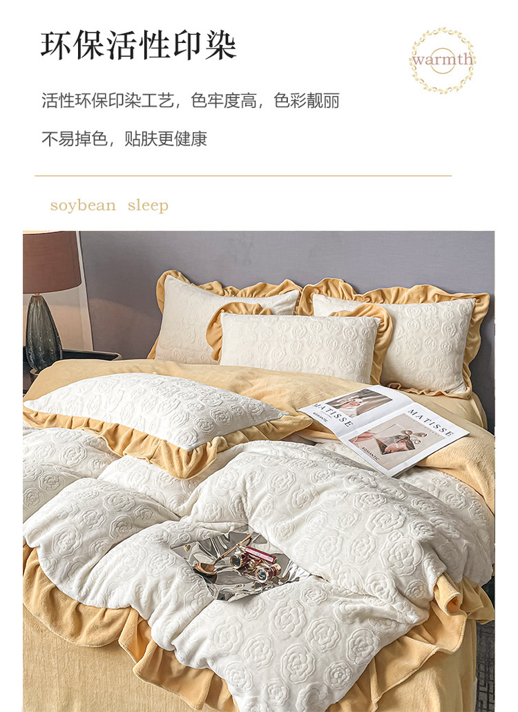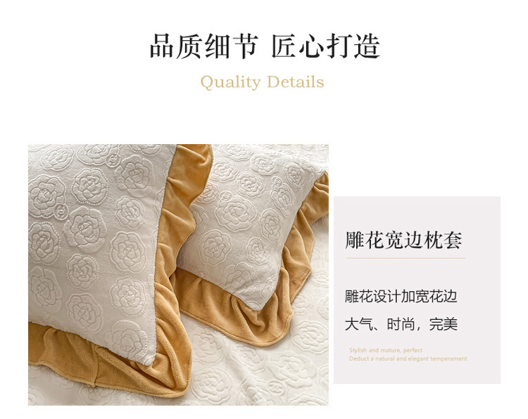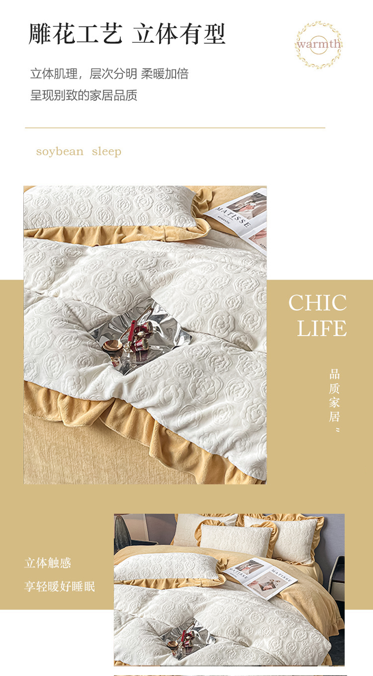商品名称:野合家纺 2024新款牛奶绒雕花绒四件套韩版花边绒套件 香茶花-杏仁粉