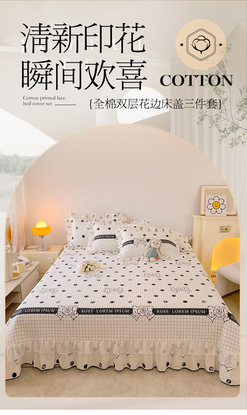• 91家纺网 家纺一手货源 找家纺 宜凡 2023新款全棉双层花边床盖三件套系列 小情歌