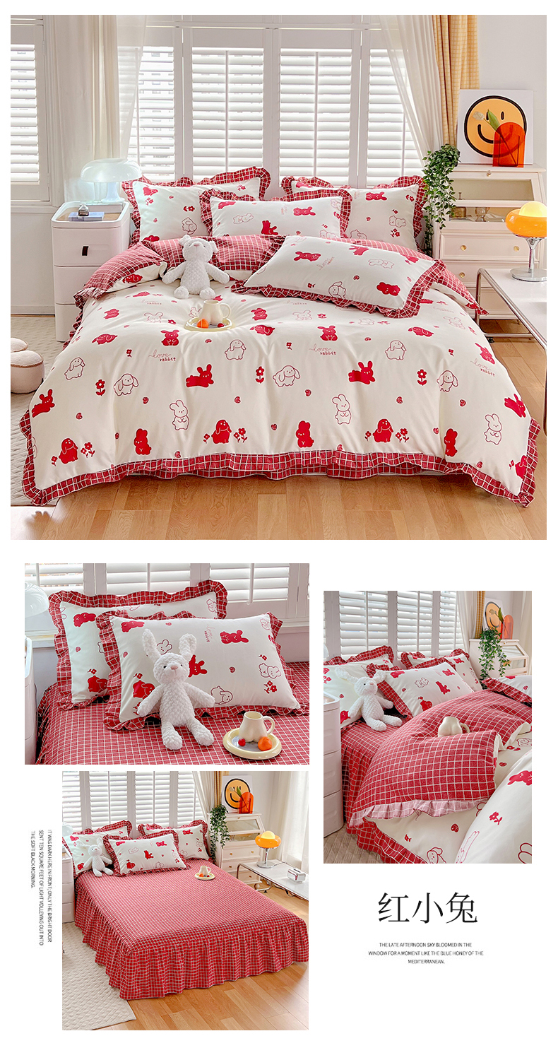 当前位置: 91家纺网 > 商品网购 > 床品套件 > 四件套 > 上尚居 2024新款小清新韩版花边磨毛四件套水洗棉 红小兔