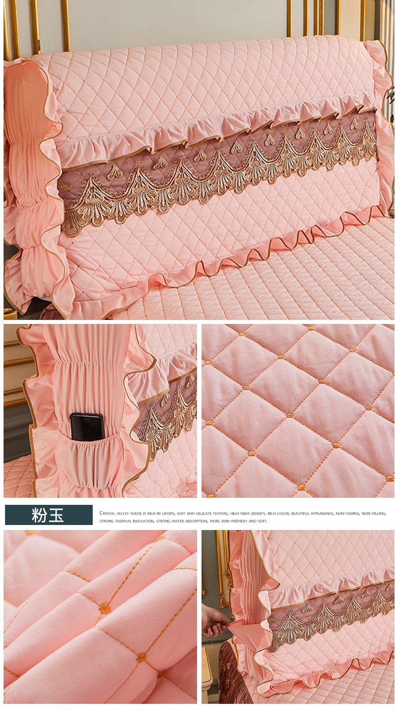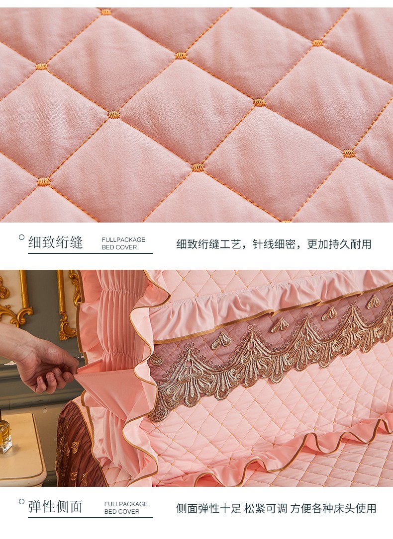 (总)屹成家纺2025新款水晶绒夹棉绗缝蕾丝床裙三件套(塞纳河畔)床裙单件起售价不低于105元,大红,豆沙,翡翠绿,粉玉,橄榄绿,蔚蓝,银灰