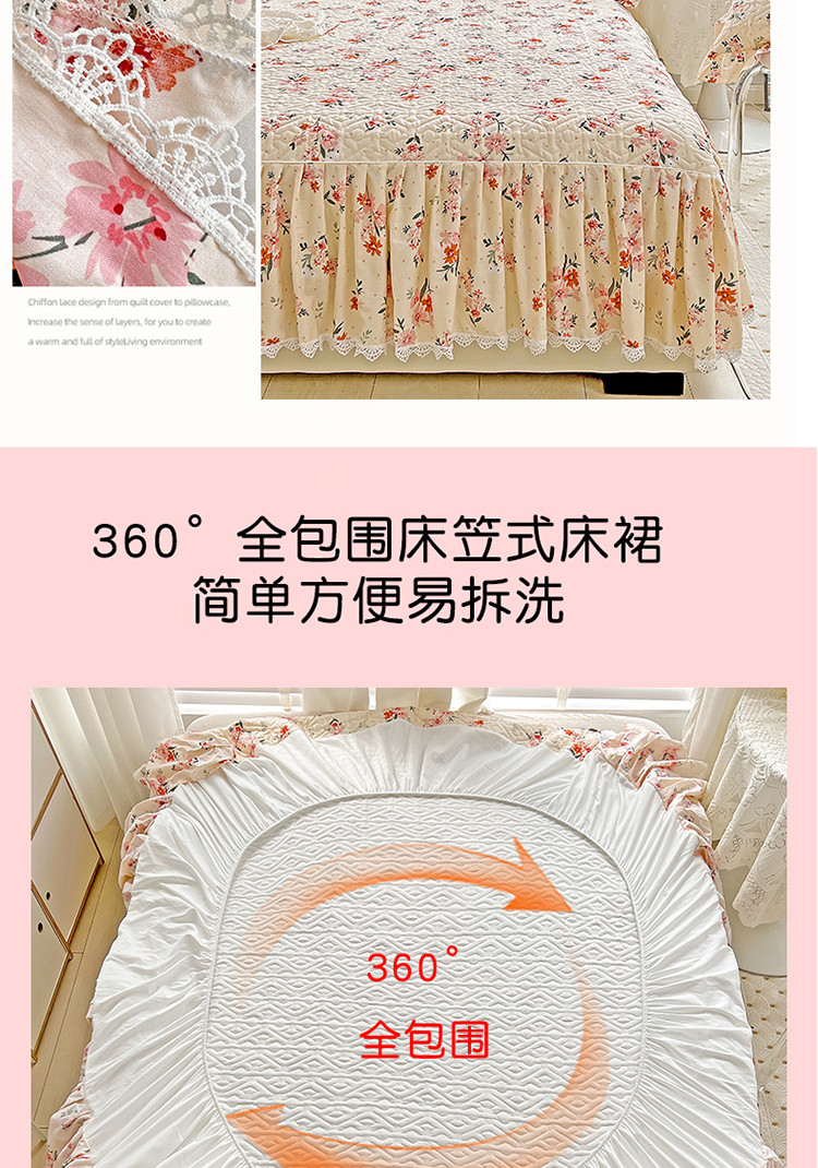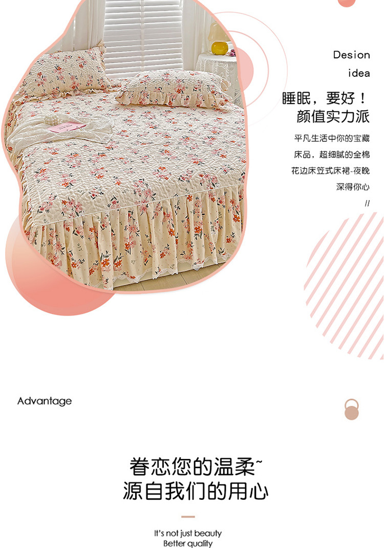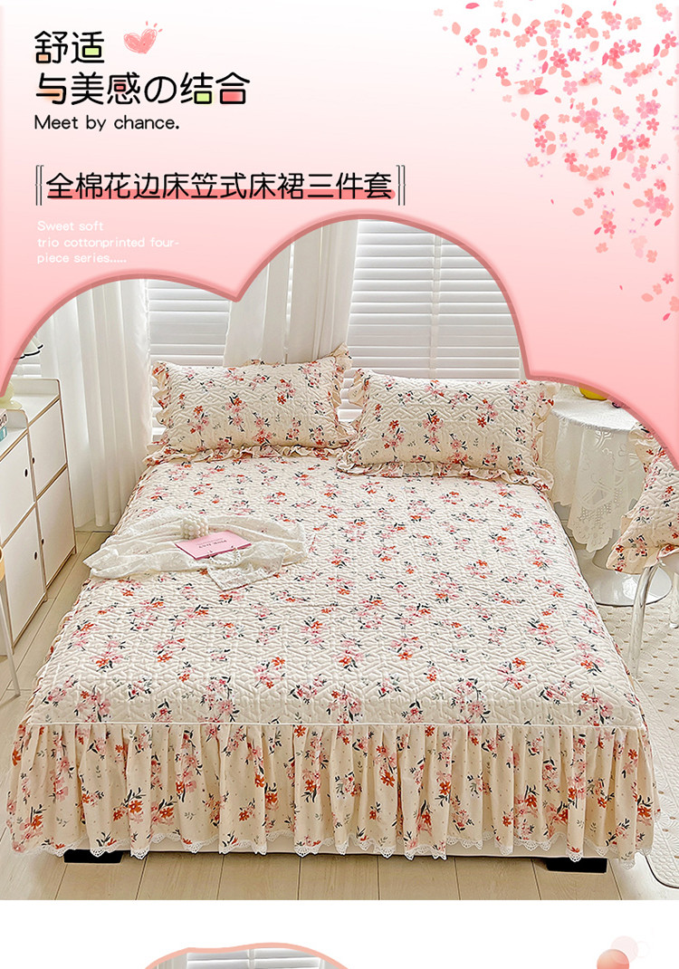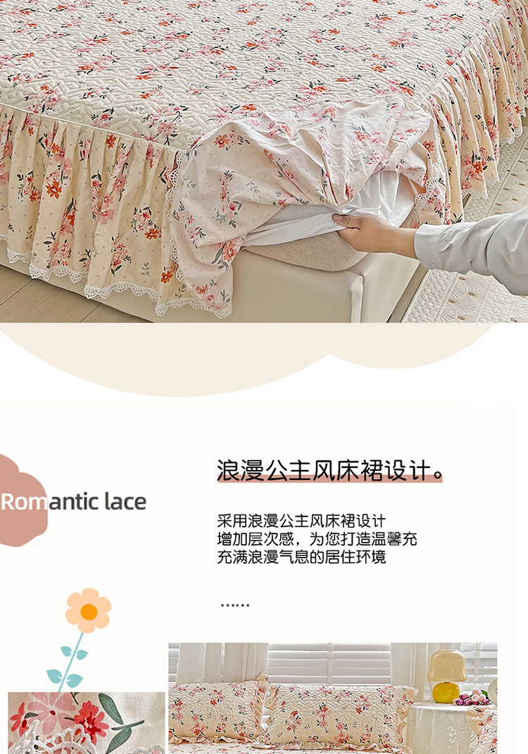 • 91家纺网 家纺一手货源 找家纺 罗艺轩 2024新款全棉花边床笠式夹棉床裙三件套波赛尔庄园-小时光