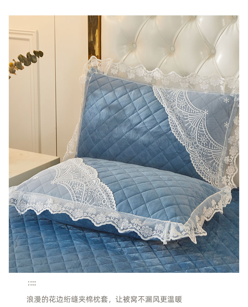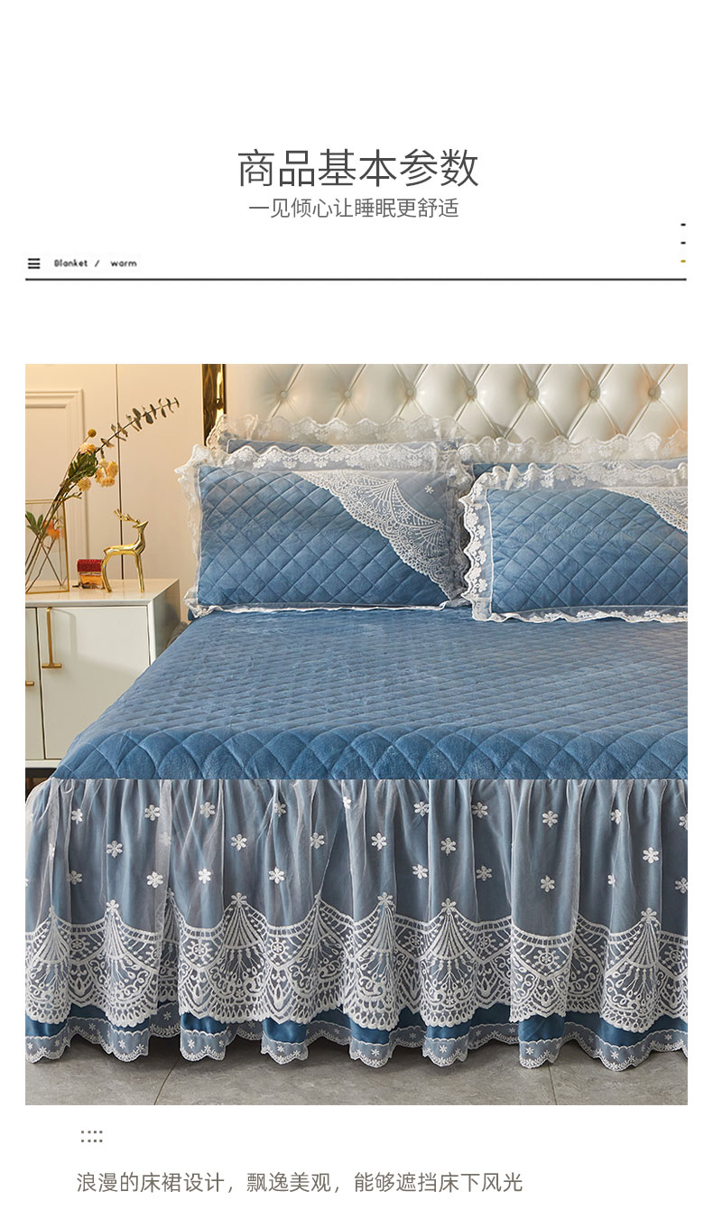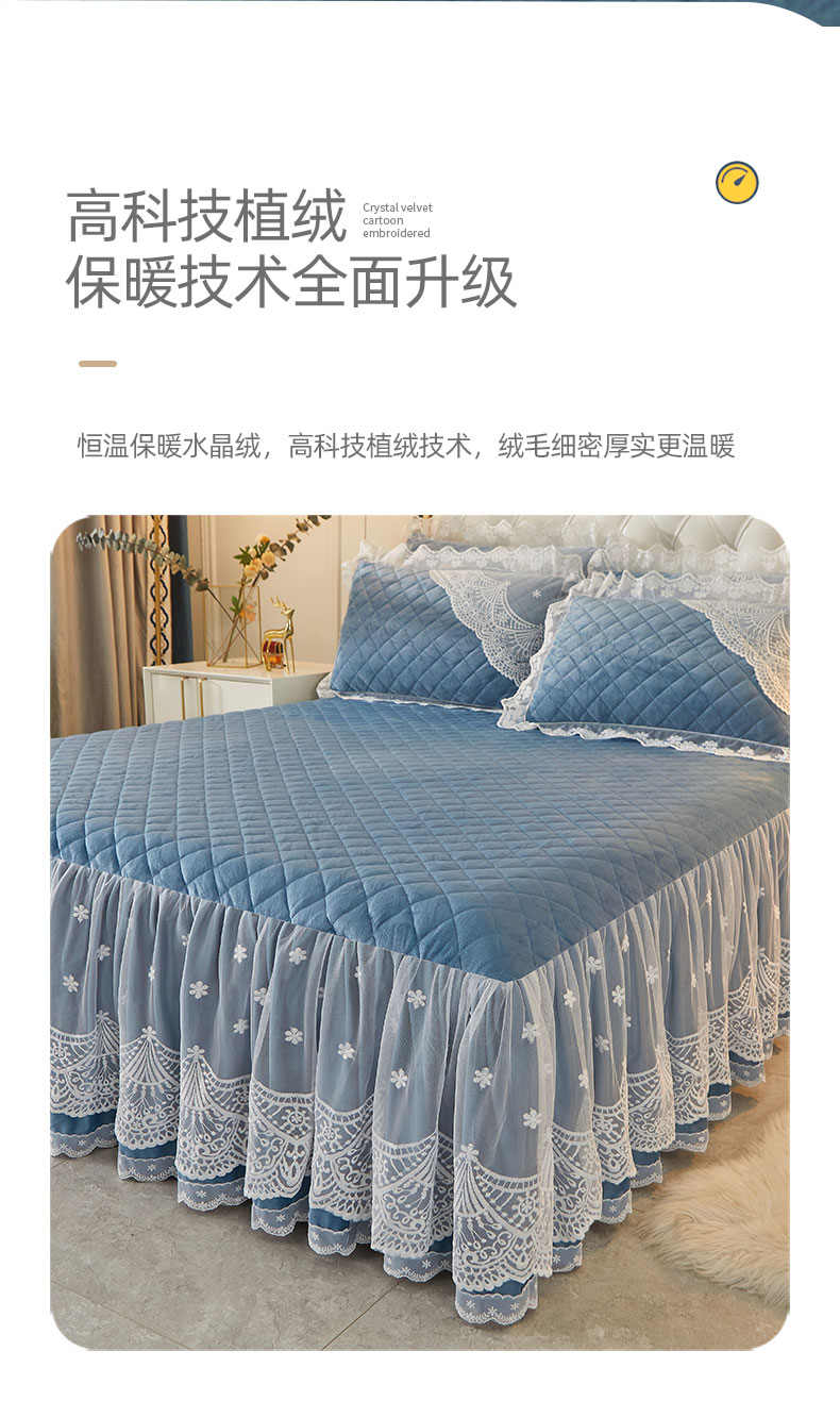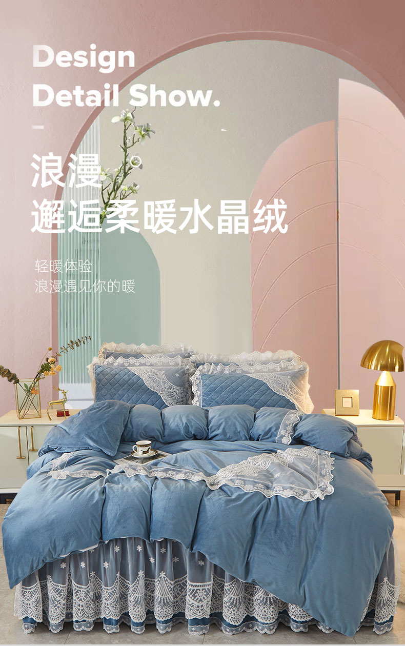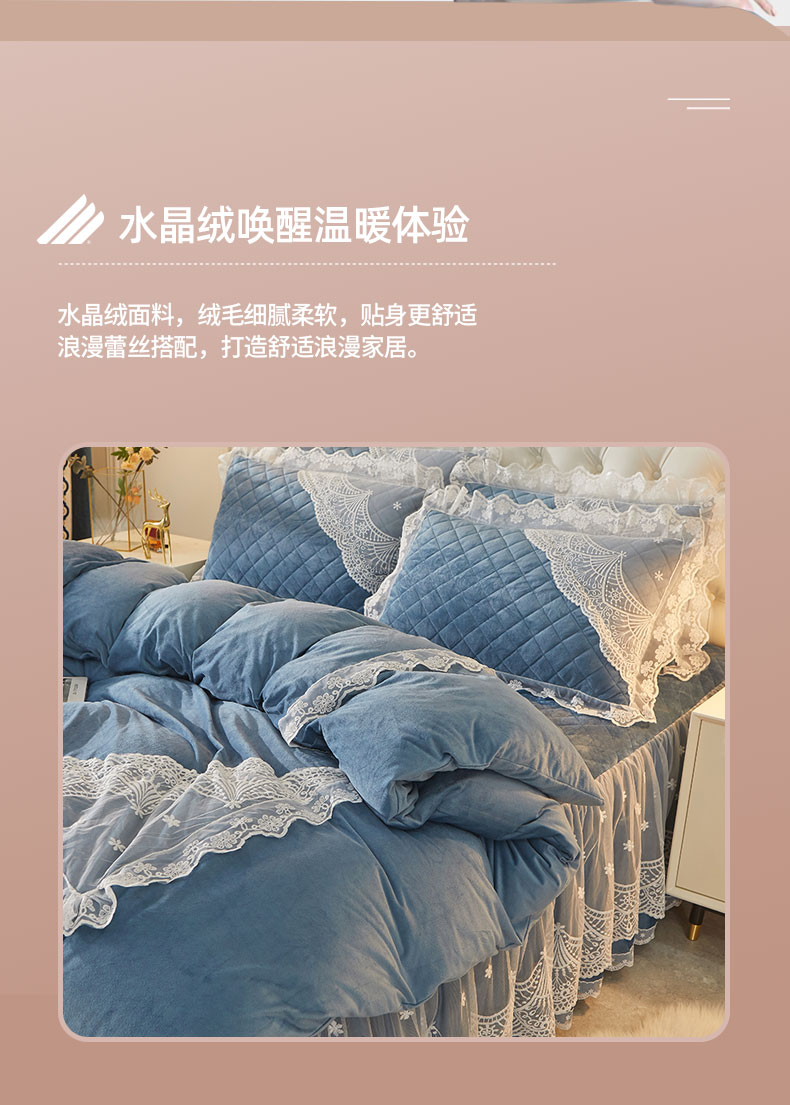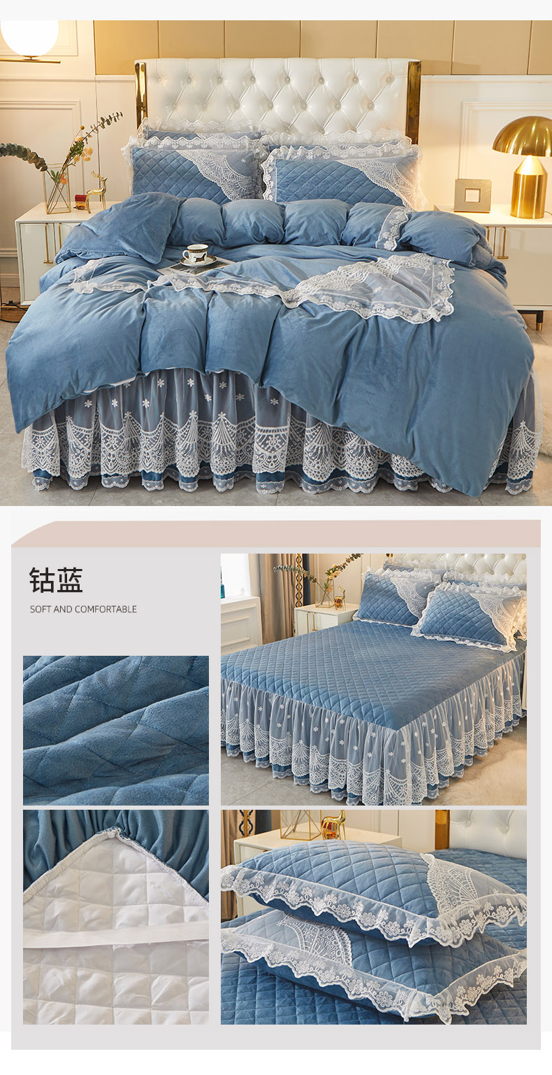 当前位置: 91家纺网 > 商品网购 > 床品套件 > 四件套 > 全棉普通四件套 > 2023新款水晶绒保暖床裙四件套爱妮系列 钴蓝
