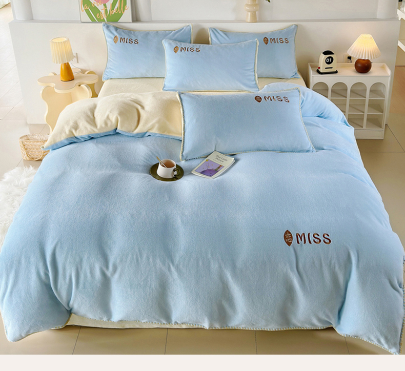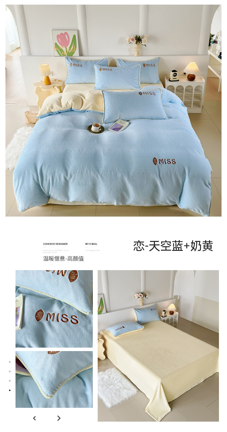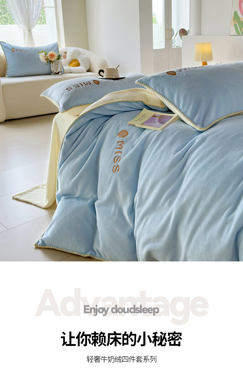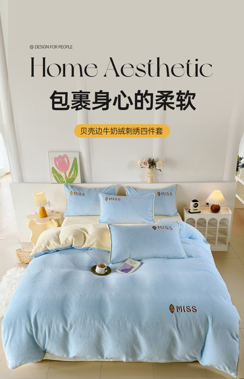 当前位置: 91家纺网 > 商品网购 > 床品套件 > 四件套 > 牛奶绒四件套 > 眷恋 2024新款贝壳边牛奶绒刺绣四件套 恋-天空蓝+奶黄