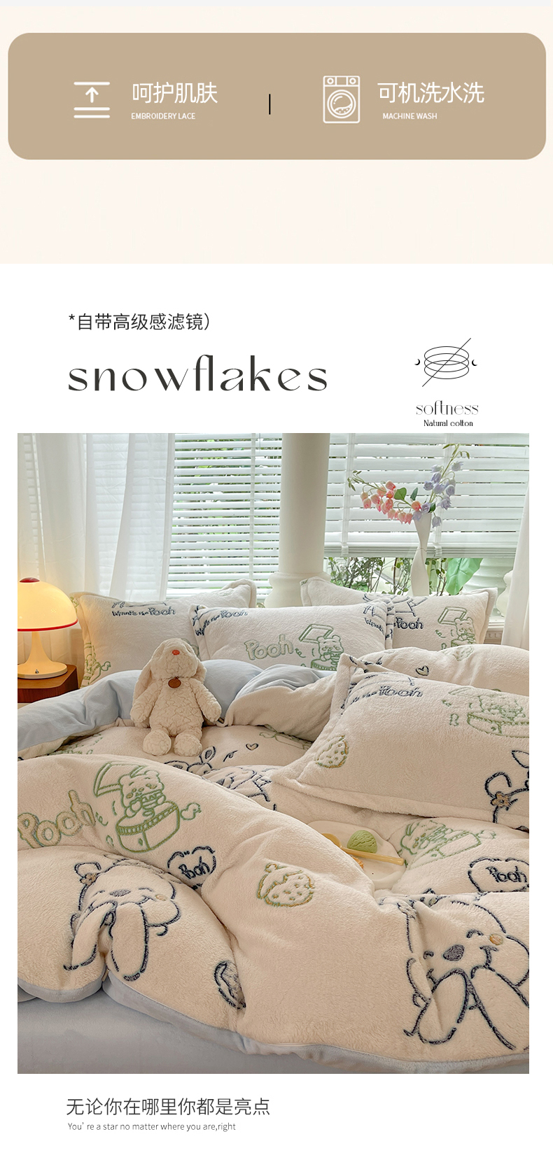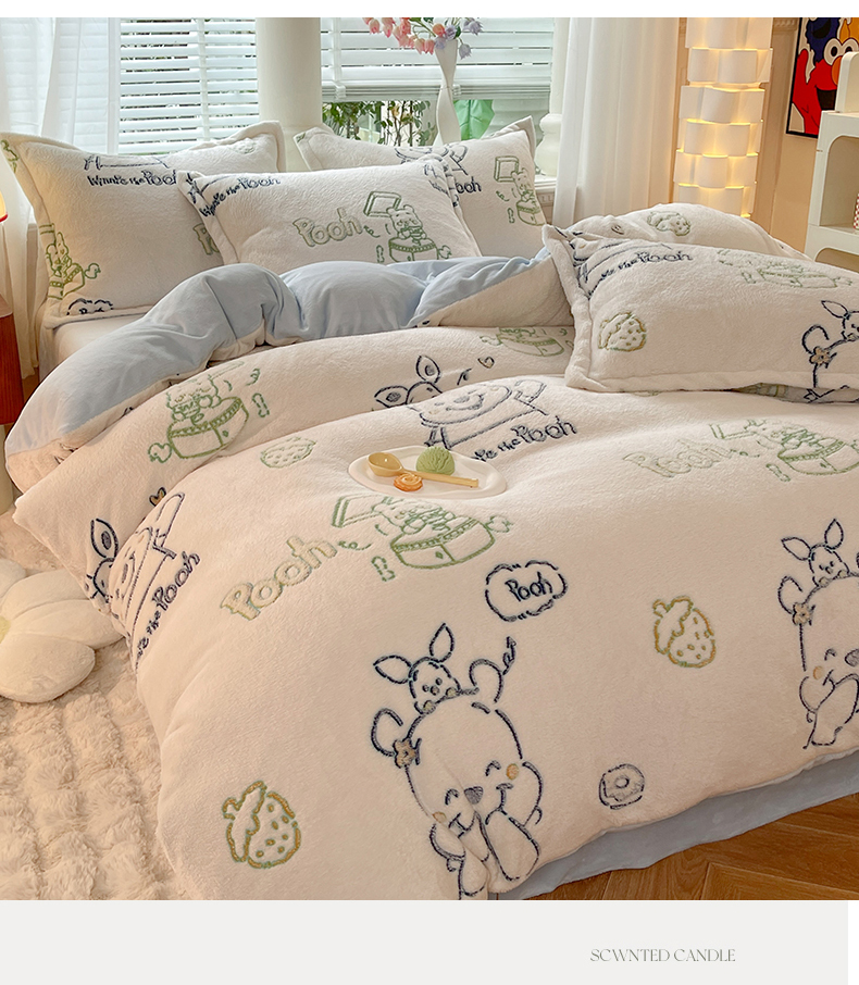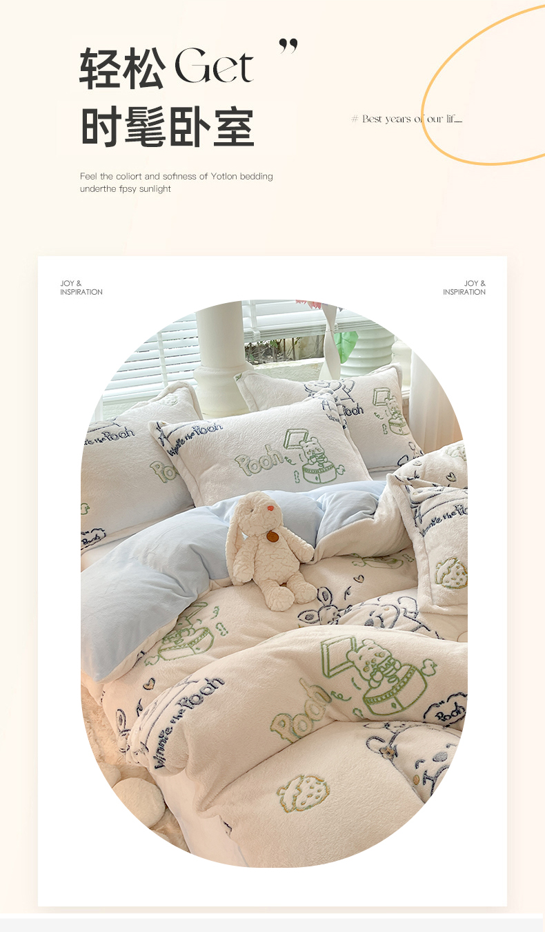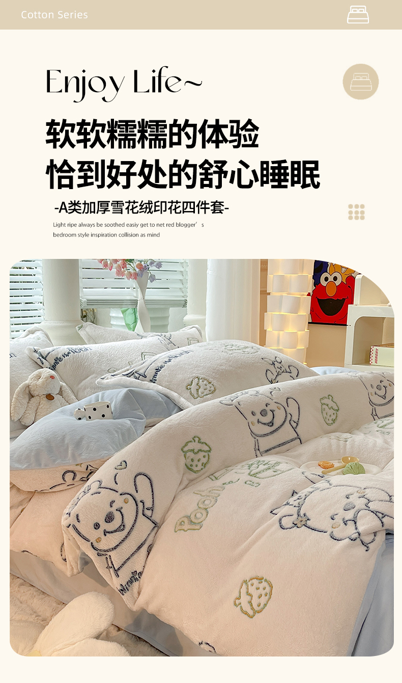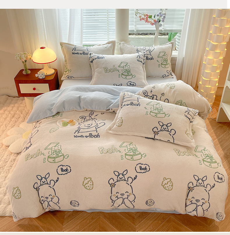 当前位置: 91家纺网 > 商品网购 > 床品套件 > 四件套 > 全棉普通四件套 > 妖妖家纺 2023新款妖妖雪花绒单品三四件套 开心维尼