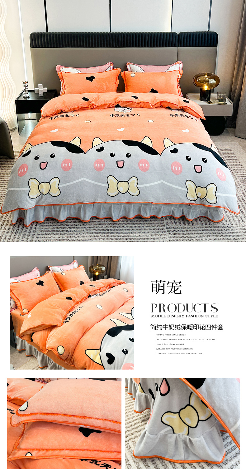 商品名称:欧喜璐 2023新款高克重牛奶绒四件套法莱绒金貂绒8.5斤加厚保暖-印花款 萌宠