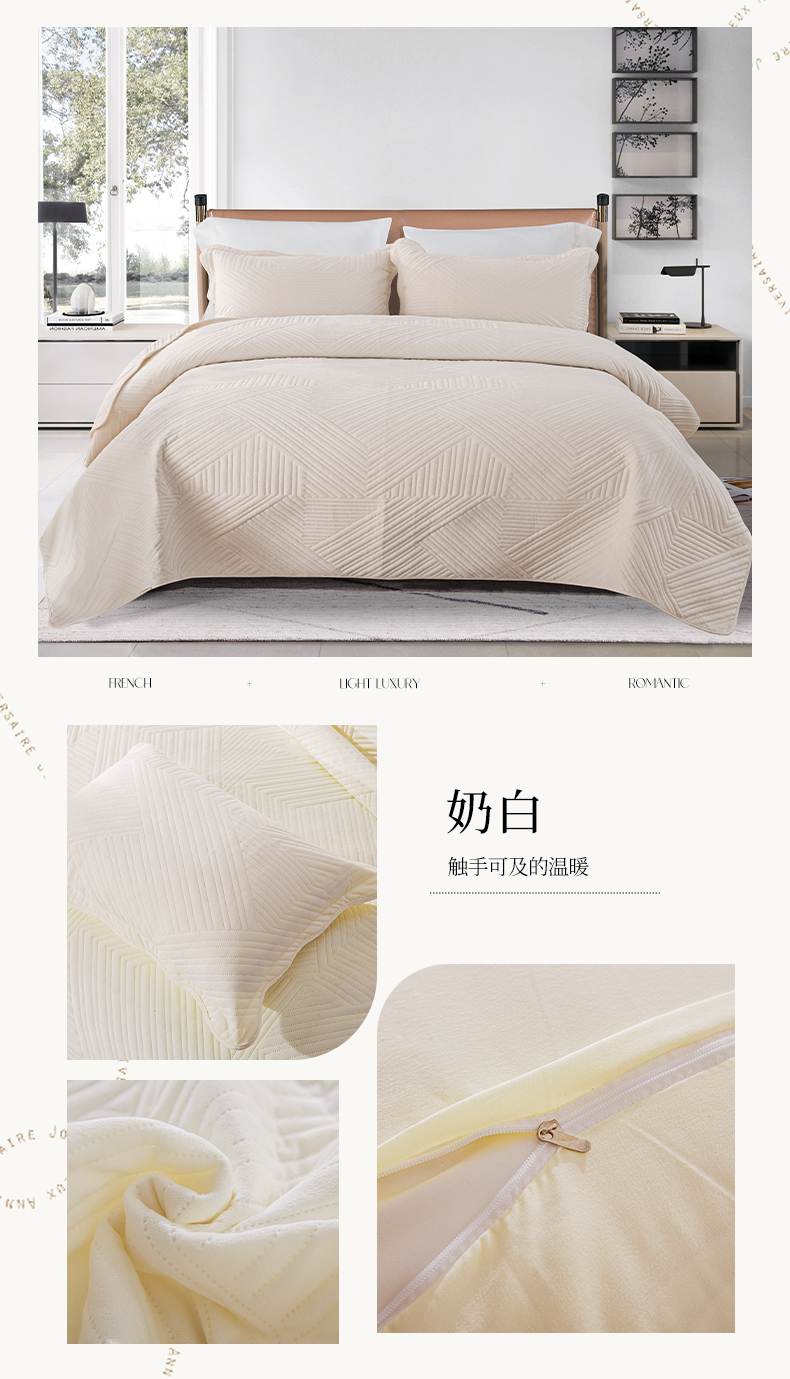 恩和家纺 2024新款水晶绒牛奶绒法兰绒床盖线条款 线条款-奶白