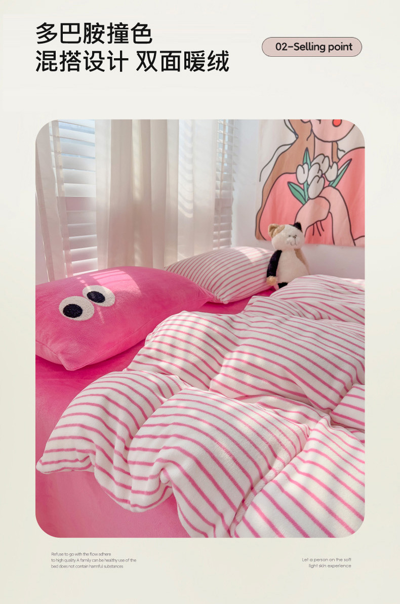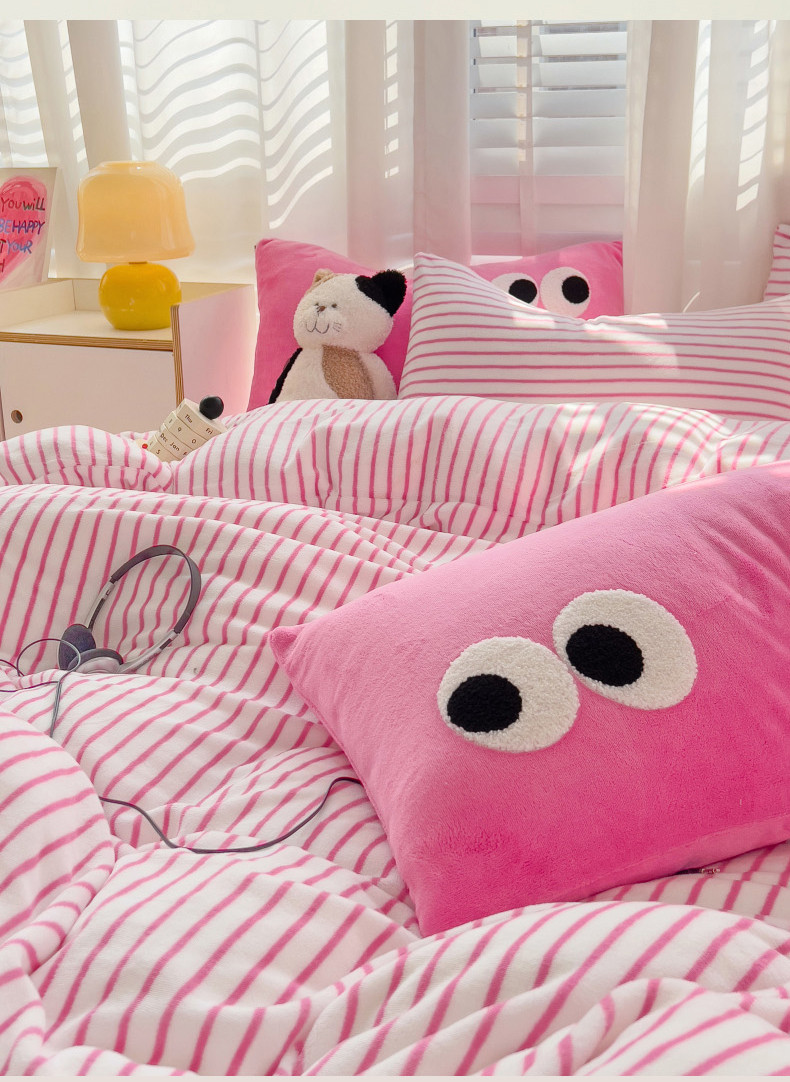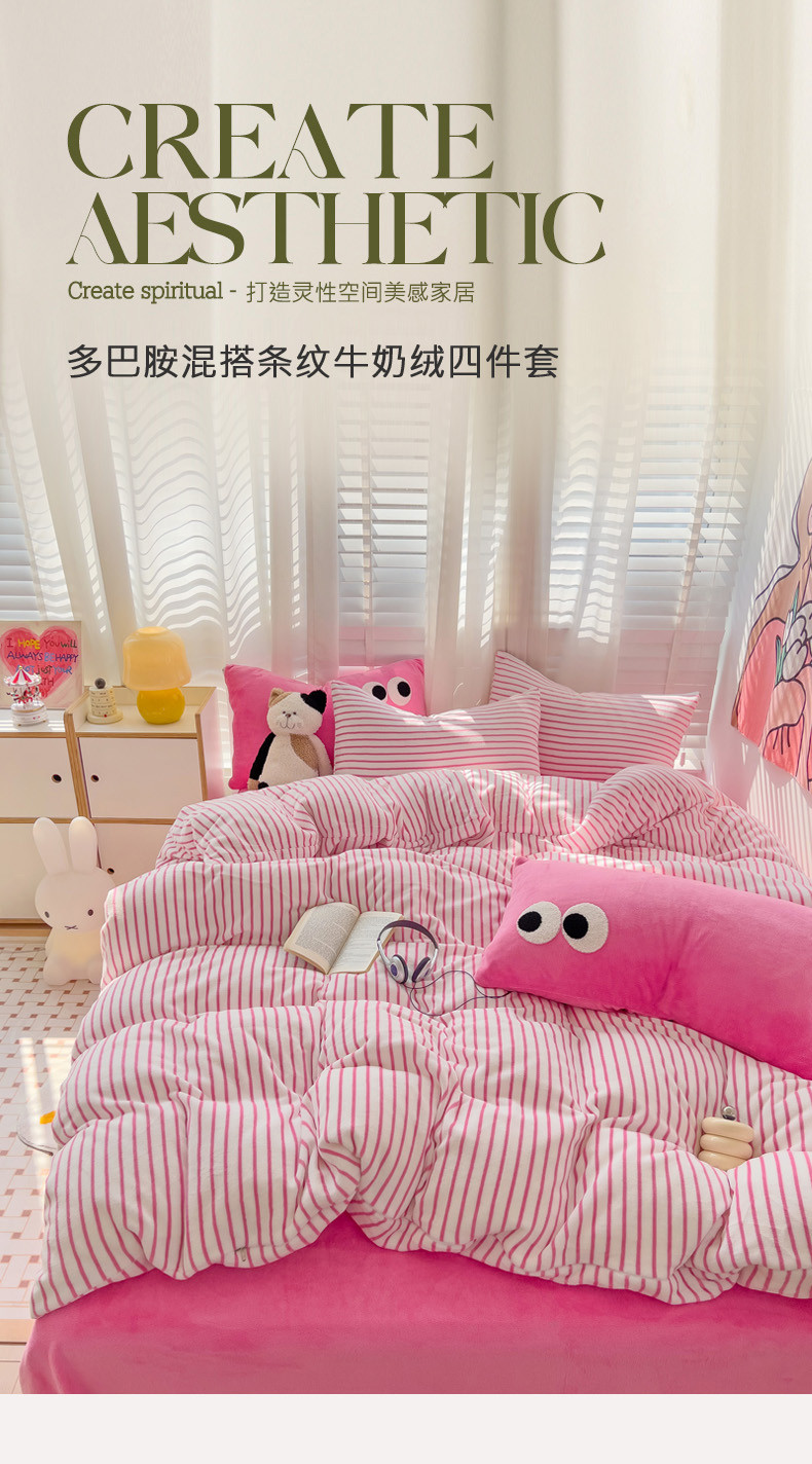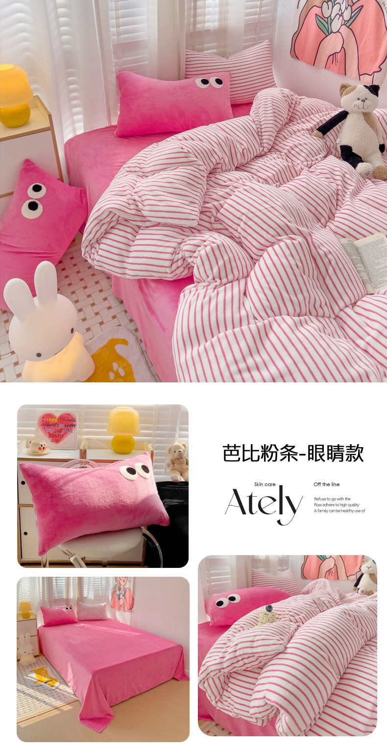 当前位置: 91家纺网 > 商品网购 > 床品套件 > 四件套 > 牛奶绒四件套 > 丽涵 2024秋冬新品牛奶绒博主风多巴胺条纹混搭保暖四件套 芭比粉条-眼睛款