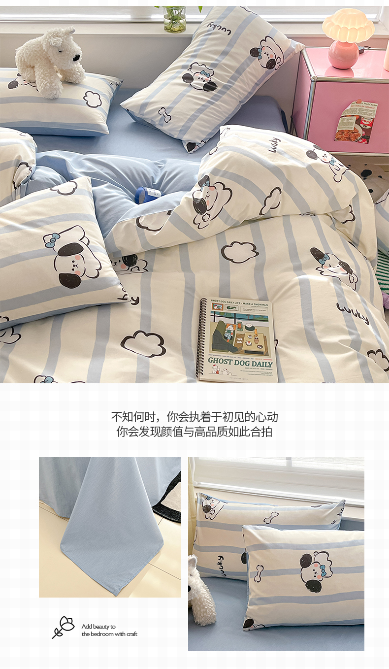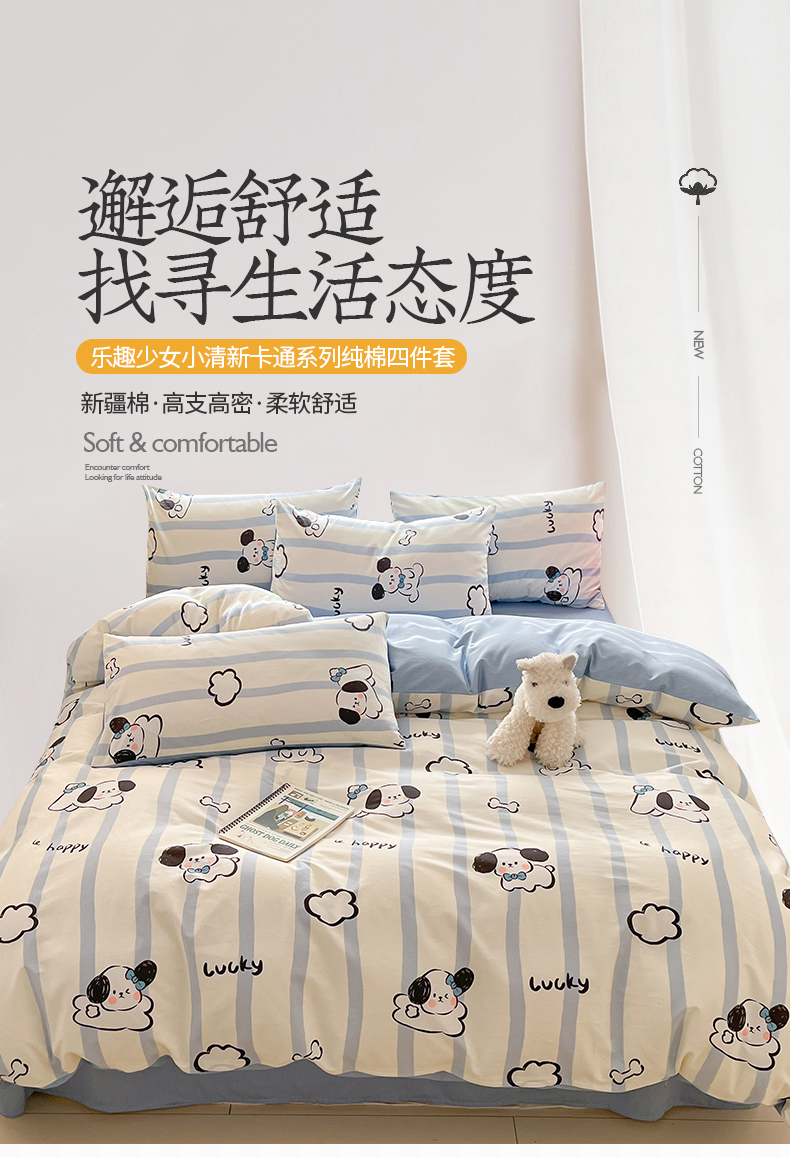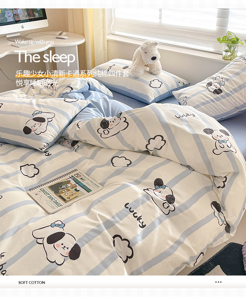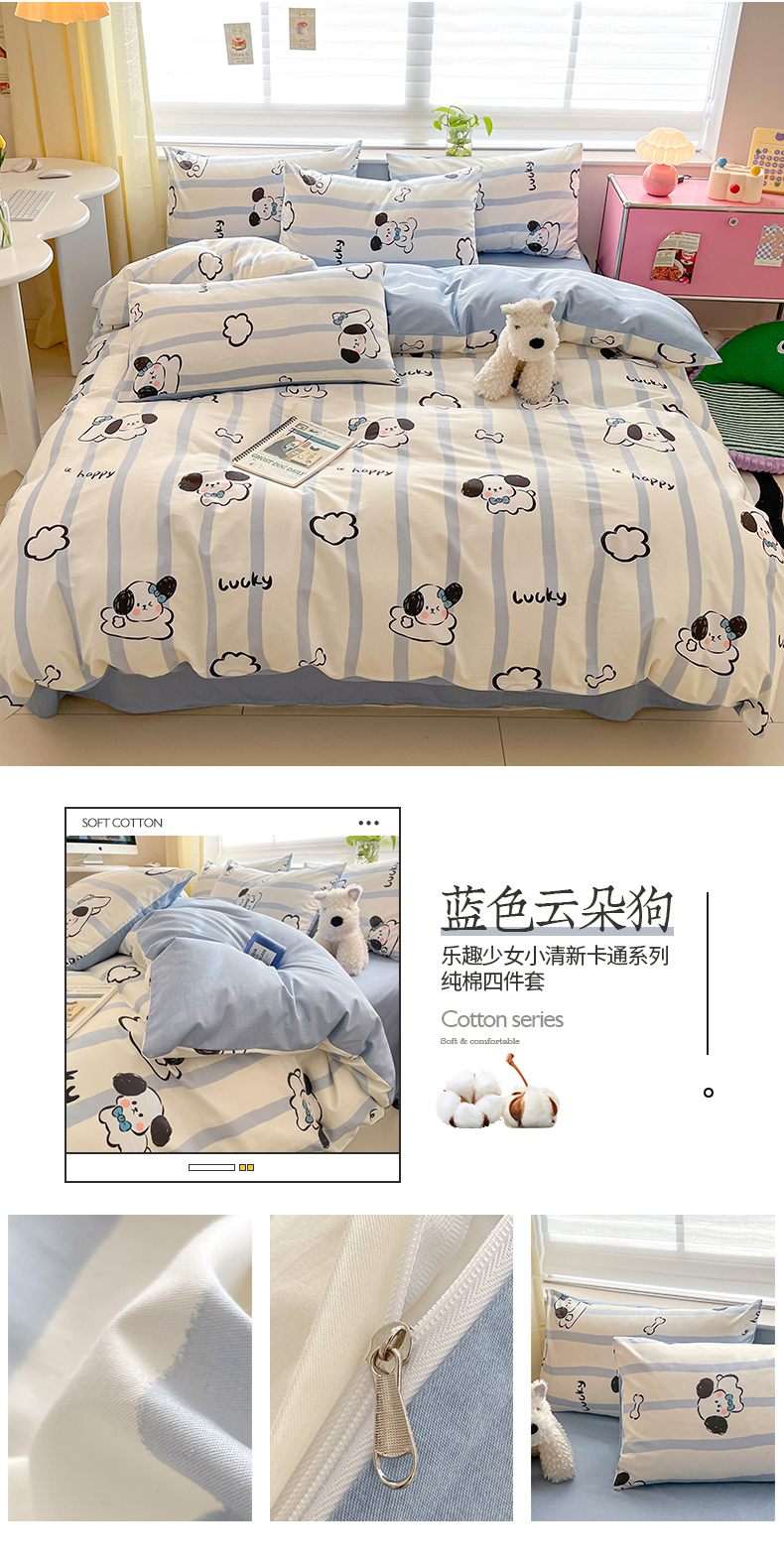 商品名称:桃子 2024新款纯棉13372萌趣少女小清新卡通四件套第二批 棉-蓝色云朵狗