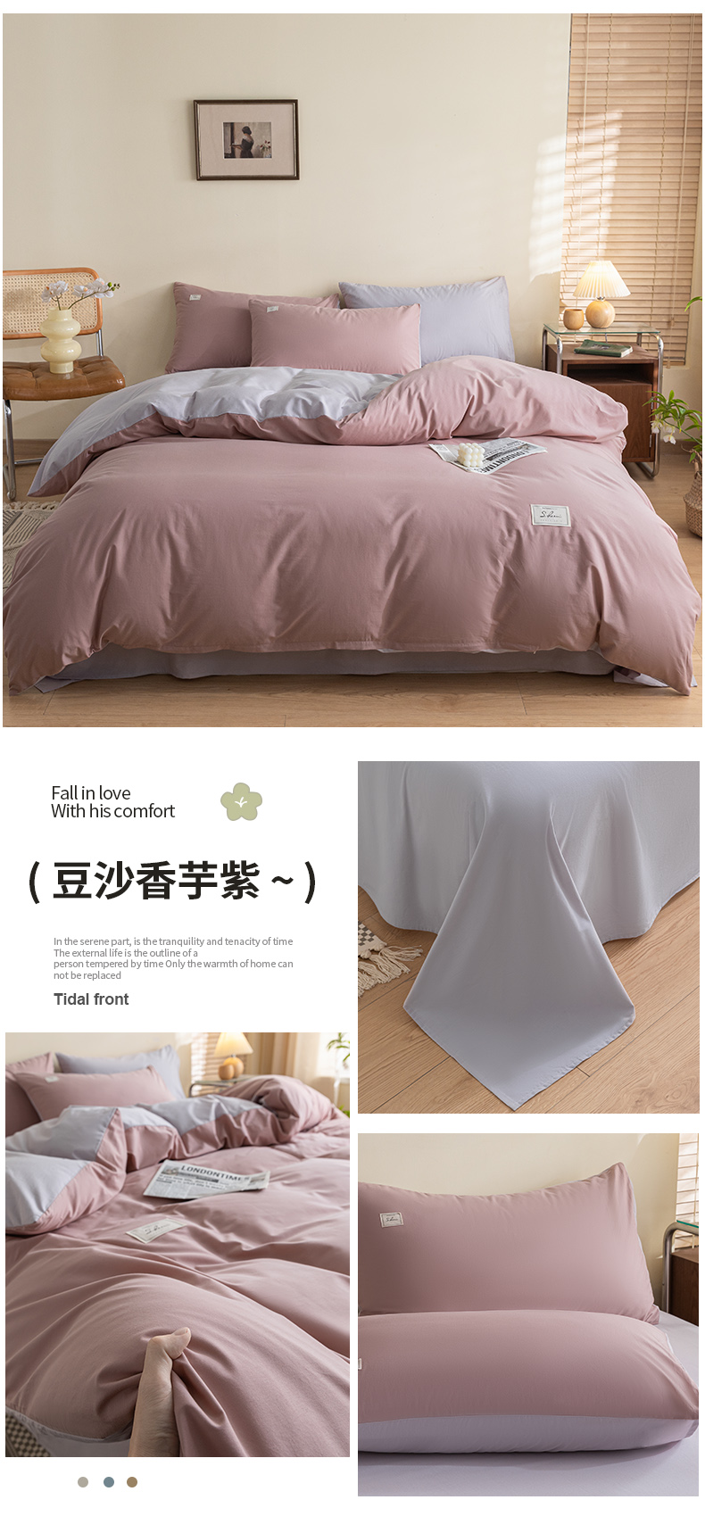 当前位置: 91家纺网 > 商品网购 > 床品套件 > 四件套 > 全棉普通四件套 > 木子家纺 2024新款纯色双拼40支全棉水洗棉四件套 豆沙香芋紫