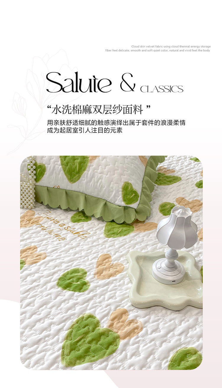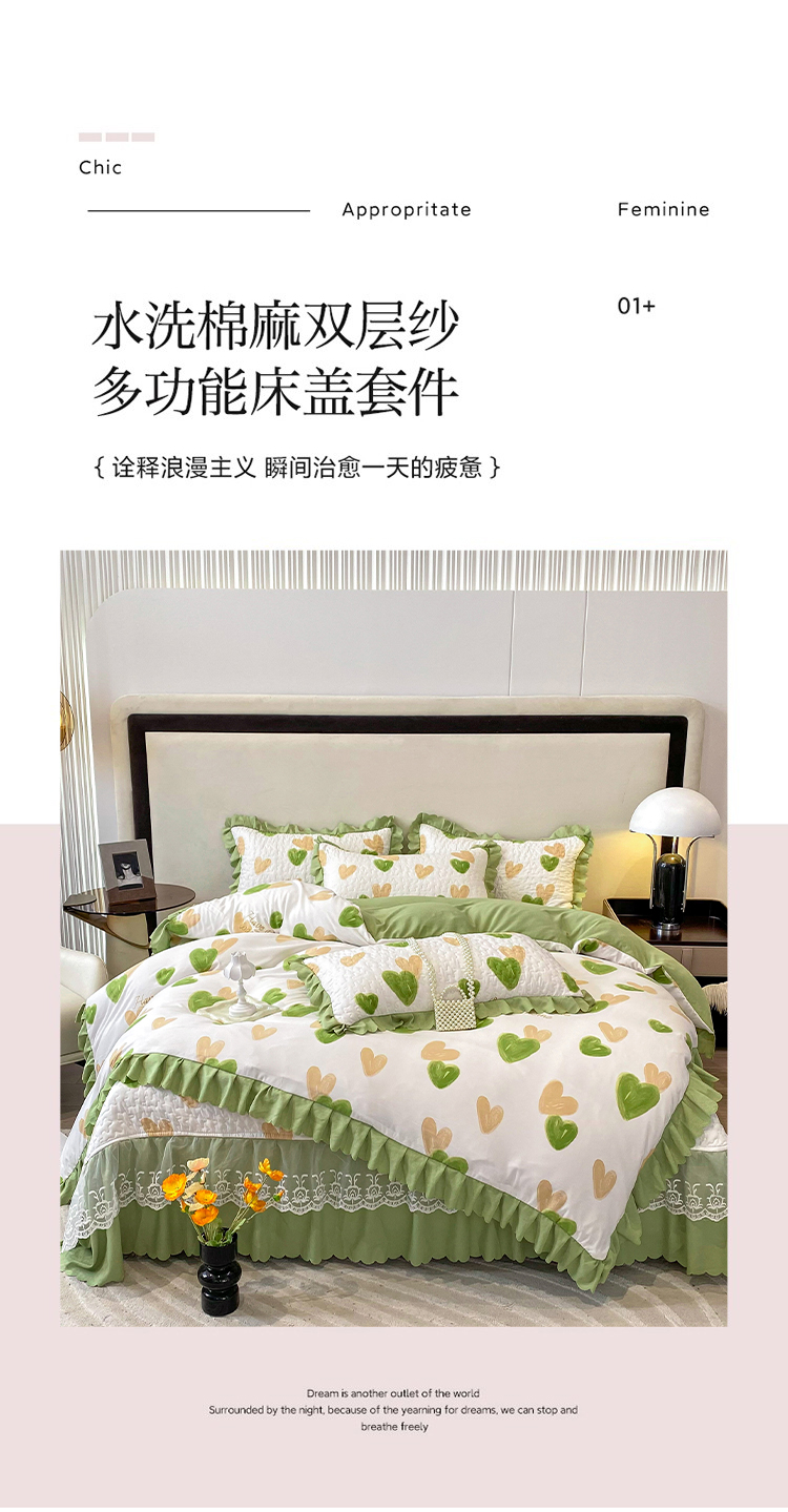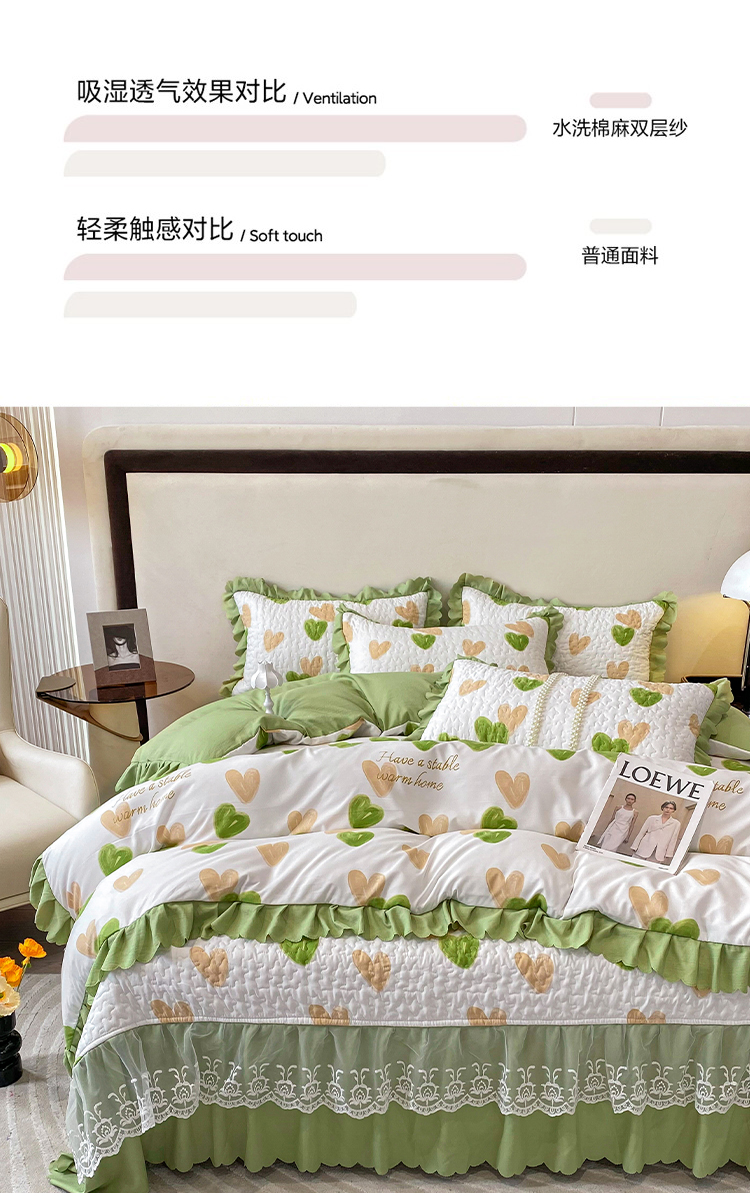 (总)A类双层纱棉麻床盖款夏被四件套蕾丝夹棉床裙大豆水洗棉夏凉被子,爱心--绿 (棉麻), 玫瑰兔 (棉麻), 甜心(棉麻), 寻梦(棉麻), 郁金香(棉麻),繁花似锦(棉麻), 熊依恋(棉麻),花颜(泡泡棉),花韵-婴儿蓝 (泡泡棉),花韵-樱花粉(泡泡棉), 温婉 (泡泡棉),心动—绿(泡泡棉),紫韵(泡泡棉),小桃兔兔(棉麻) ,情怀粉(棉麻), 玫瑰花(棉麻),小小心驼(棉麻),小小心紫(棉麻)