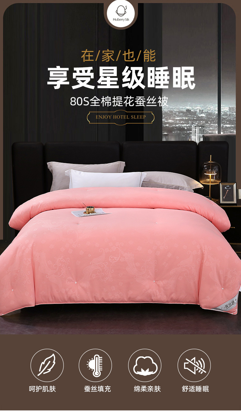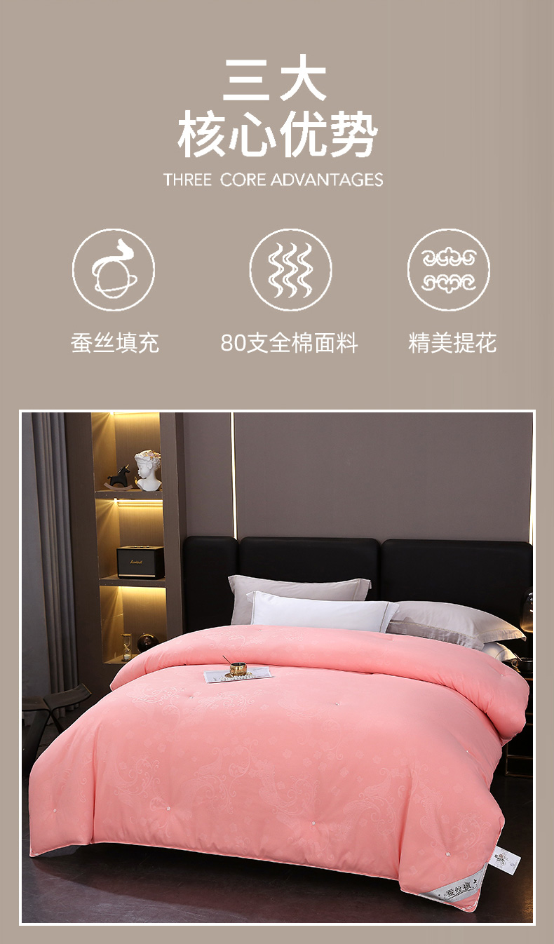 (总)恒鑫家纺 2025新款全棉提花蚕丝被,初恋粉,柔情玉,绅士灰,月光白,中国红,黄色
