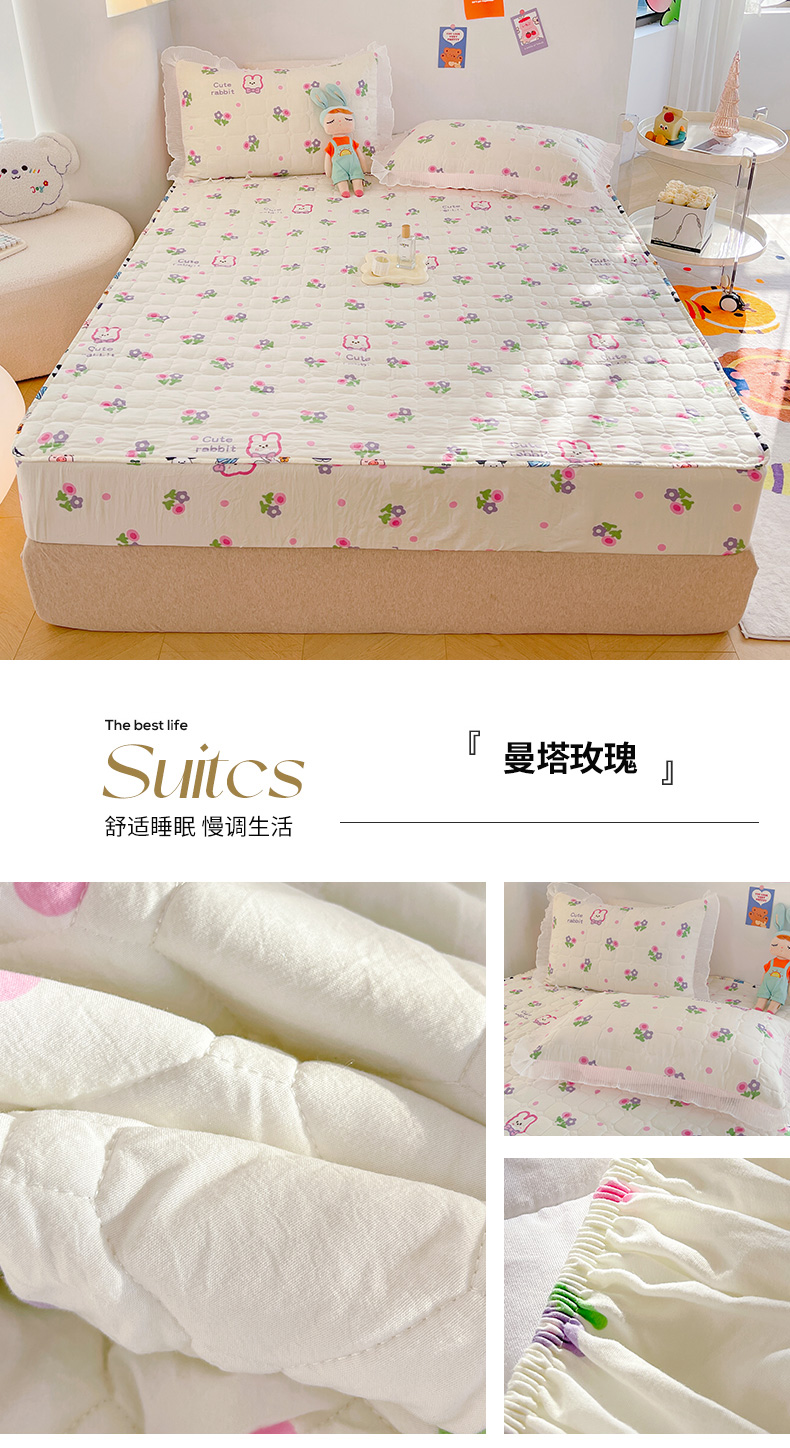 默忆 2025新款水洗棉双层纱印花夹棉床笠 曼塔玫瑰