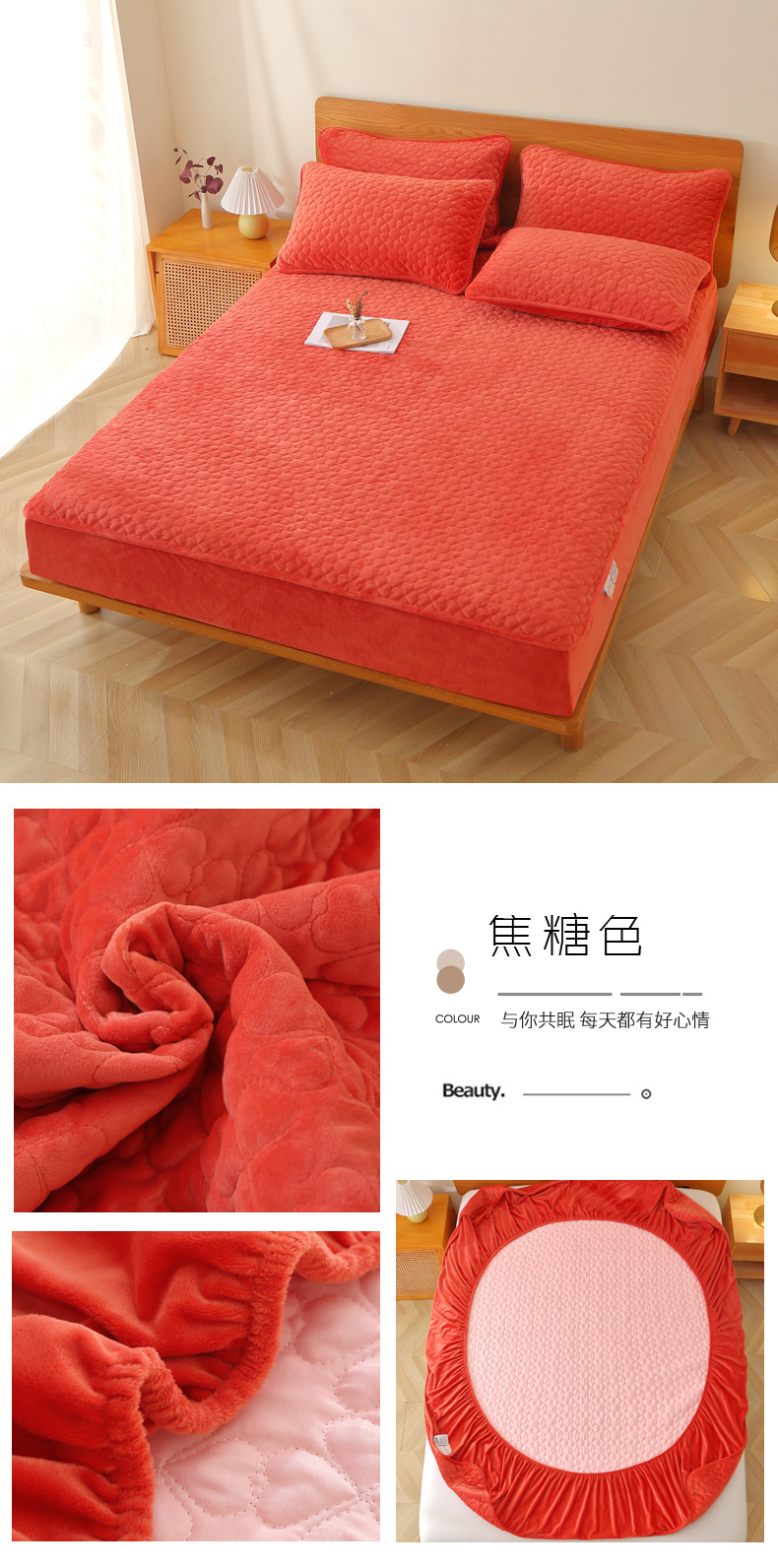 • 91家纺网 家纺一手货源 找家纺 芸锦豪 2024新款宝宝绒夹棉刺绣床笠 焦糖色