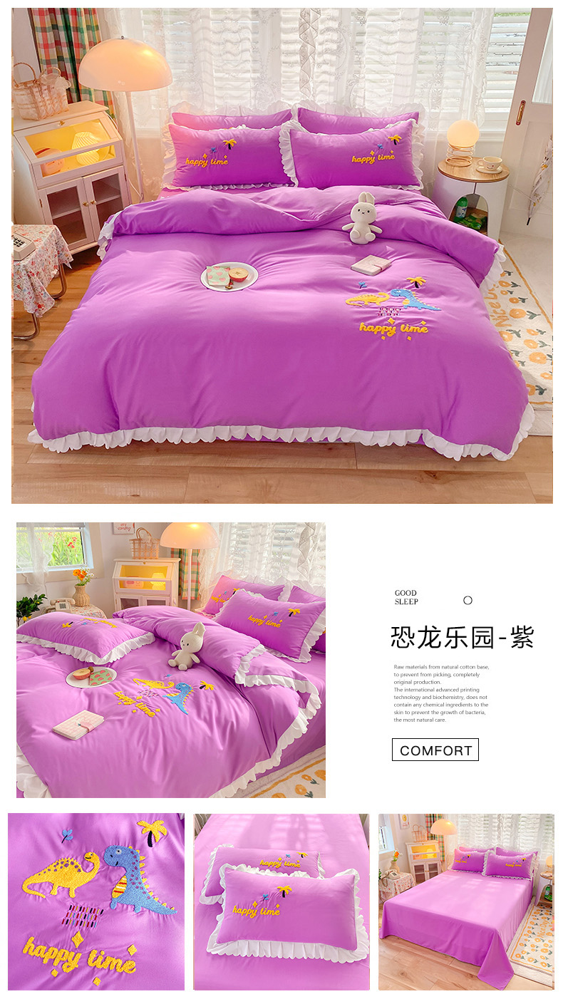 商品名称:秋艳家纺 2024新款韩式花边毛巾绣四件套 恐龙乐园-紫