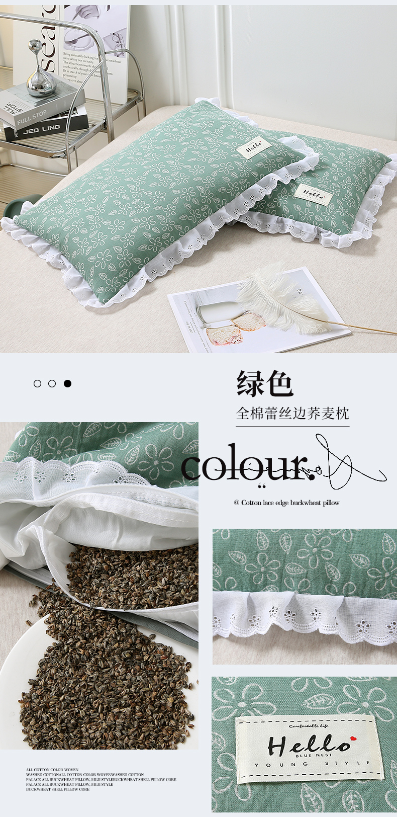 全棉蕾丝边荞麦枕-绿色