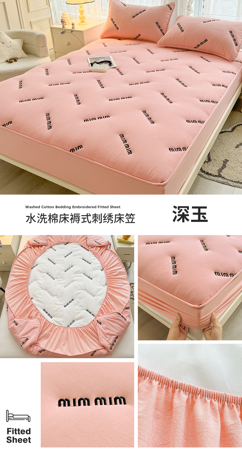 予梦家纺 2024新款ins风刺绣夹棉床笠床垫保护套 字母-深玉