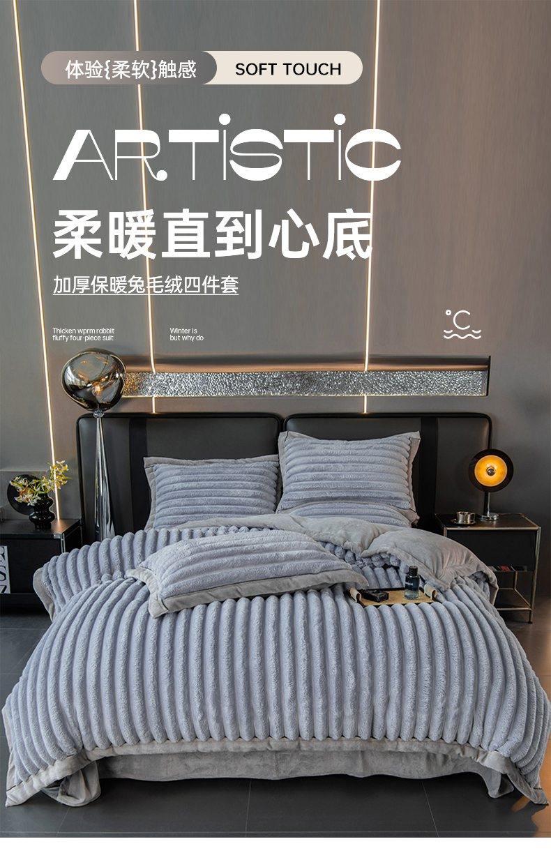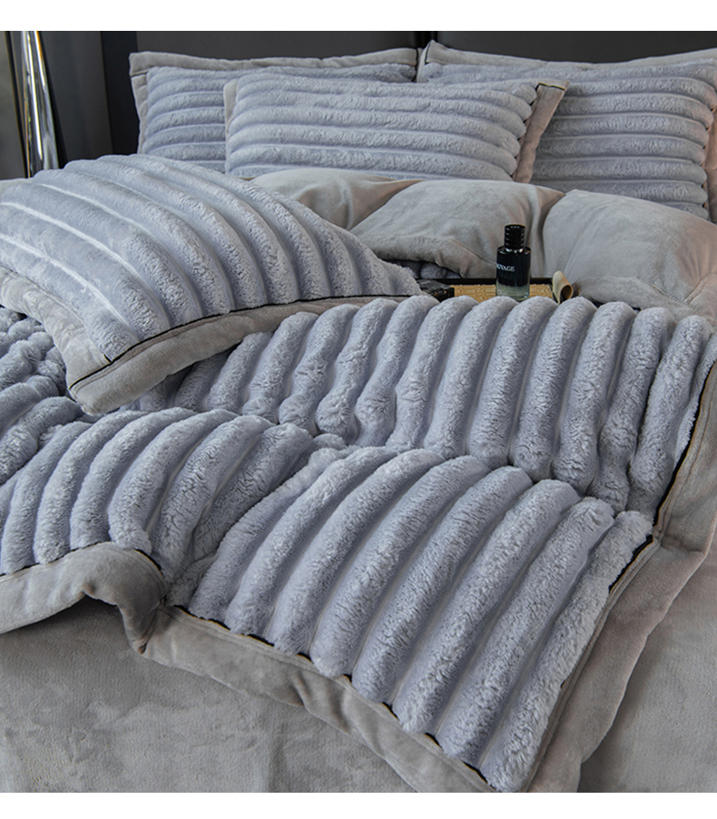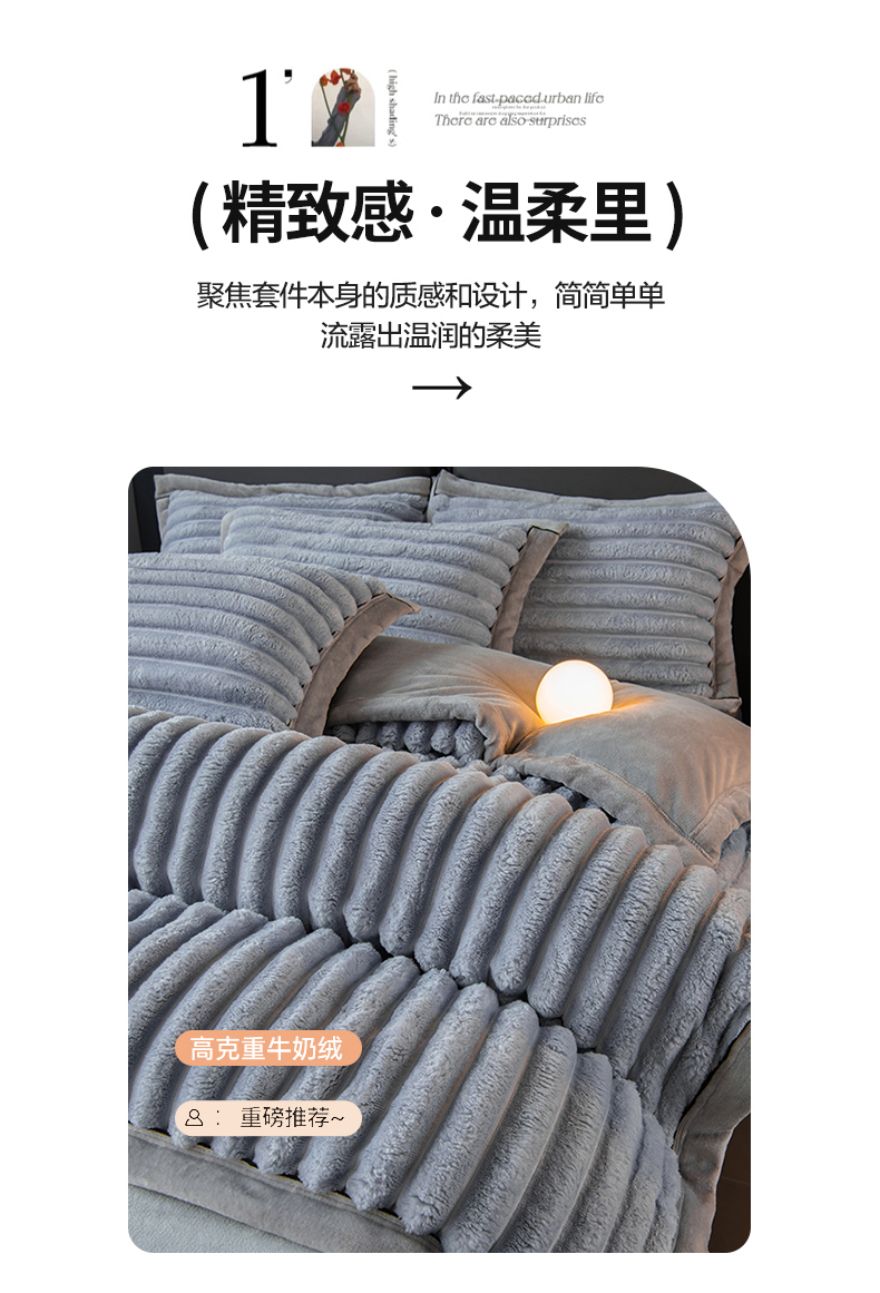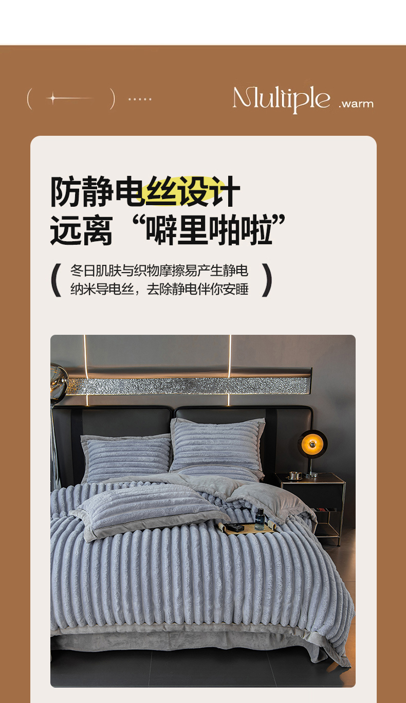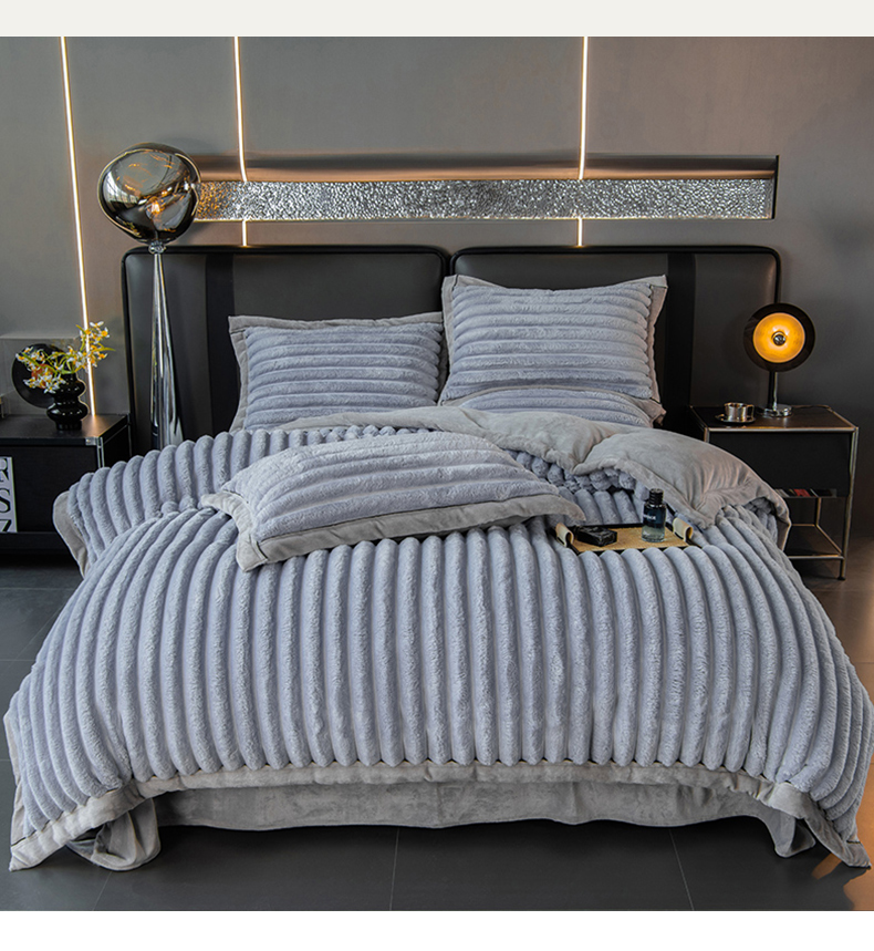 商品名称:妮恒美家纺 2024新款400克超厚竖条兔毛绒四件套 竖条兔绒-典雅灰