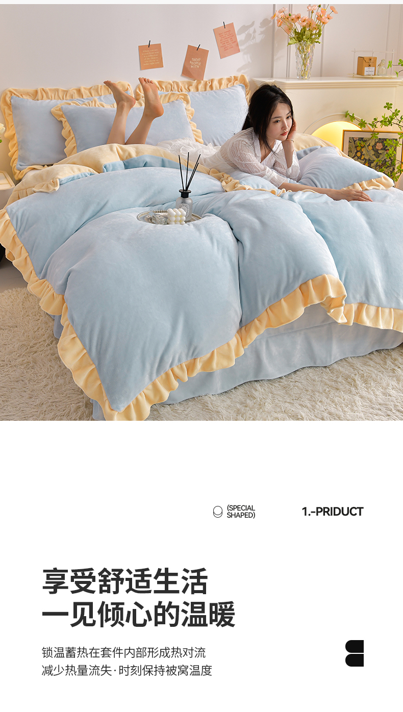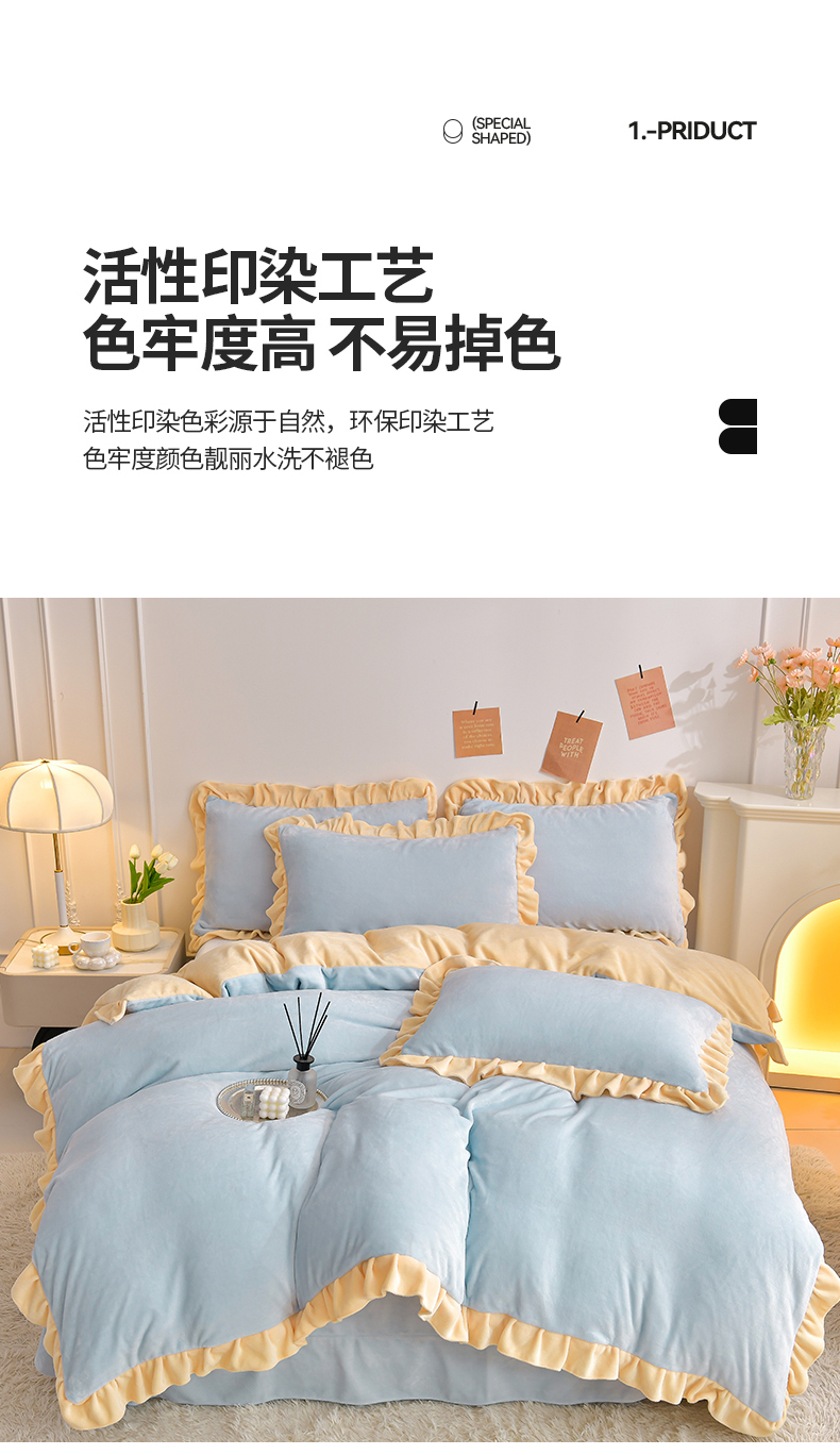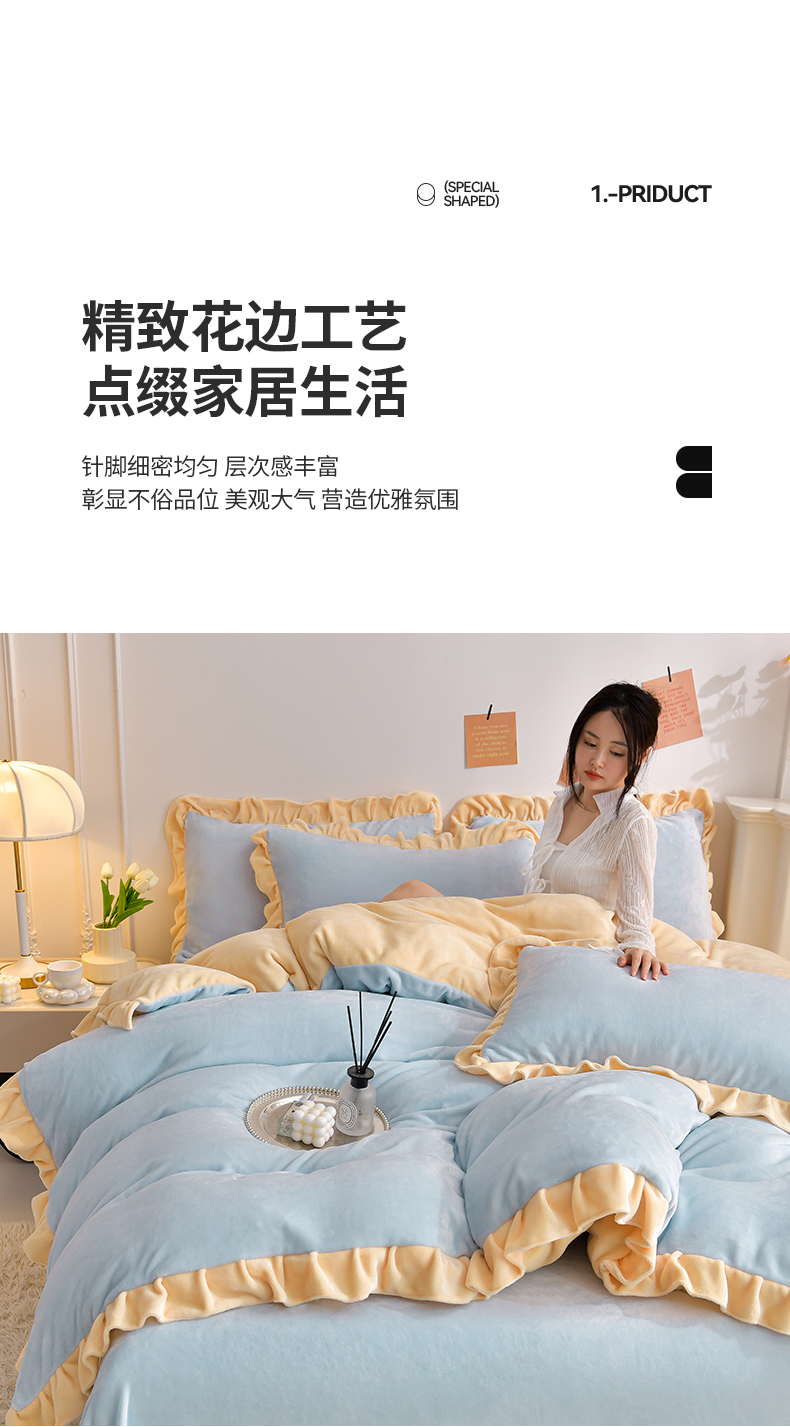 商品名称:妮恒美 2024新款韩版牛奶绒四件套 天海蓝+奶黄