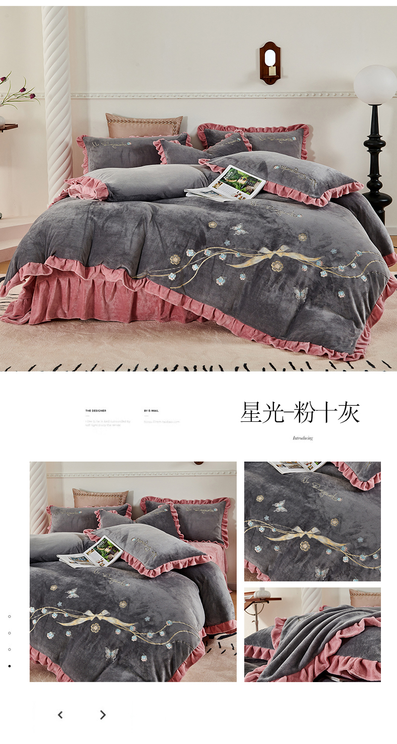 商品名称:慕克斯 2024新款重工绣花牛奶绒四件套星光 星光-粉十灰