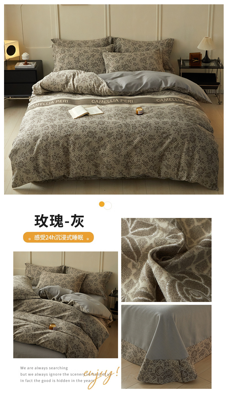 启程家纺 2024全棉生态磨毛印花四件套 玫瑰-灰