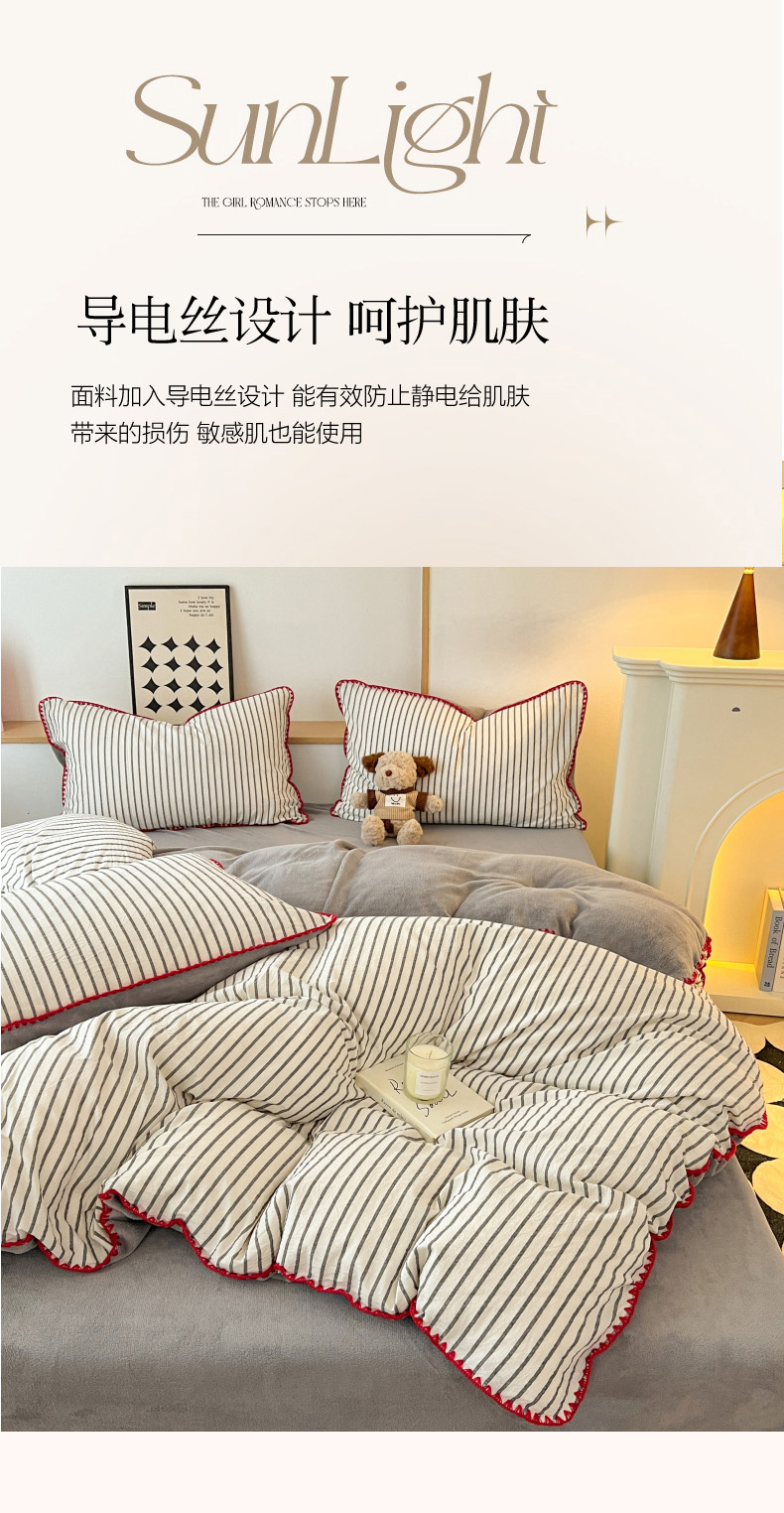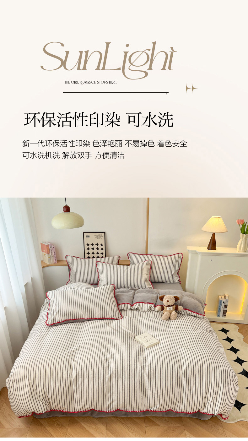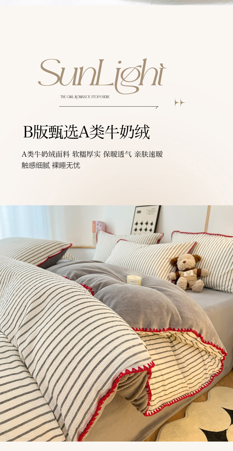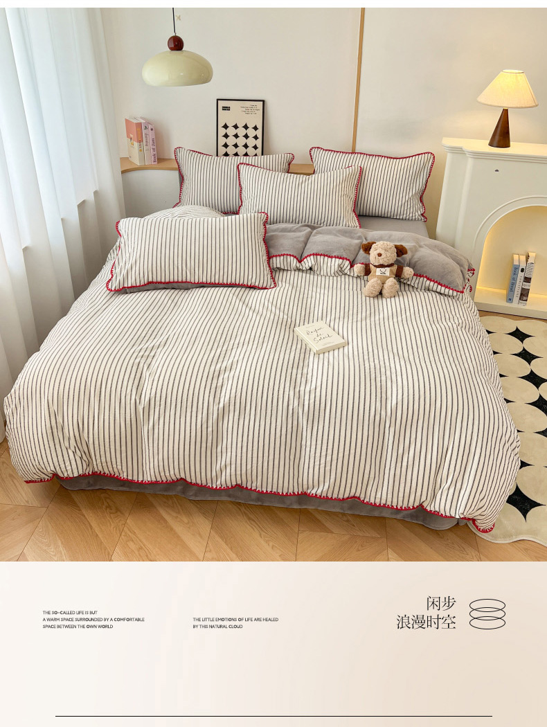 柠馨 2024新款简约时尚全棉牛奶绒棉绒四件套 棉绒黑条红