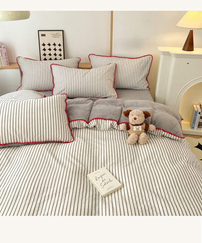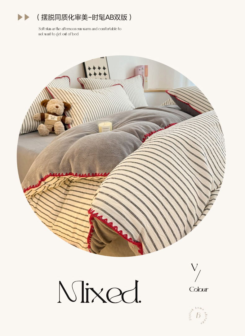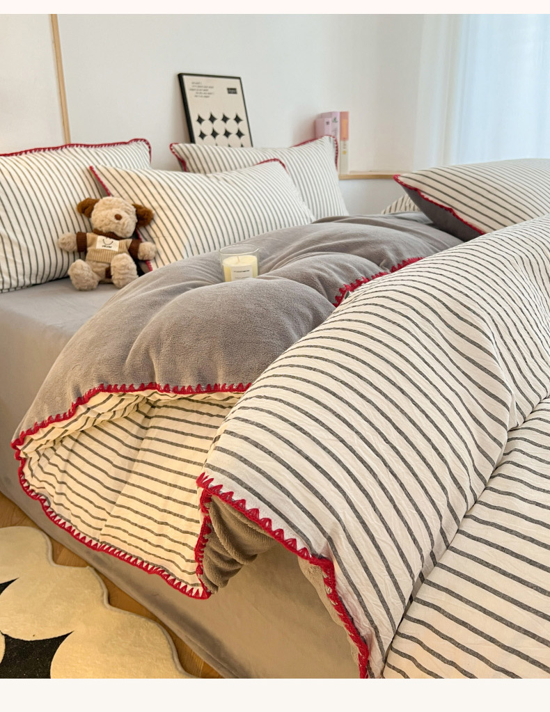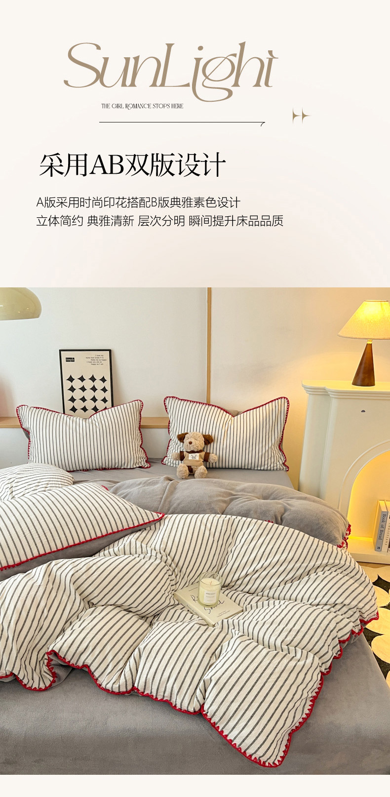 柠馨 2024新款简约时尚全棉牛奶绒棉绒四件套 棉绒黑条红