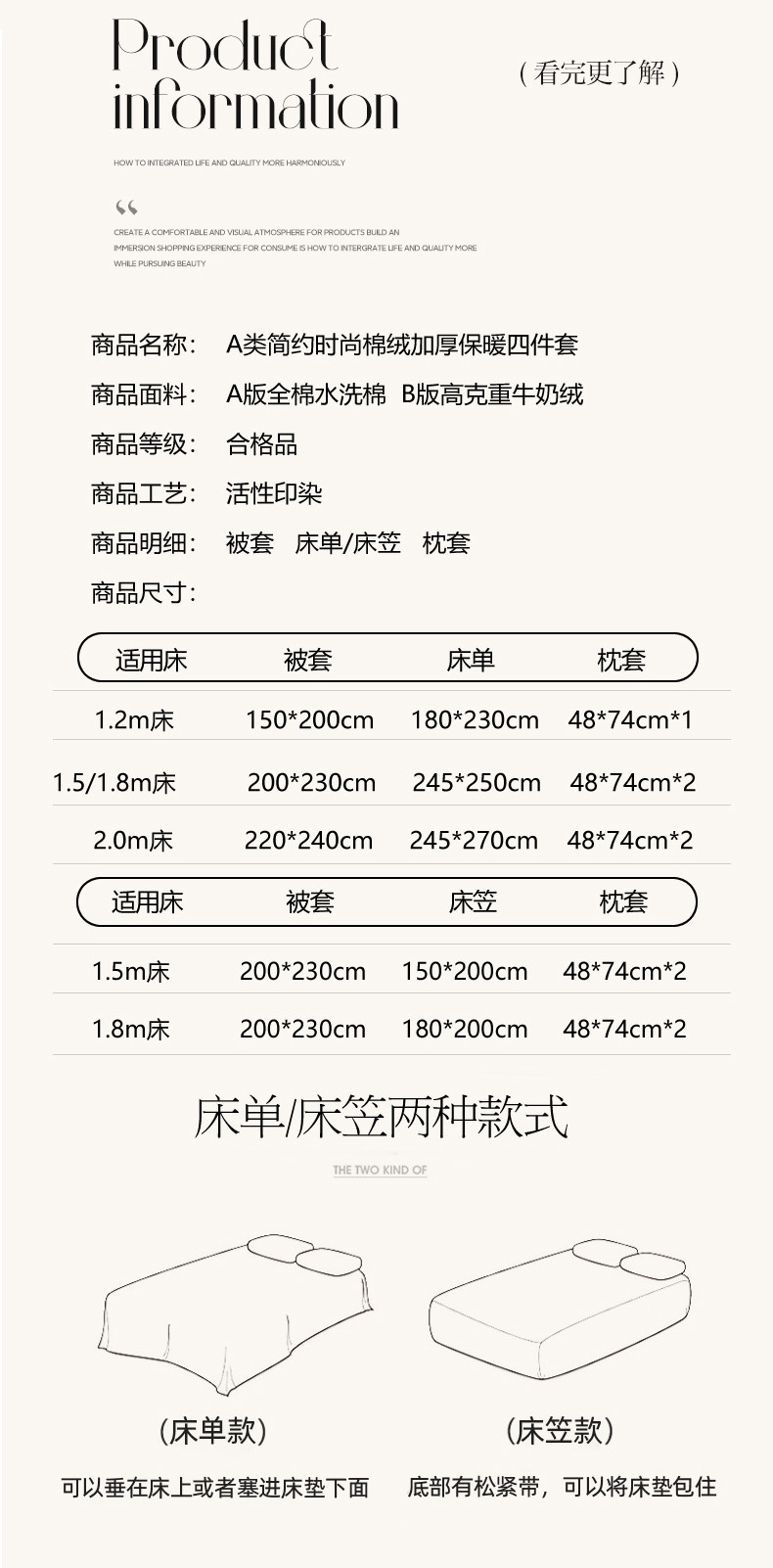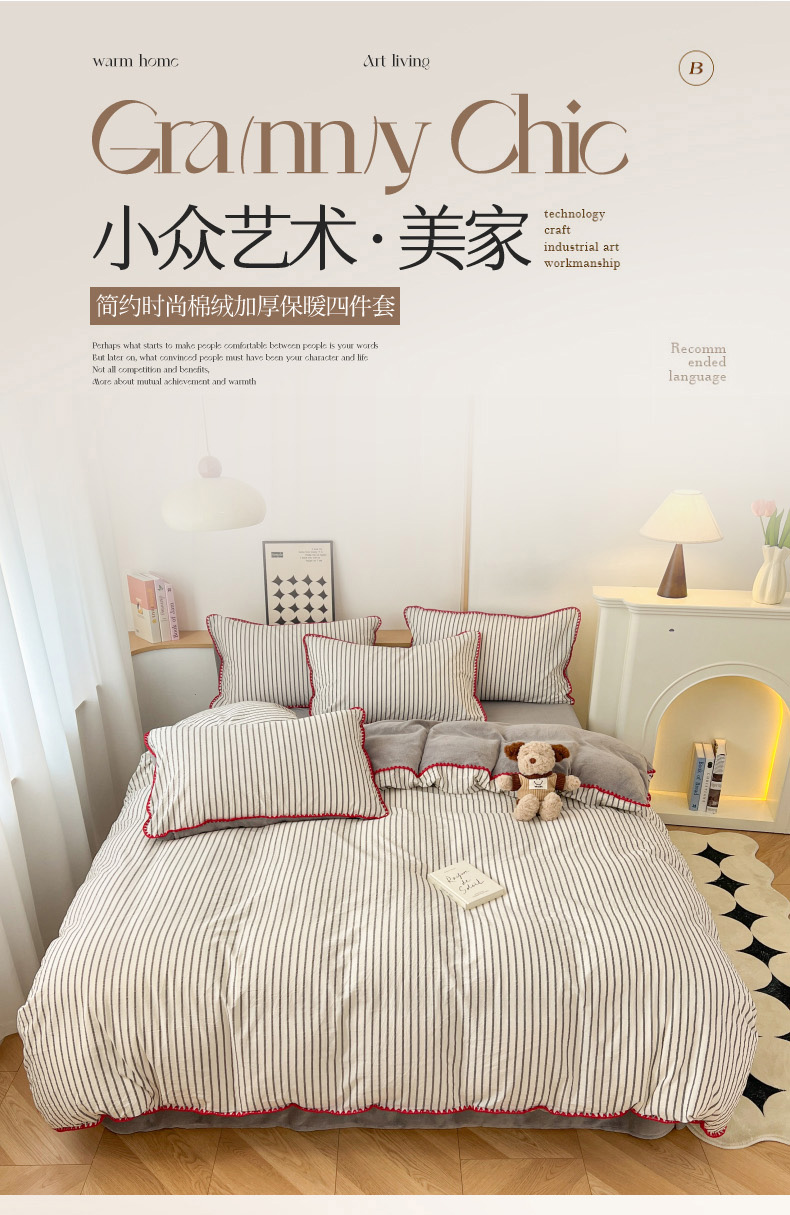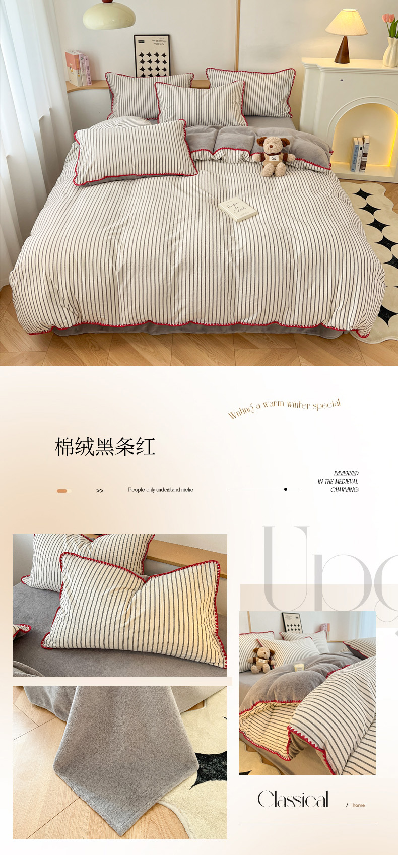 商品名称:柠馨 2024新款简约时尚全棉牛奶绒棉绒四件套 棉绒黑条红