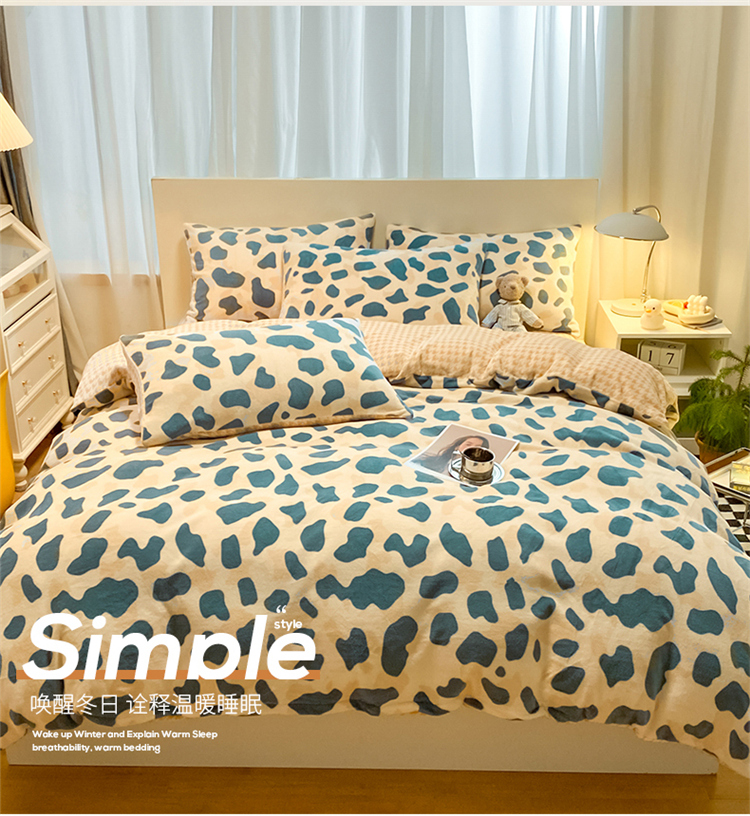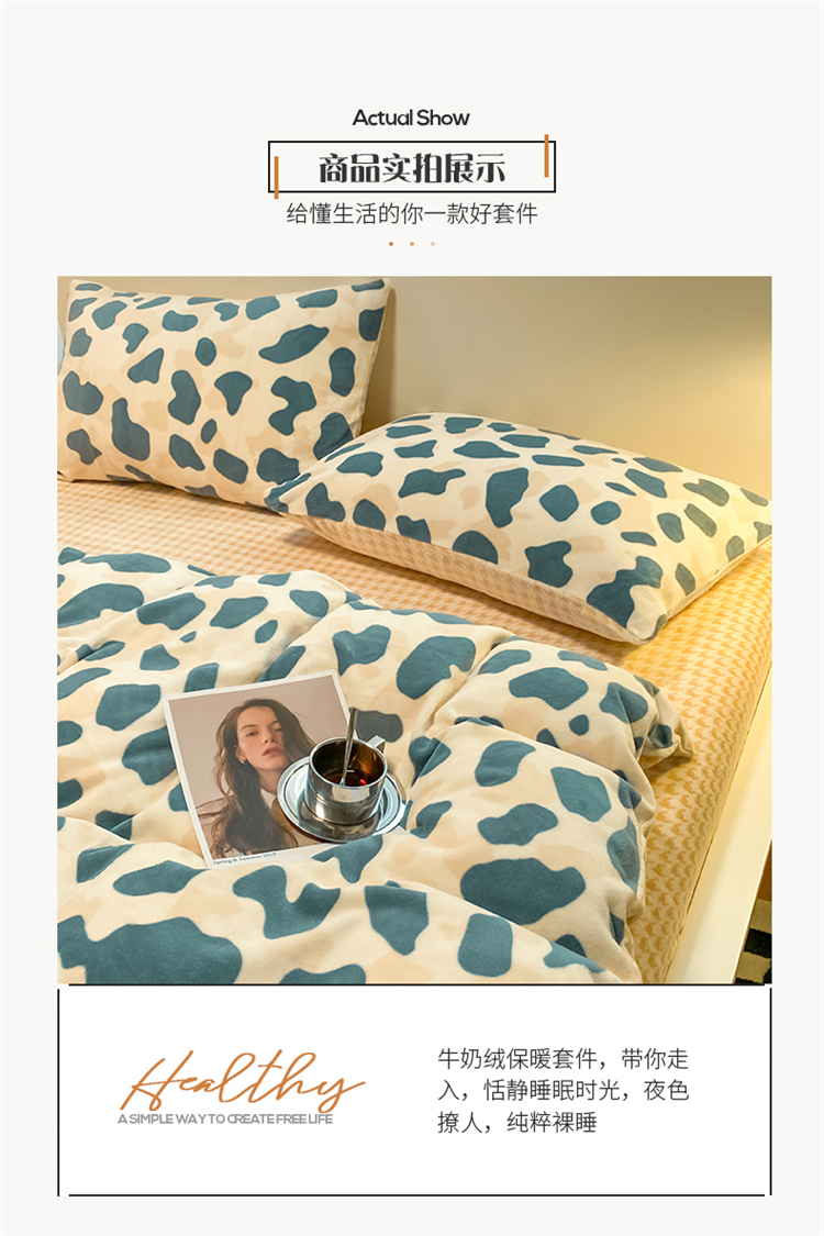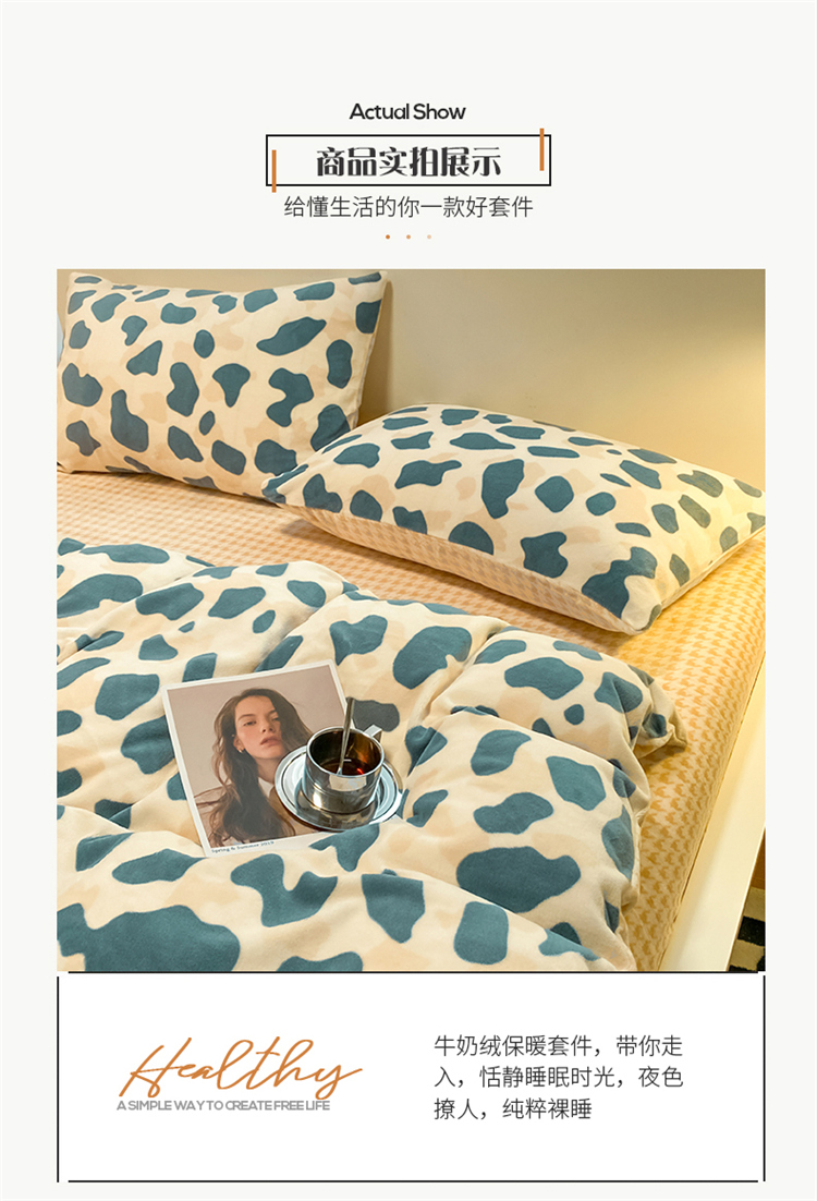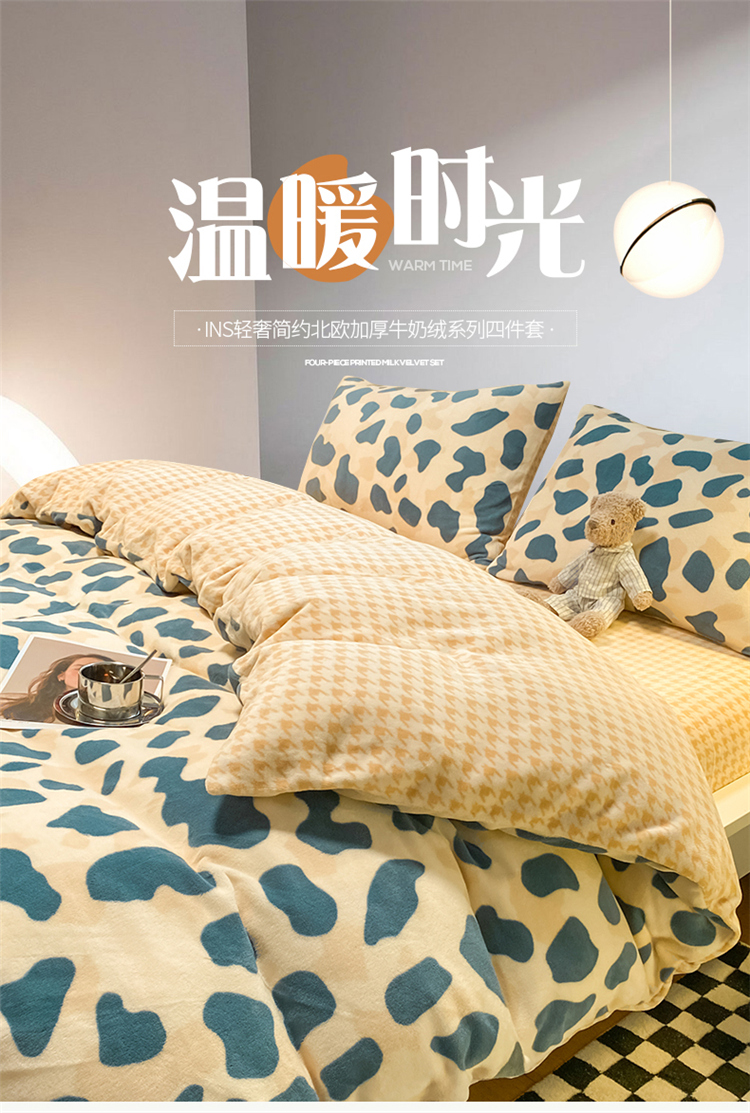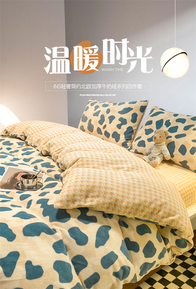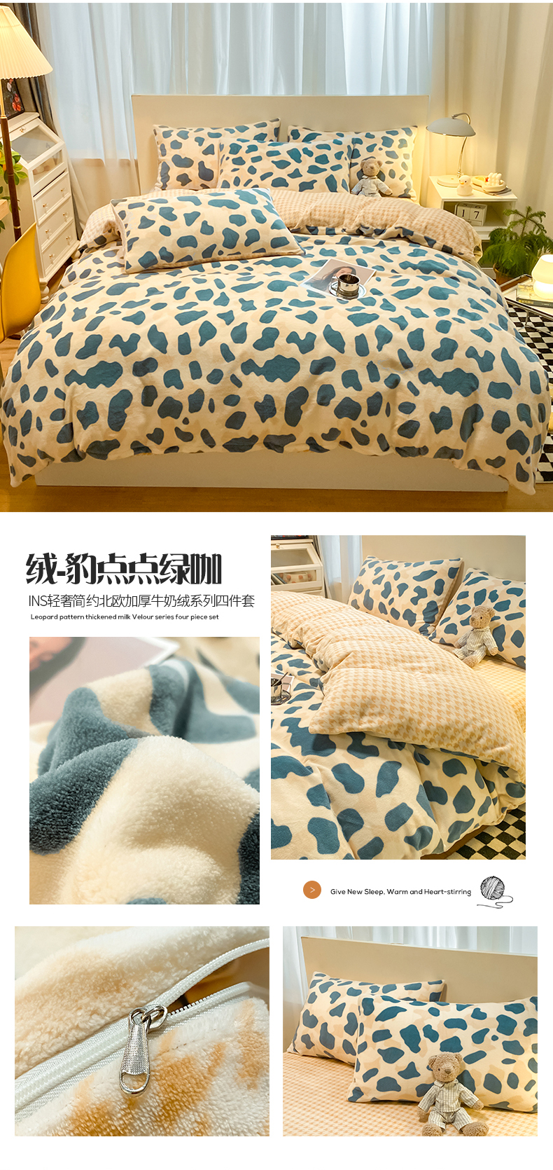 商品名称:2024新款时尚高级经典轻奢北欧简约加厚200克牛奶绒四件套 绒-豹点点绿咖