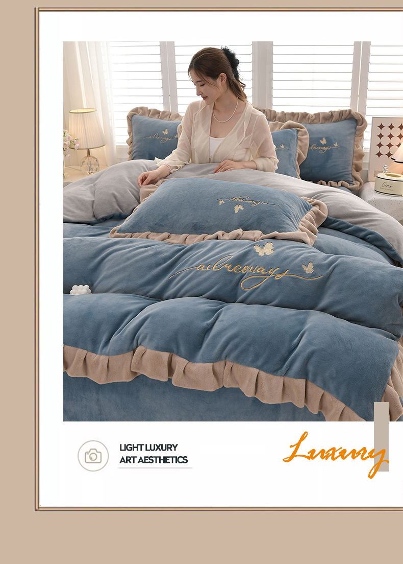 氧家 2024新款韩版牛奶绒绣花四件套--蝶恋 羽蝶-槟利兰