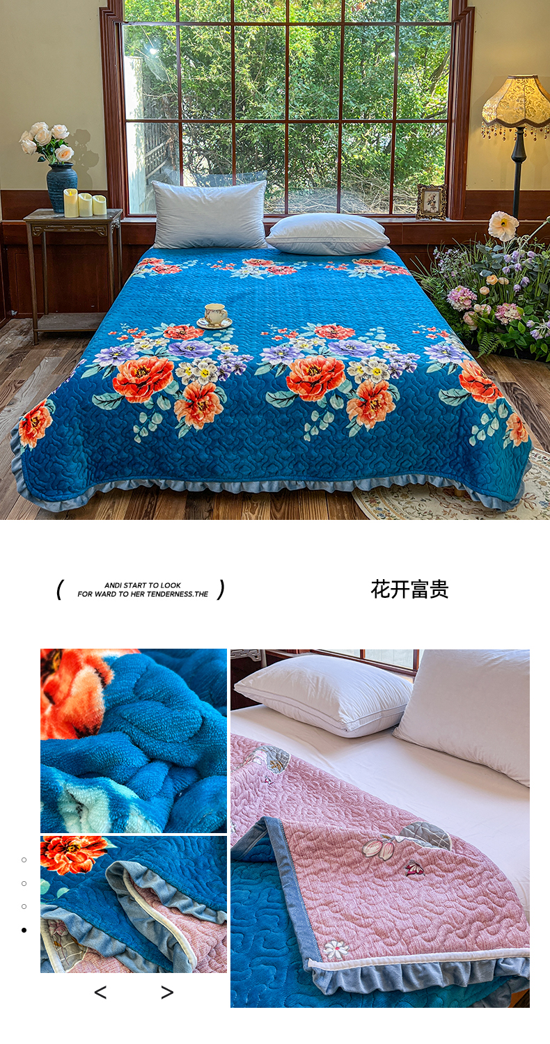 商品名称:悦织湾家纺 2025新款印花牛奶绒花边夹棉床盖 富贵花开
