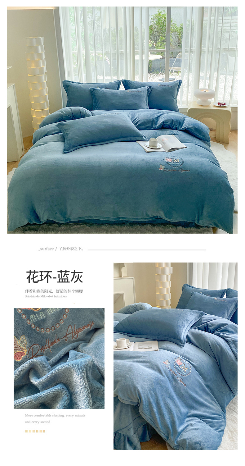 商品名称:美伦美焕 2024新款牛奶绒绣花四件套 花环-蓝灰