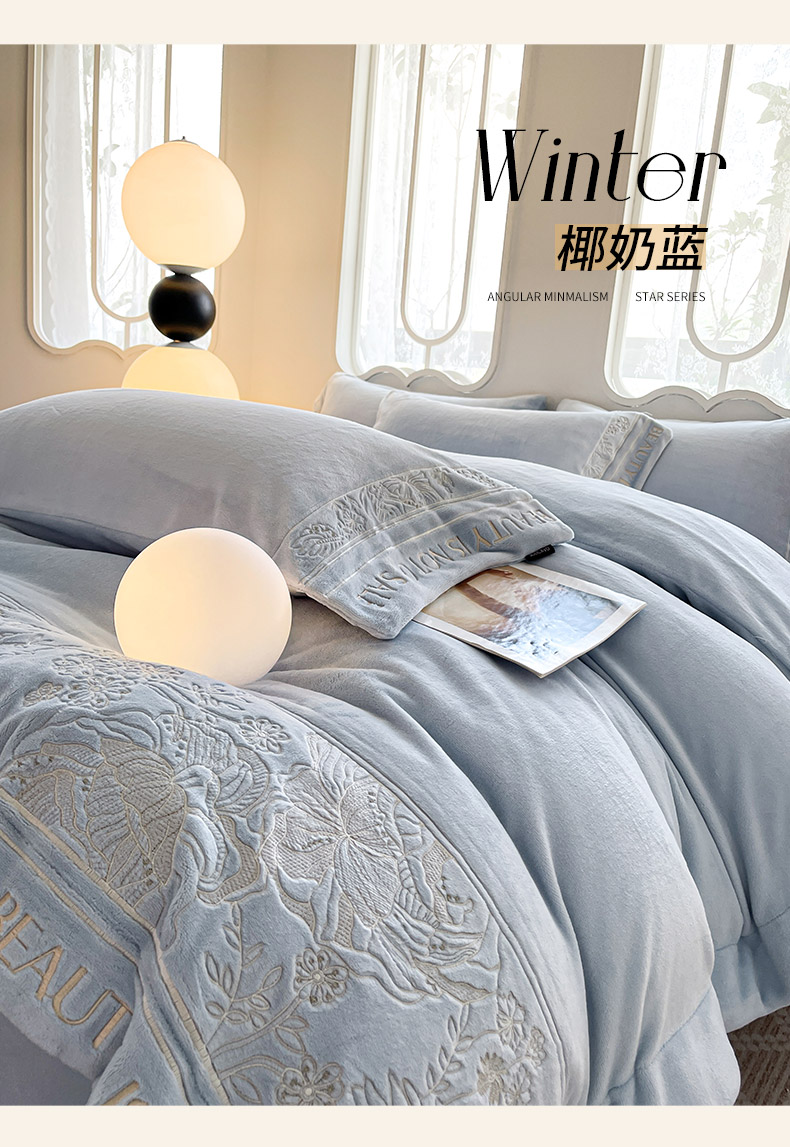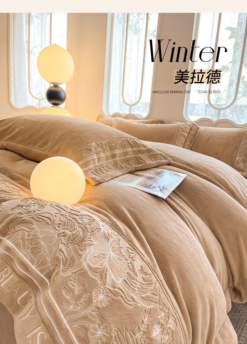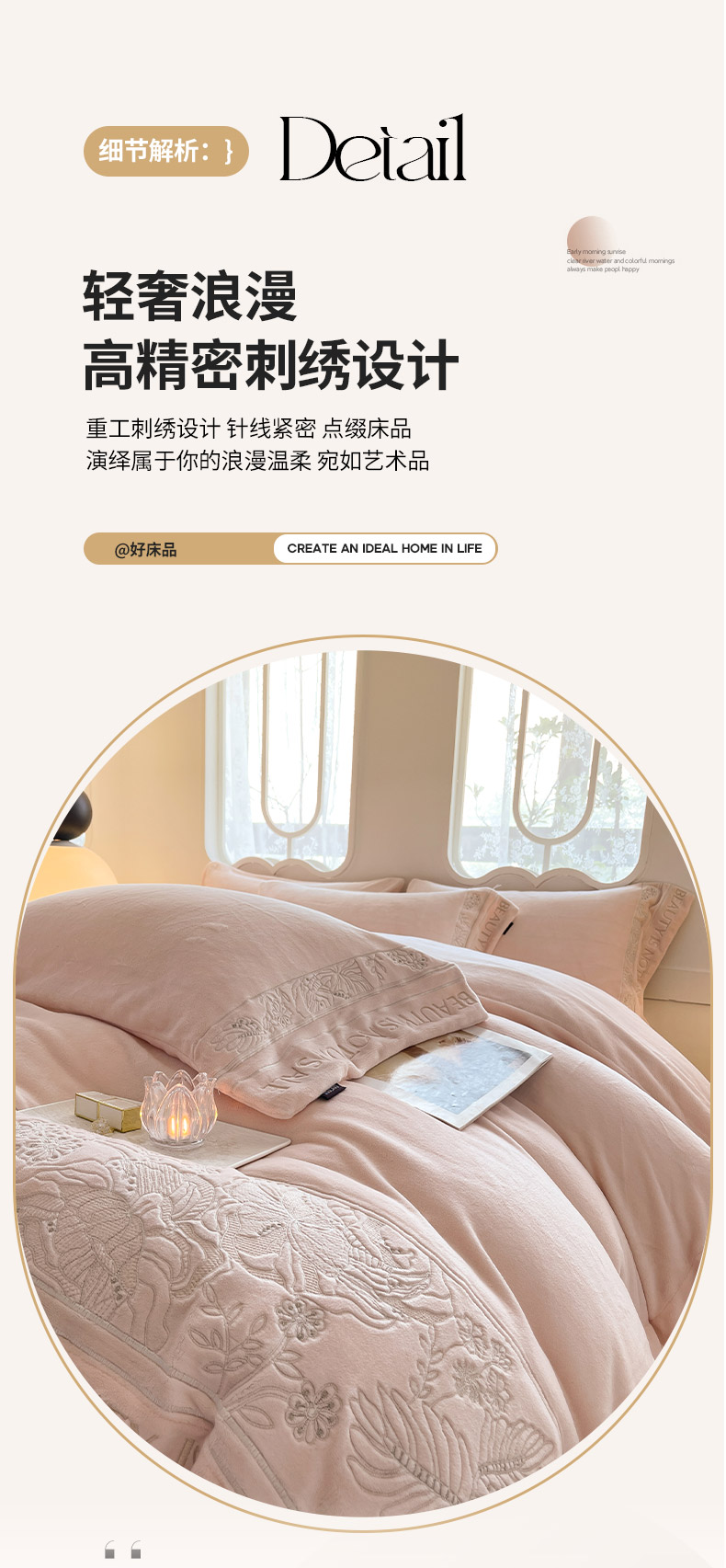 (总)秋冬款9斤重高级感雕花牛奶绒四件套加厚珊瑚绒加绒被套床单床笠床上用品