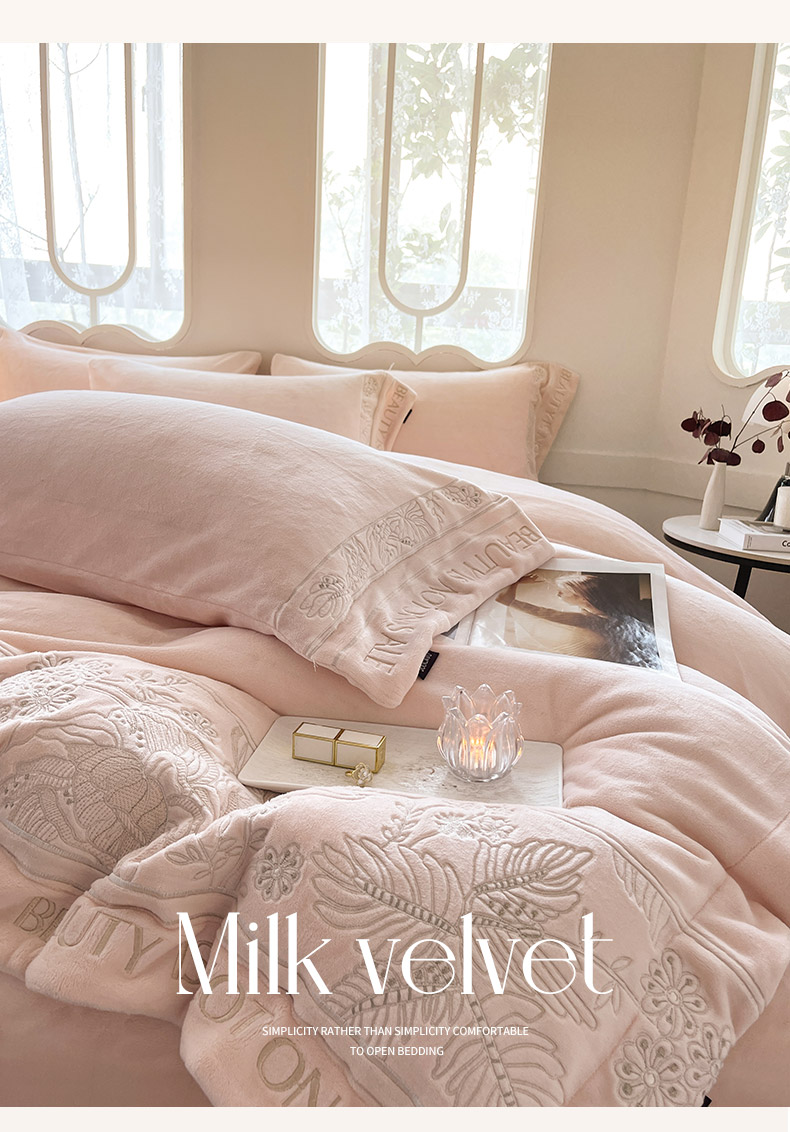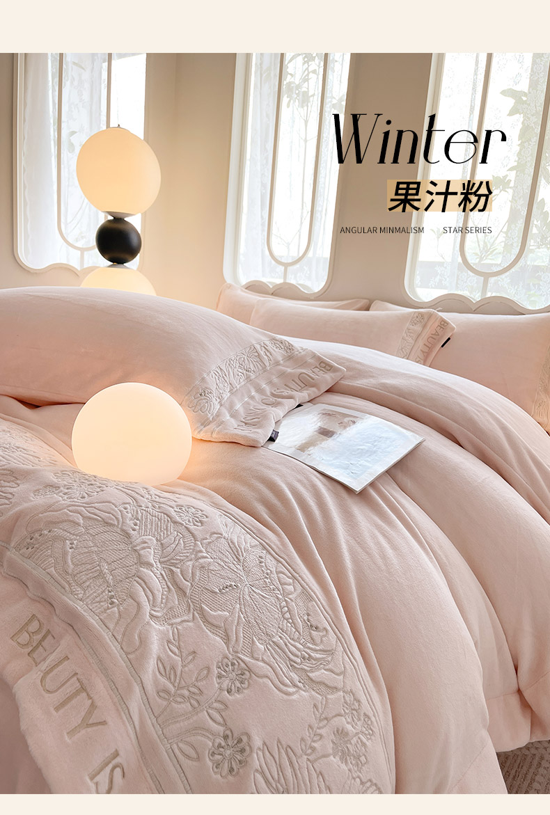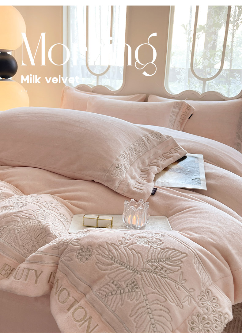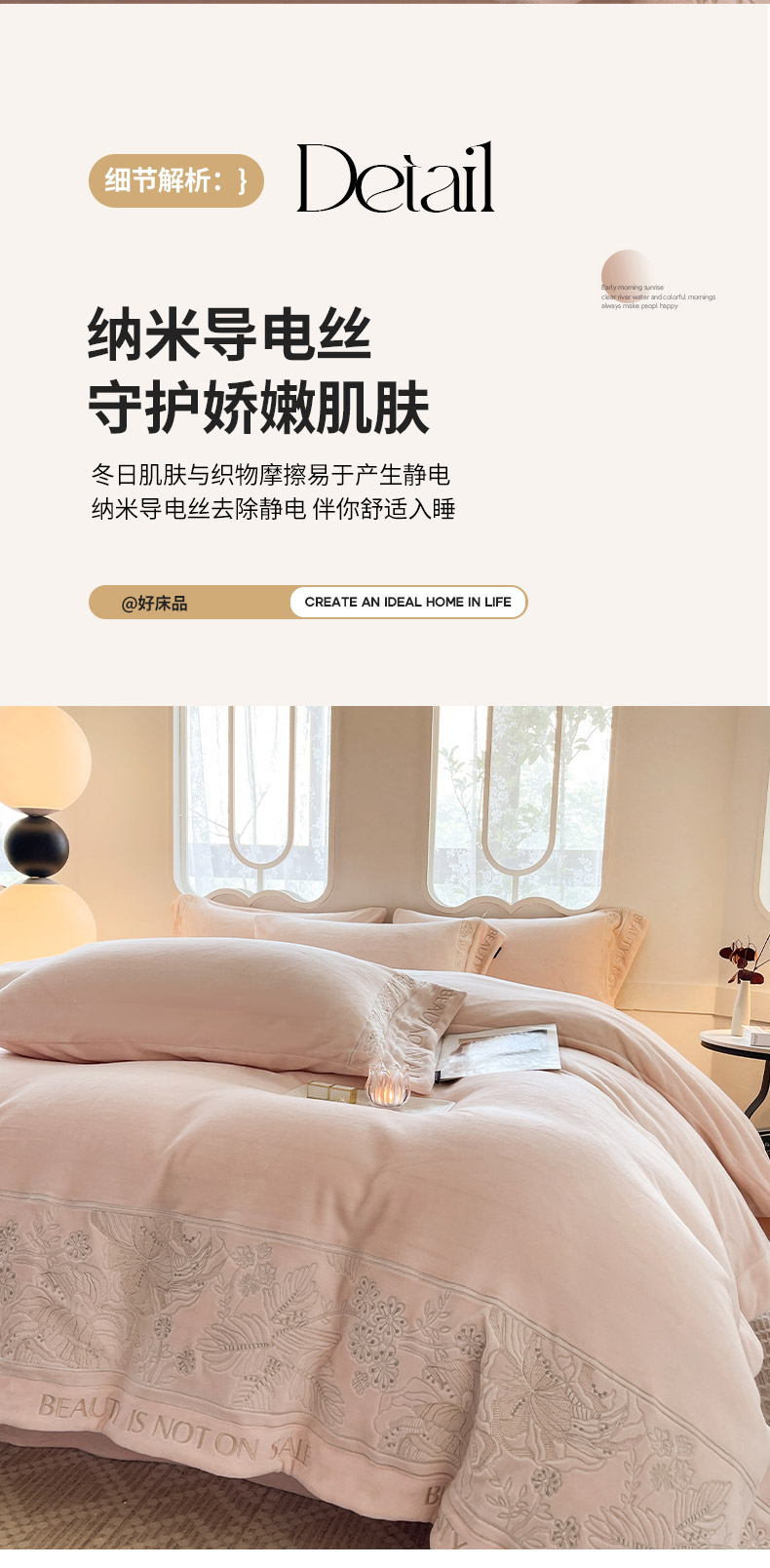 (总)秋冬款9斤重高级感雕花牛奶绒四件套加厚珊瑚绒加绒被套床单床笠床上用品