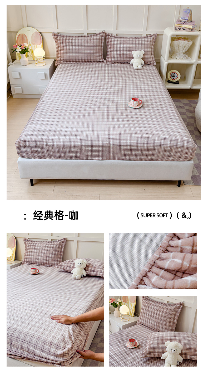 商品名称:慕克斯家纺 2024新款加厚牛奶绒印花床笠 经典格-咖