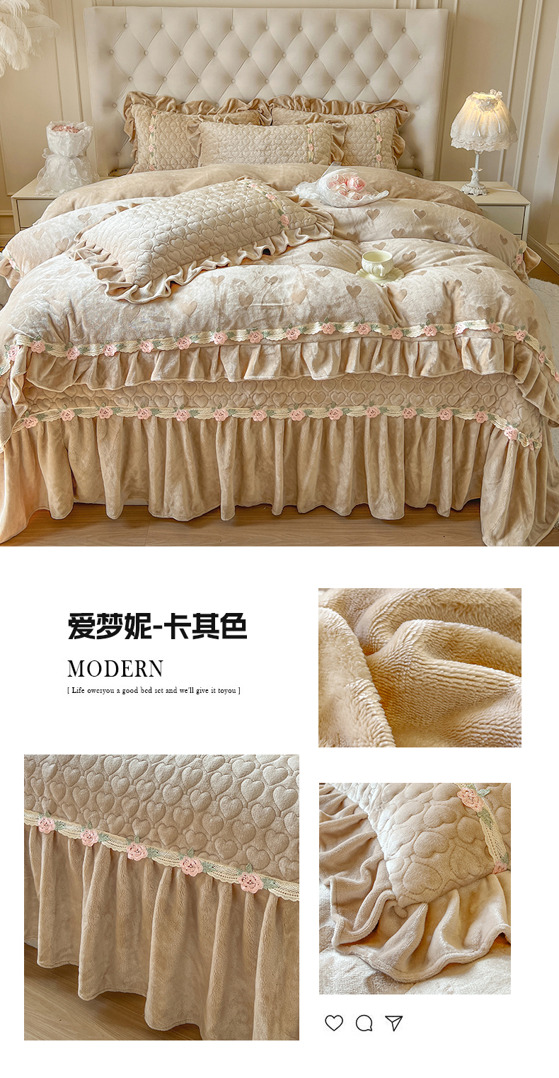 (总)瑞宝 2025新款雕花牛奶绒花边夹棉床盖四件套-莫妮卡,奶昔白,抹茶绿,奶茶咖,少女粉,雾蓝