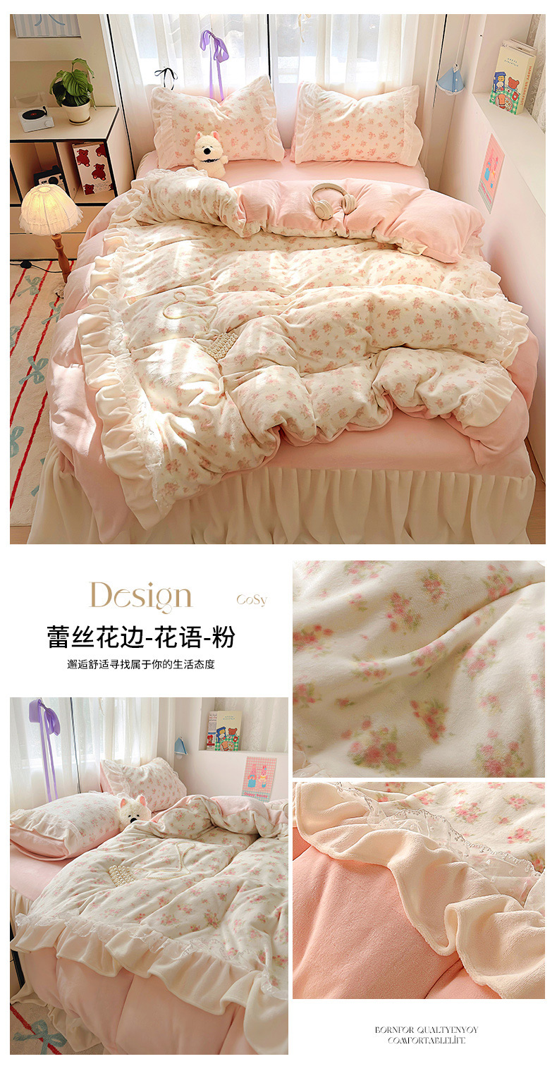 当前位置: 91家纺网 > 商品网购 > 床品套件 > 四件套 > 牛奶绒四件套 > 山茶家纺 2024新款高克重牛奶绒印花花边四件套-场景二 蕾丝花边-花语-粉
