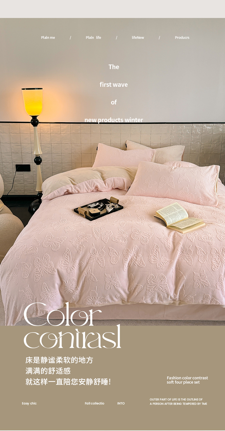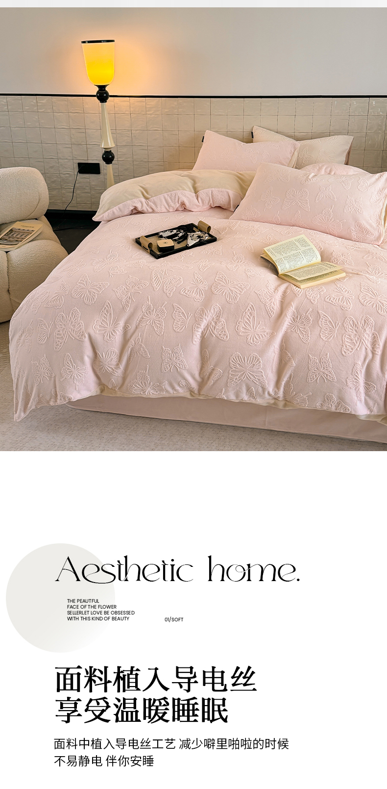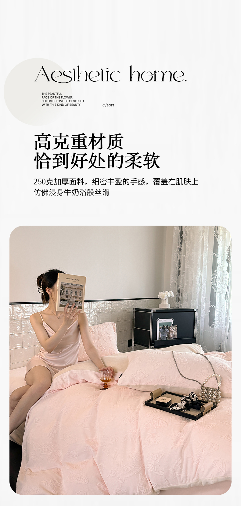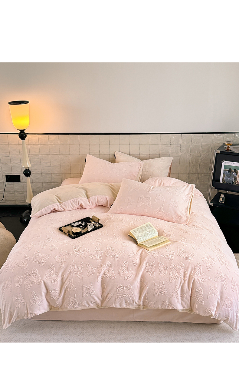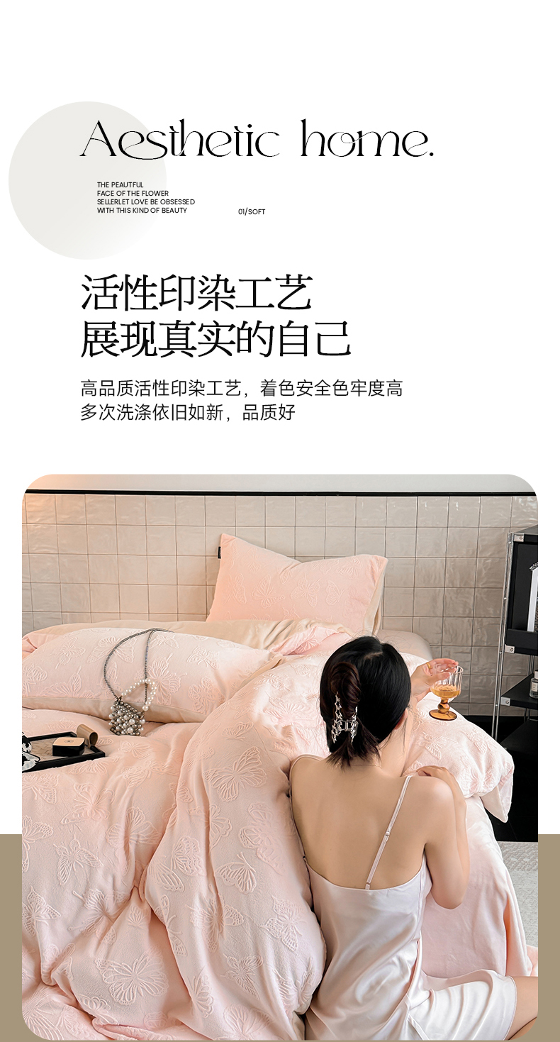 商品名称:若未家居 LOVEWE HOUSE 2025新款AB版250克全消光立体雕花烂花牛奶绒四件套-蝶舞 蝶舞-粉拼米